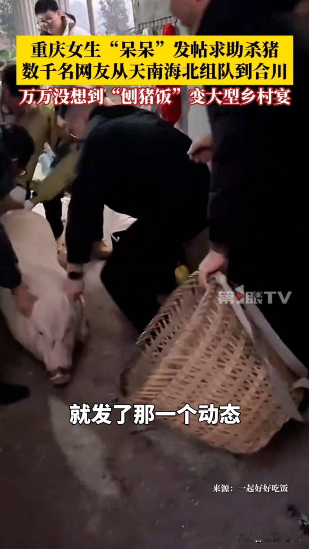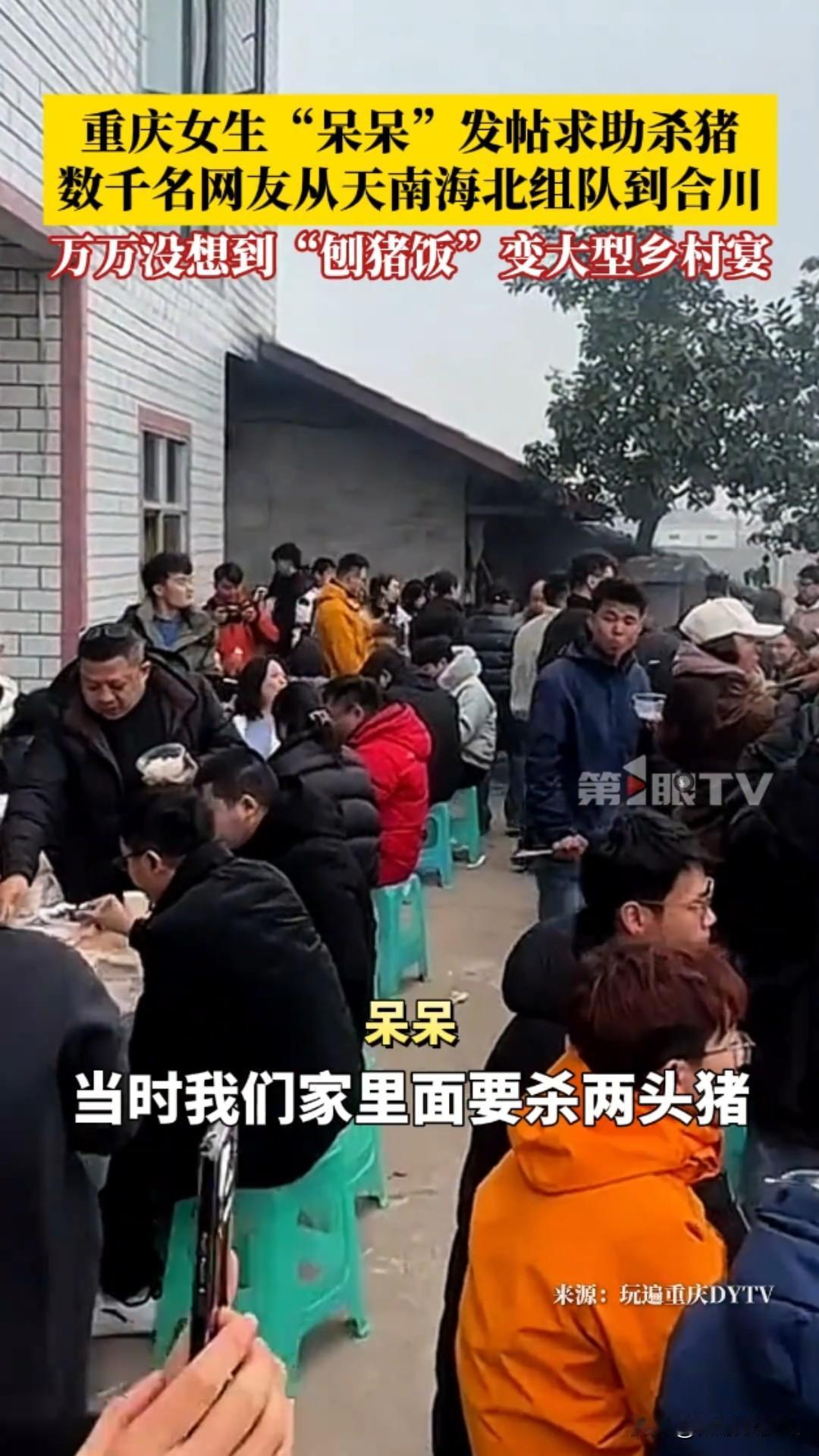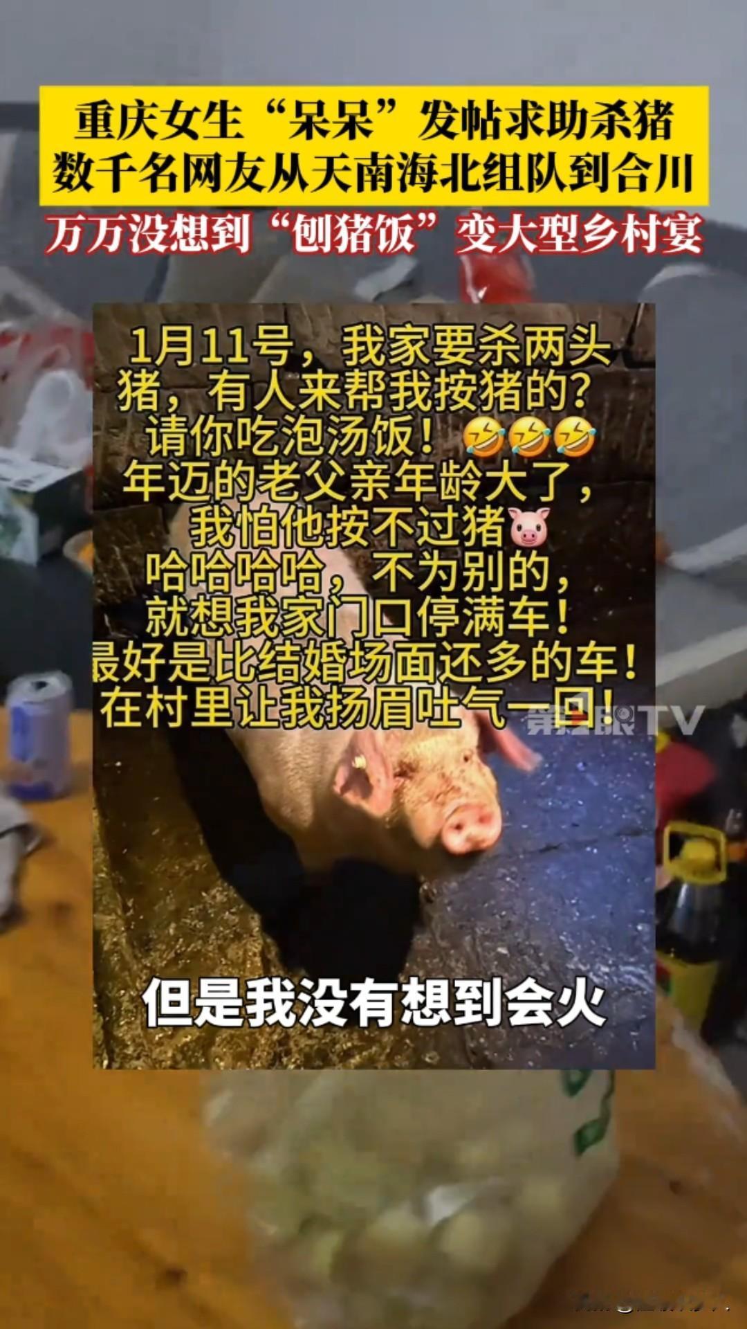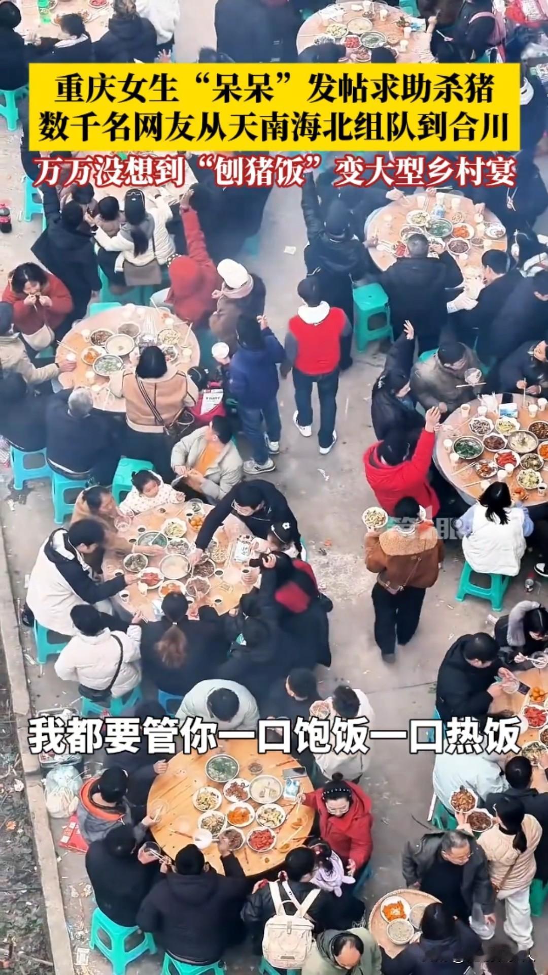惊呆了!重庆合川,2026年1月11日,女生“呆呆”发帖求杀猪帮手,竟引来数千网友跨省赴约,普通刨猪饭秒变大型乡村宴! 一条看似玩笑的求助动态,竟掀起了全网狂欢。近日,重庆合川女生“呆呆”,当时呢我们家里面要杀两个猪,我就想着请我几个朋友来我家里做客。 我觉得朋友好像不是特别多,就发了那一个动态:“有人来帮我按猪吗?请你吃刨汤饭!” 她本只想找几个朋友帮忙杀年猪,顺道在村里“扬眉吐气”一回,却万万没想到,这条动态如野火般蔓延,吸引数千网友从全国各地蜂拥而至。 原本安静的乡村瞬间沸腾。网友们的热情超乎想象——有人驱车千里,有人携带礼品,甚至自带年猪前来助阵;合川文旅部门也送来黑猪支持。 现场车水马龙,人群熙攘,大家挽起袖子一起按猪、烧水、搭灶,欢声笑语中,一场普通的“刨猪饭”演变成了大型乡村体验营。 午餐时分,“呆呆”家的院子摆满了圆桌,坐满了天南海北的陌生人。猪肉飘香,气氛火热,她却直言“不担心猪被吃完,只怕招待不周”。 面对意外爆红,她坚定承诺:“反正不管怎么样,我都要管你一口饱饭一口热饭。”这份质朴的真诚,成了这场宴会最动人的底色。 这不仅是杀猪宴,更是一场互联网时代的温暖奇遇。“刨猪饭”作为乡村传统习俗,象征着丰收与团圆,却在2026年因一次偶然发帖,跨越地域局限,连接起城市与乡村。它让网友体验到质朴的乡村风情,也让沉默的村庄焕发新活力。 “呆呆”或许成了新年第一个“闯祸”的人,但这场意外,却诠释了共享与善意的力量。 在快节奏的当下,一次简单的邀约,唤醒了人们对人情味的渴望。传统习俗在互联网加持下,正以崭新姿态延续,而这,正是2026年最暖的开篇。合川杀猪