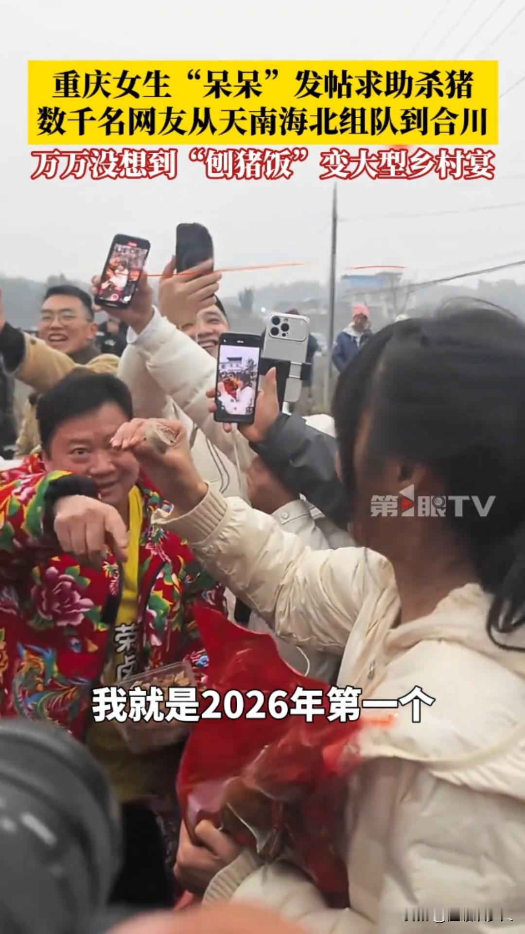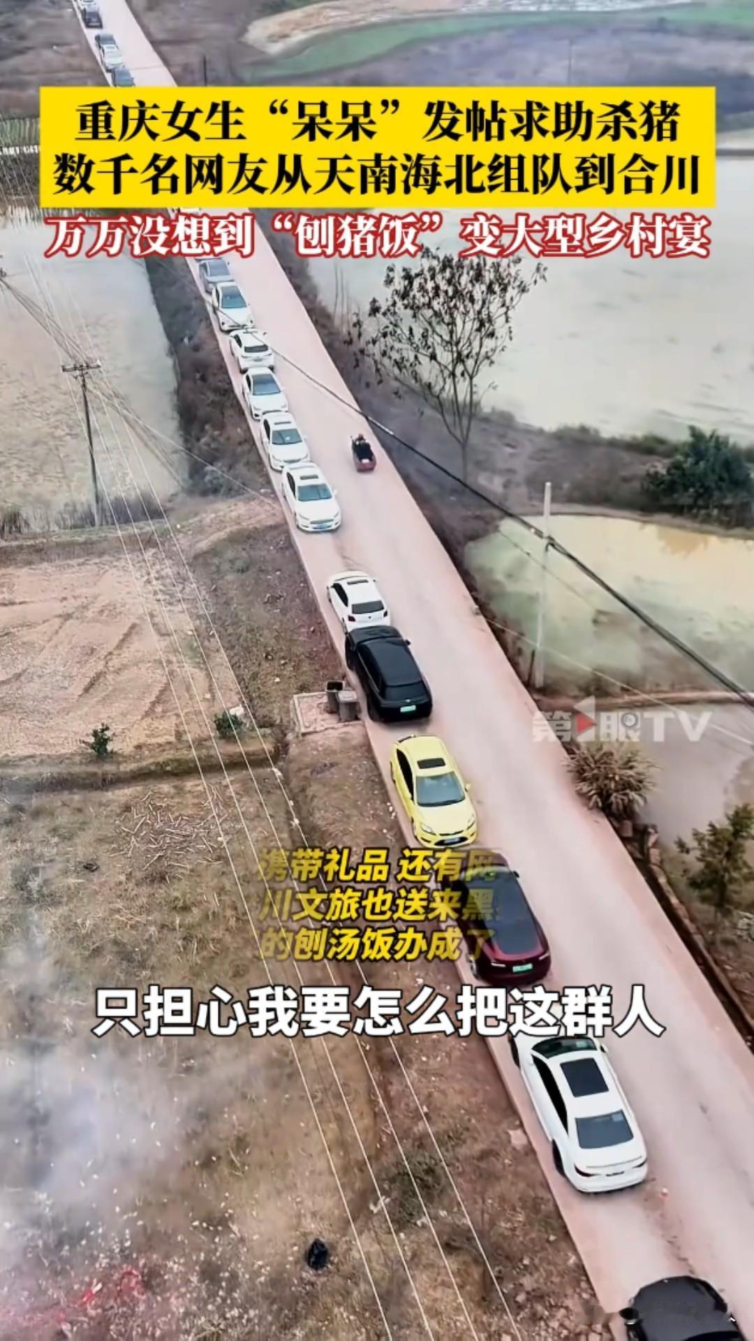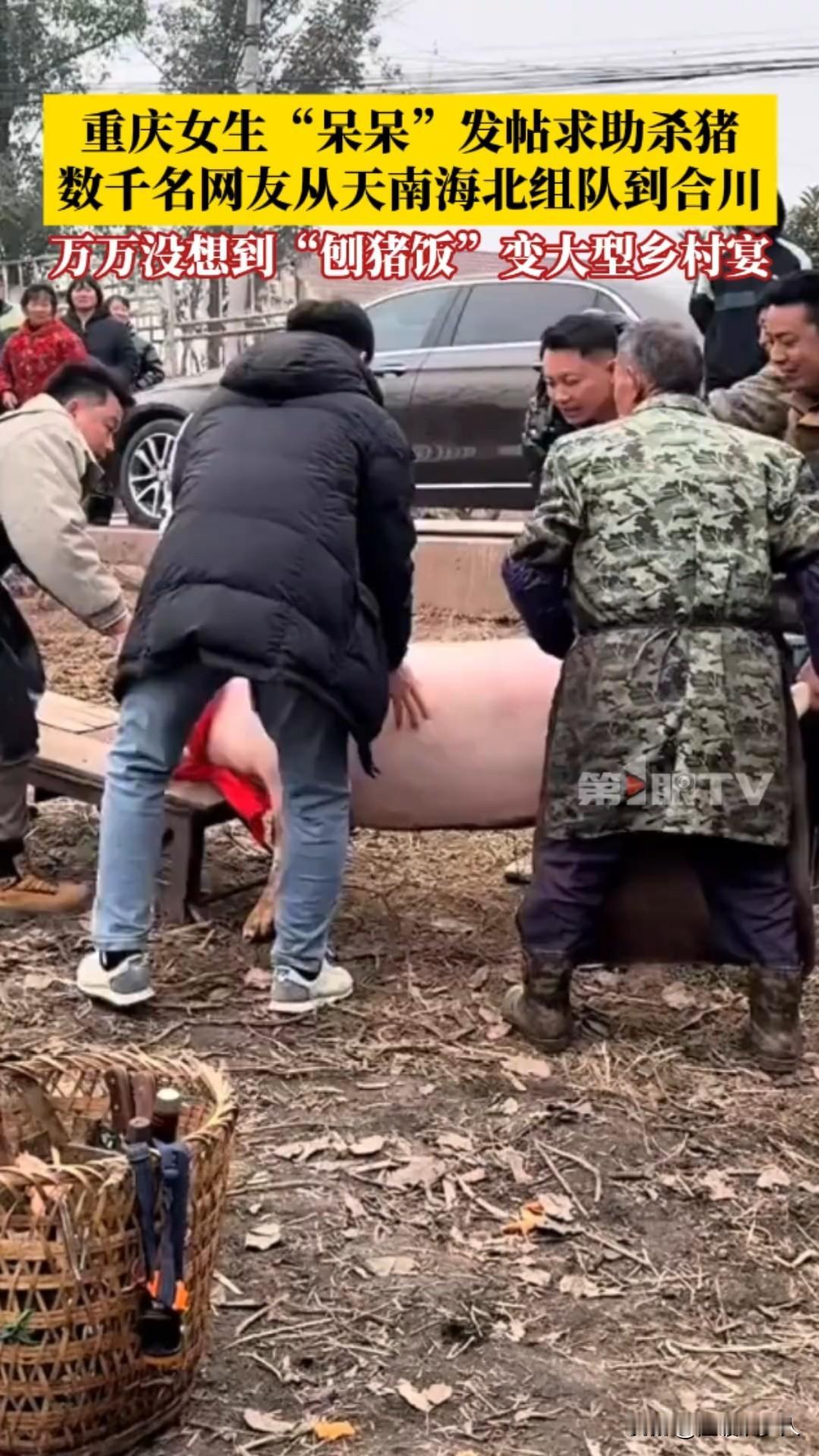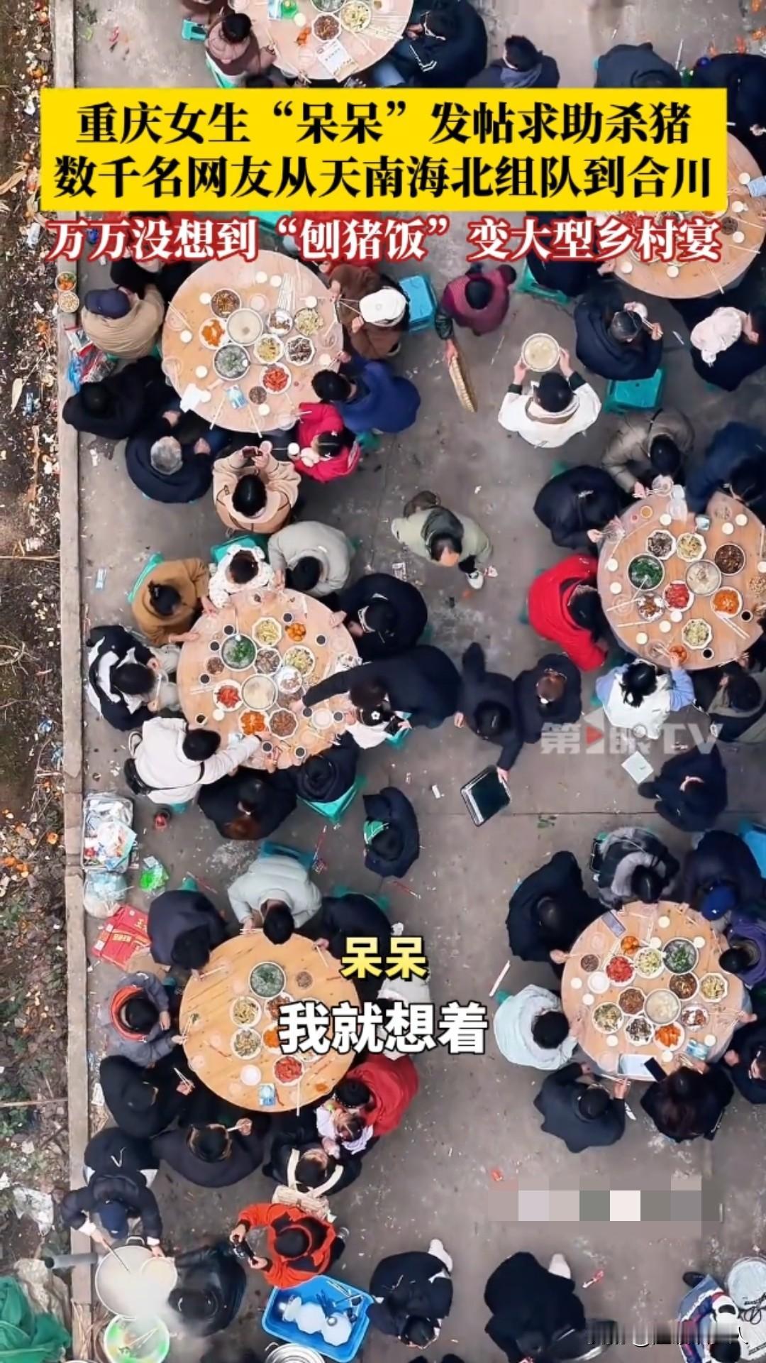 惊呆了!重庆合川,2026年1月11日,女生“呆呆”发帖求杀猪帮手,竟引来数千网友跨省赴约,普通刨猪饭秒变大型乡村宴! 一条看似玩笑的求助动态,竟掀起了全网狂欢。近日,重庆合川女生“呆呆”,当时呢我们家里面要杀两个猪,我就想着请我几个朋友来我家里做客。 我觉得朋友好像不是特别多,就发了那一个动态:“有人来帮我按猪吗?请你吃刨汤饭!” 她本只想找几个朋友帮忙杀年猪,顺道在村里“扬眉吐气”一回,却万万没想到,这条动态如野火般蔓延,吸引数千网友从全国各地蜂拥而至。 原本安静的乡村瞬间沸腾。网友们的热情超乎想象——有人驱车千里,有人携带礼品,甚至自带年猪前来助阵;合川文旅部门也送来黑猪支持。 现场车水马龙,人群熙攘,大家挽起袖子一起按猪、烧水、搭灶,欢声笑语中,一场普通的“刨猪饭”演变成了大型乡村体验营。 午餐时分,“呆呆”家的院子摆满了圆桌,坐满了天南海北的陌生人。猪肉飘香,气氛火热,她却直言“不担心猪被吃完,只怕招待不周”。 面对意外爆红,她坚定承诺:“反正不管怎么样,我都要管你一口饱饭一口热饭。”这份质朴的真诚,成了这场宴会最动人的底色。 这不仅是杀猪宴,更是一场互联网时代的温暖奇遇。“刨猪饭”作为乡村传统习俗,象征着丰收与团圆,却在2026年因一次偶然发帖,跨越地域局限,连接起城市与乡村。它让网友体验到质朴的乡村风情,也让沉默的村庄焕发新活力。 “呆呆”或许成了新年第一个“闯祸”的人,但这场意外,却诠释了共享与善意的力量。 在快节奏的当下,一次简单的邀约,唤醒了人们对人情味的渴望。传统习俗在互联网加持下,正以崭新姿态延续,而这,正是2026年最暖的开篇。合川杀猪