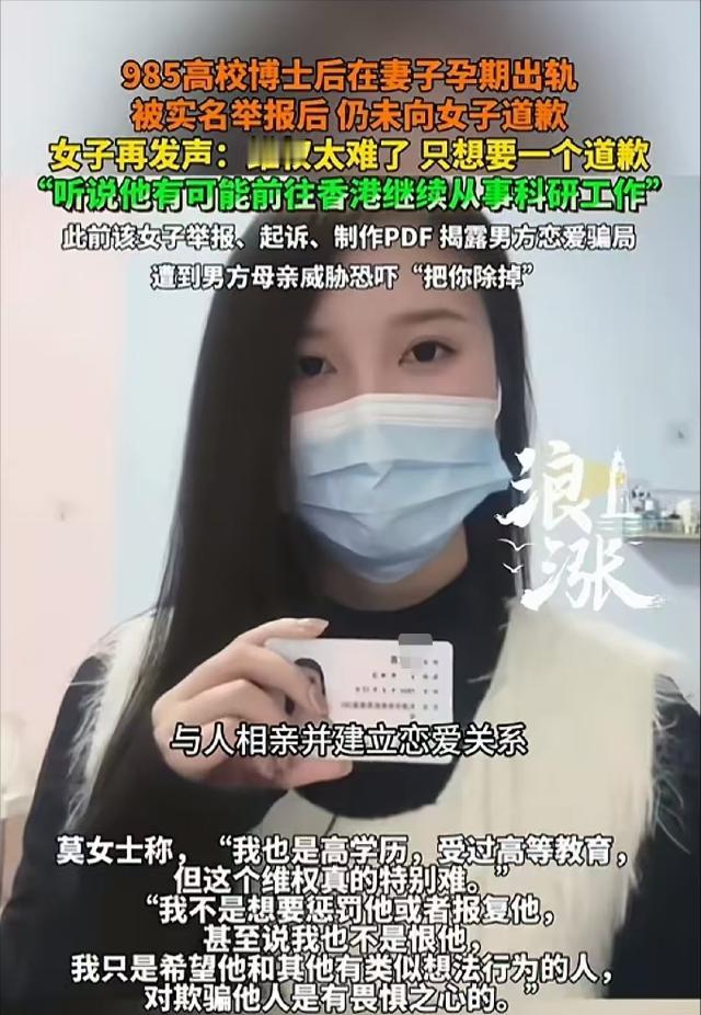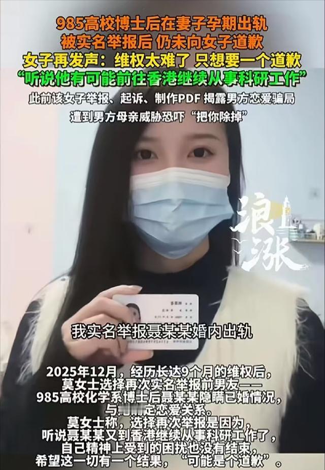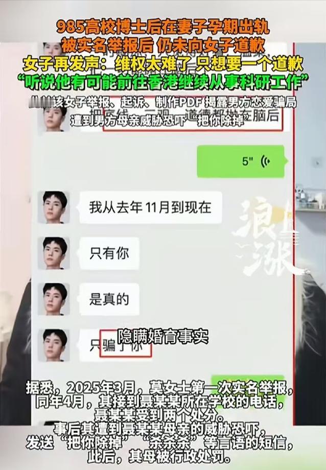 2025年12月的北京,莫女士在长达九个月的维权奔波后,再次手持身份证录制实名举报视频披露事件。与此同时,她已通过法律程序起诉聂某某,诉求对方公开致歉并索赔五万余元精神损害抚慰金。 莫女士以为男友脚踏两只船,假借用他手机买东西,查看男友聊天记录,结果看到男友母亲给他发小婴儿视频。原来男友早就结婚生子,而他备注老板的那个人,竟然是他的妻子!莫女士崩溃了,自己真心找结婚对象,结果成为了插足他人婚姻的第三者! 北京,一位受过良好教育的莫女士,本以为在2024年终于遇见了良人。对方姓聂,光环耀眼:1991年出生,身高一米七八,体重适中,更是顶着985高校博士后、事业单位人员的“高知”头衔。 初识时,这名男子表现得温文尔雅,不仅主动展示诚意,线下见面还细心准备鲜花。两人每周保持着固定的见面频率,一切看起来都像是通往幸福的坦途。然而,这层精英滤镜碎裂的那一刻,却比电视剧还要狗血和残酷。 信任的崩塌往往只在一个瞬间。交往一段时间后,女人的第六感让莫女士察觉到了一丝不对劲,为了验证猜想,她并没有直接大吵大闹,而是找了个借口要用聂某某的手机点外卖。毫无防备的聂某某交出了手机,这潘多拉魔盒一打开,名为“幸福”的假象瞬间灰飞烟灭。 屏幕上跳动的不是外卖进度,而是聂某某母亲发来的一连串小婴儿视频。更令人窒息的是,聊天记录里那个被备注为“老板”的人,言语间全是家常琐碎。真相极其讽刺:这位“老板”,其实是他的结发妻子。 随着线索一点点拼凑,残酷的时间线浮出水面。原来,所谓的“一见钟情”,不过是聂某某在妻子怀孕期间的“闲情逸致”。他坦承只是因为莫女士长得好看、性格温柔,自己才“一时糊涂”。一个正在孕育新生命的家庭,就这样被他当作了猎艳背后的背景板,而莫女士则在完全不知情的情况下,被迫背上了“第三者”的枷锁。 更令人三观尽毁的是事发后的态度。当莫女士不再沉默,选择戴上口罩实名揭露这一切,希望能给试图玩弄感情的人一个警示时,等待她的不是歉意,而是聂家母子疯狂的反扑。 这对母子不仅没有丝毫愧疚,反而多次以性命相威胁,甚至还要在莫女士家门口蹲守报复。虽然警方介入后,其母因干扰他人生活被处以200元的罚款,但这种隔靴搔痒的代价,似乎并没有让他们学会敬畏。 甚至有声音指出,这种在妻子孕期出轨、欺骗未婚女性的行为,简直就是道德沦丧,放在过去怕是要被贴上流氓罪的标签。不仅是对家庭的不忠,更是对无辜女性尊严的肆意践踏。有些人表面看着光鲜亮丽,内里却早已腐烂,谈恋爱前不仅要擦亮眼,甚至连对方身边的朋友都未必可信,毕竟“男人帮男人打掩护”的戏码并不鲜见。 聂某某最终为自己的荒唐付出了代价,根据相关规定,他受到了记过和取消评优的处分。但这对于深受重创的莫女士来说,远远不够。焦虑、抑郁、甚至产生极端的念头,这些精神上的折磨无法轻易抹去。 为了讨回公道,莫女士选择了法律途径,起诉要求对方公开赔礼道歉,并索赔精神损失费5万余元。这不仅仅是为了钱,更是在为自己被践踏的真心和名誉,在这个光怪陆离的交友场中,筑起一道最后的法律防线。 参考信息:红星新闻. (2026, 1 月 9 日). 一名女性遭遇已婚 985 高校博士后 “恋爱骗局 ” 后:举报、起诉、制作 PDF……[新闻报道]