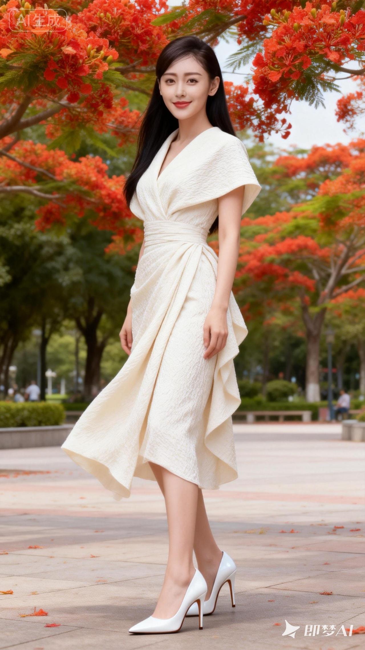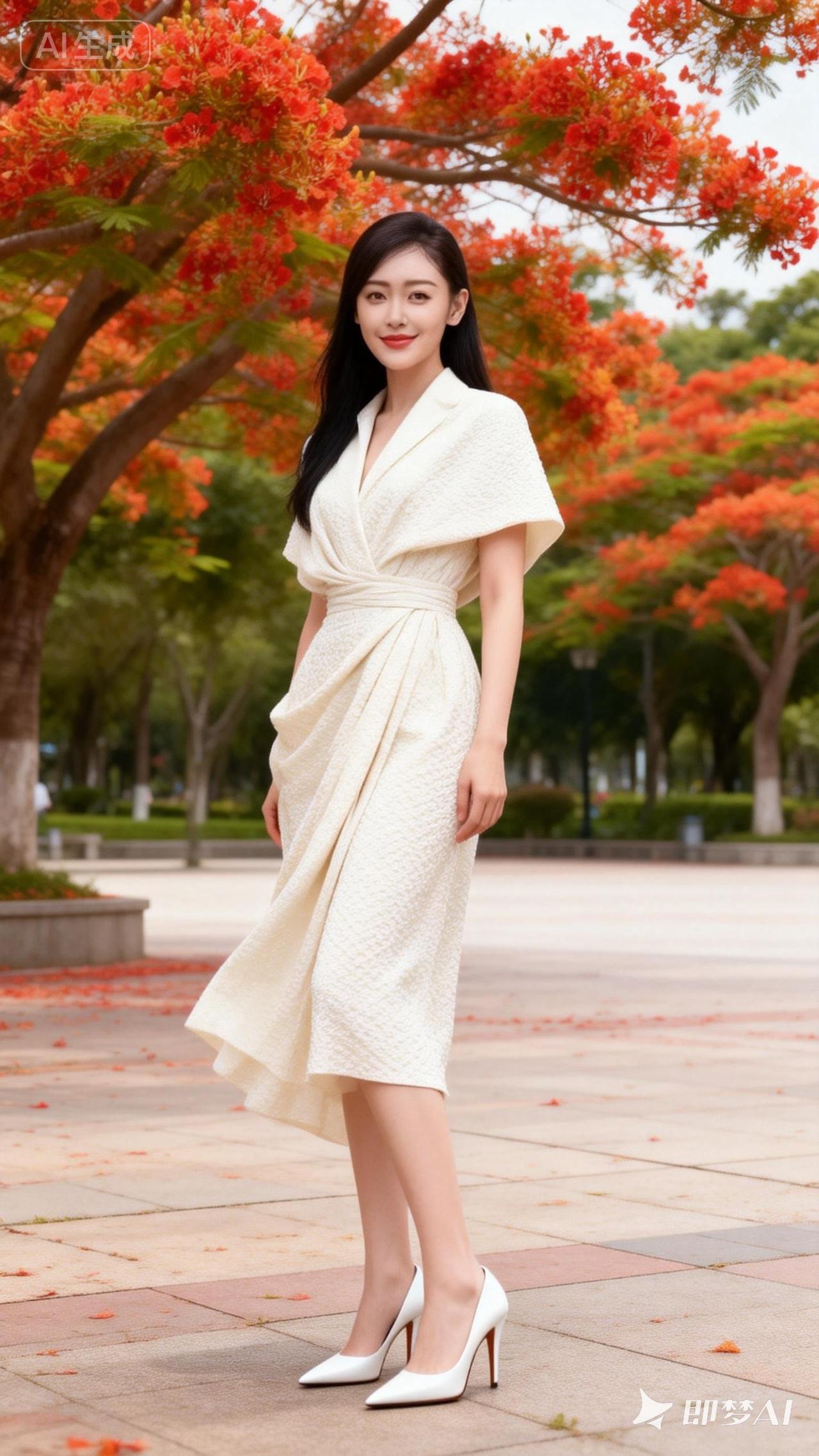 优雅漫步在秋日公园,红叶与白裙相映成趣。