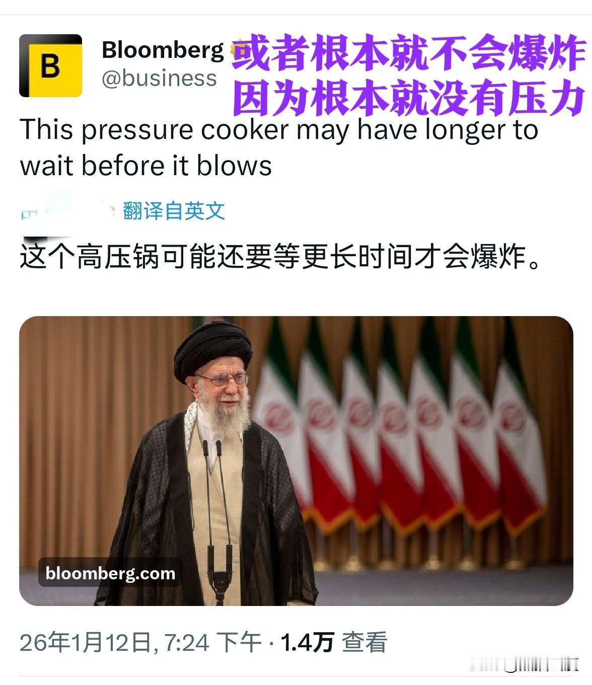 咦好像和西方媒体说的不一样啊? 伊朗德黑兰的200多万人,在今天伊朗各大小城市伊朗人出来表达对哈梅内伊的支持好后,也涌到市区中心表达支持,并谴责暴徒的恶行。伊朗总统马苏德·佩泽什基安以及伊朗外长,均出现在了德黑兰今天两百万人大游行中。 西方喉舌之一的彭博社见状不妙,最新发文:【看来伊朗目前还不会从内部爆发,高压锅还撑得住】。哈哈哈