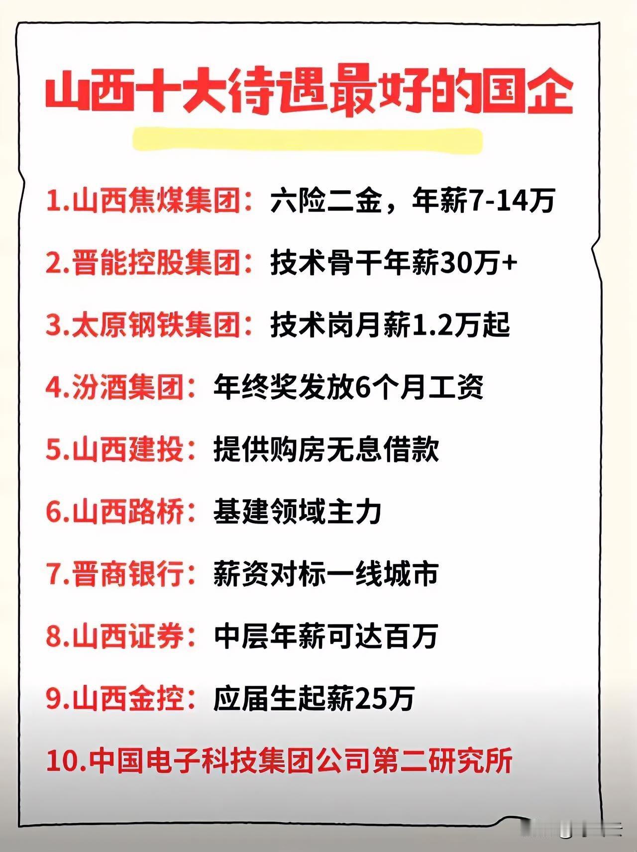 求职秘籍!山西省国企岗位薪酬待遇排行榜前十名揭秘!差距太大了,避坑攻略干货!旱涝不均,有的岗位是稳定穷,有的确是稳定福利好!山西焦煤集团,六险二金,平均年薪7~14万!晋能控股集团核心骨干年薪30万+!速速收藏起来备用!你觉得有哪些企业薪酬待遇非常好,福利待遇怎么样?欢迎评论区留言交流讨论相关话题!速速围观揭秘详细内容![招财进宝][招财进宝][烟花][烟花] @叮咚云—将持续为你分享最有价值的行业洞察,提供志愿填报、就业咨询、职业规划经验指导![来看我][比心][比心] 免责声明:图片来自网络,仅供参考 山西考公