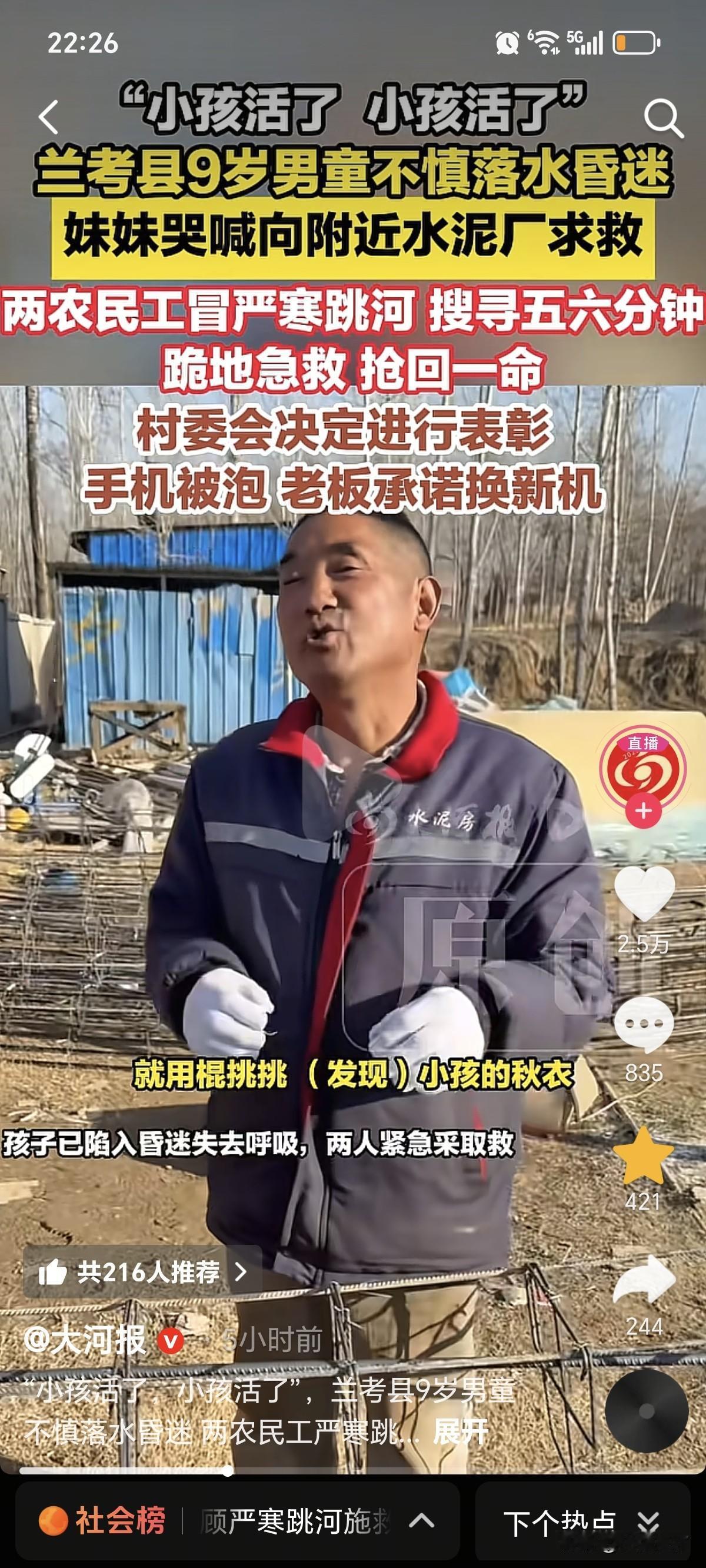 图片中,这位老实憨厚的大叔,就是救人英雄!若不是他急中生智,想出一个好办法,或许真的就没命了[流泪]。 因为当时赶到河边,9岁男孩已经沉底,从岸上看,无法判断到底在什么位置,时间就是生命,怎么办呢? 如果光靠人下去摸,百之百能找到,但需要很长时间。况且,他妹妹喊人帮忙,来回路上已经耽搁一些了。 最后决定,找了一个长长的竹竿,下去之后,边走边在水下面挥舞,正好触碰到了秋衣,于是赶紧过去营救,这还找了5分钟呢,哎,估计要是在晚一点,由于缺氧,真的没命了。 好人有好报,村长给申请见义勇为奖,老板给换了新手机,并单独给一笔钱。 这不马上过年了,等大叔走亲访友聚餐时,也会被频繁敬酒,不是因为工资高,而是干了一件好事[捂脸]。 事件发生在1月11号,河南兰考。