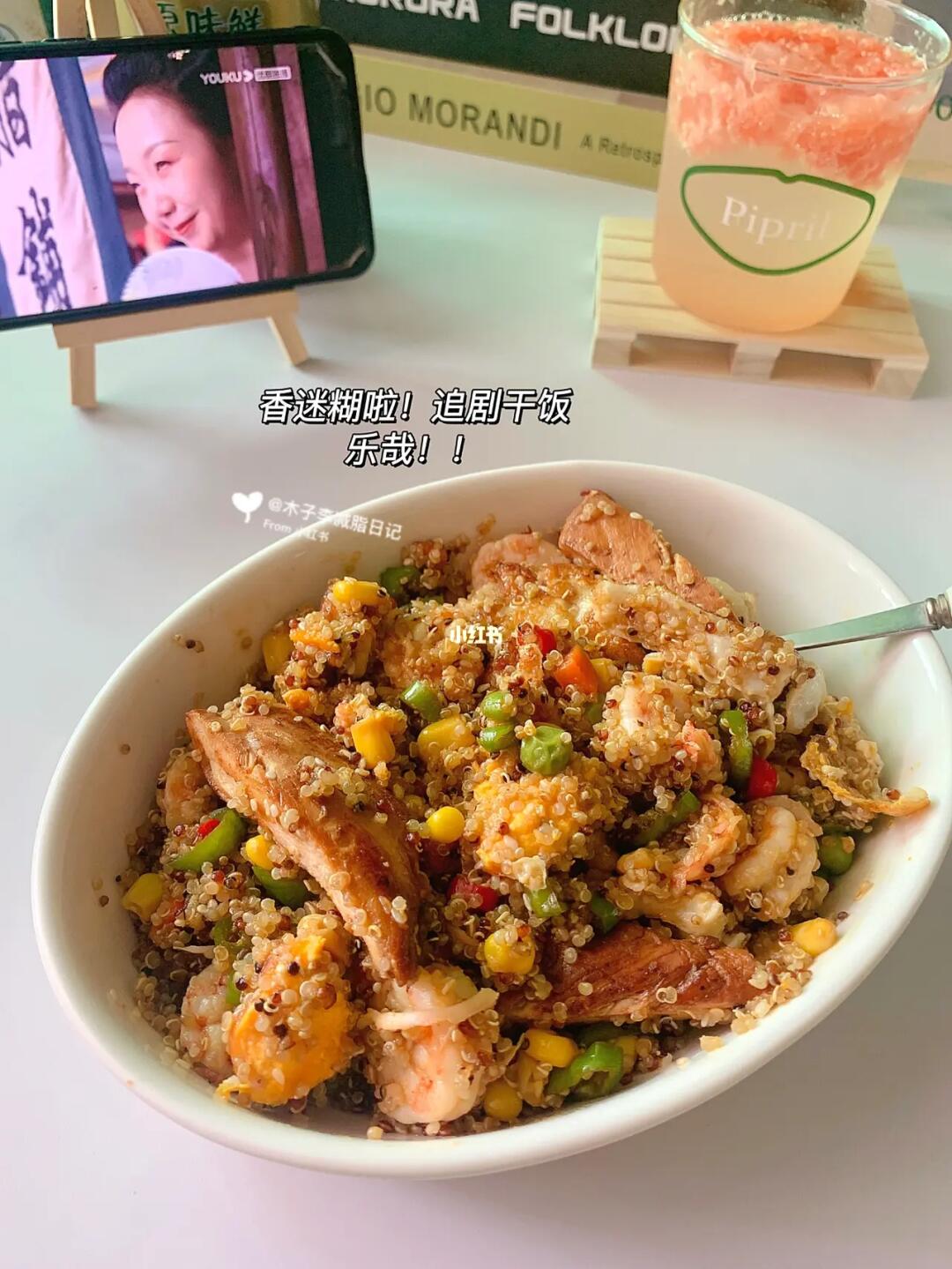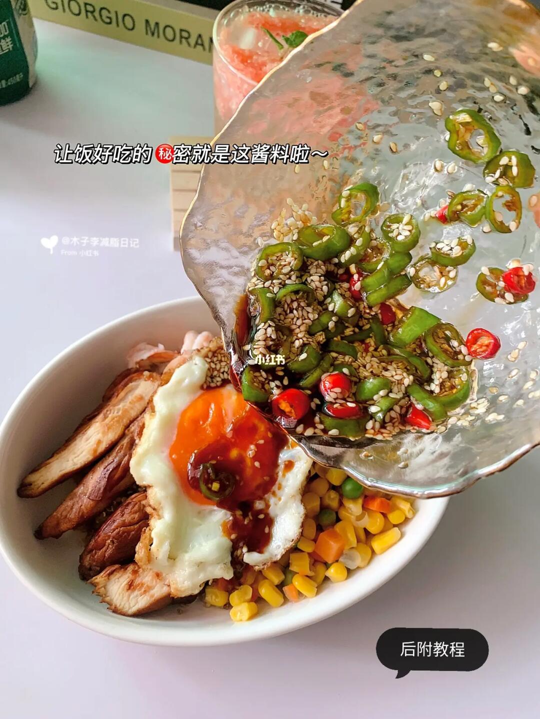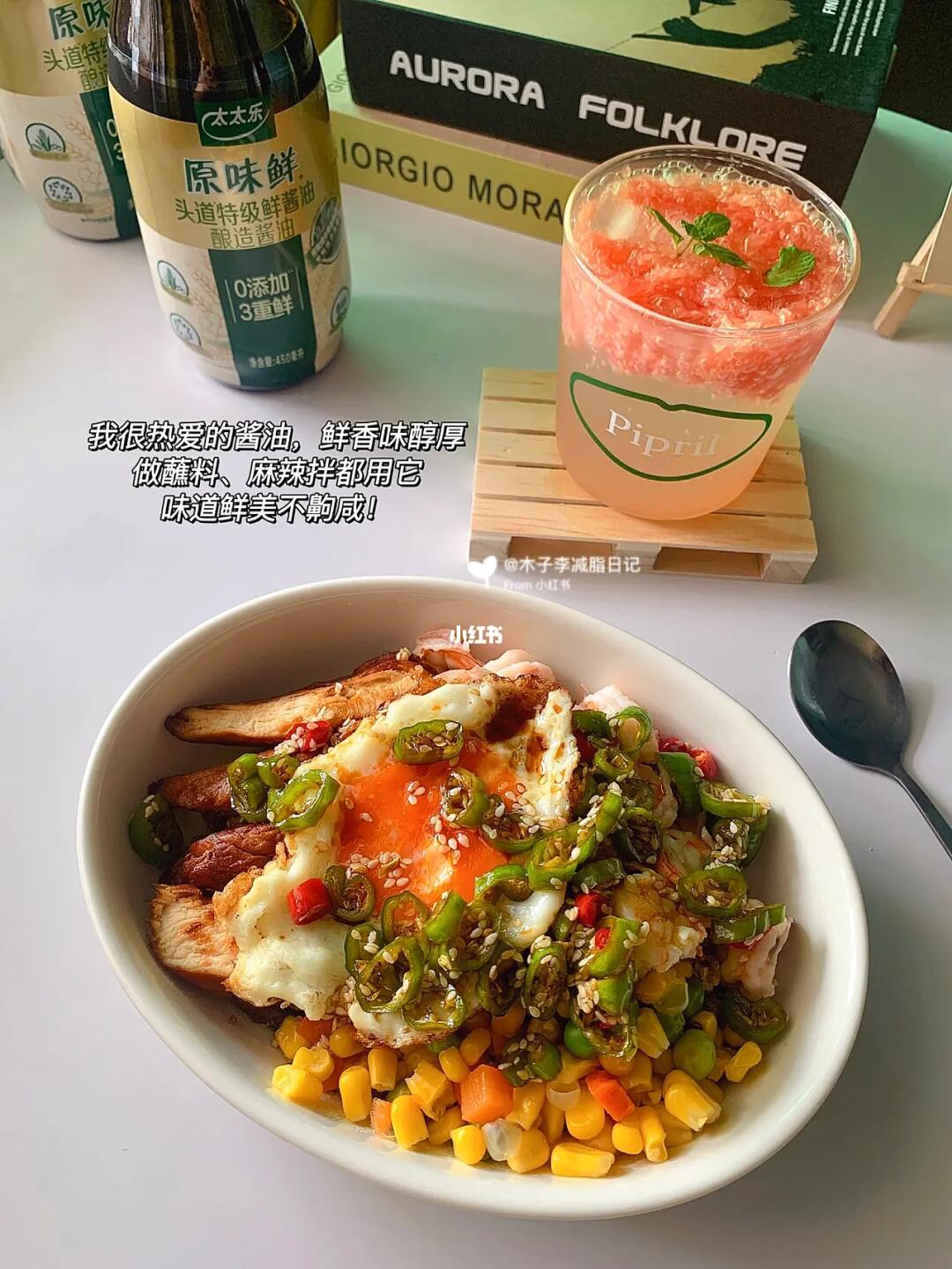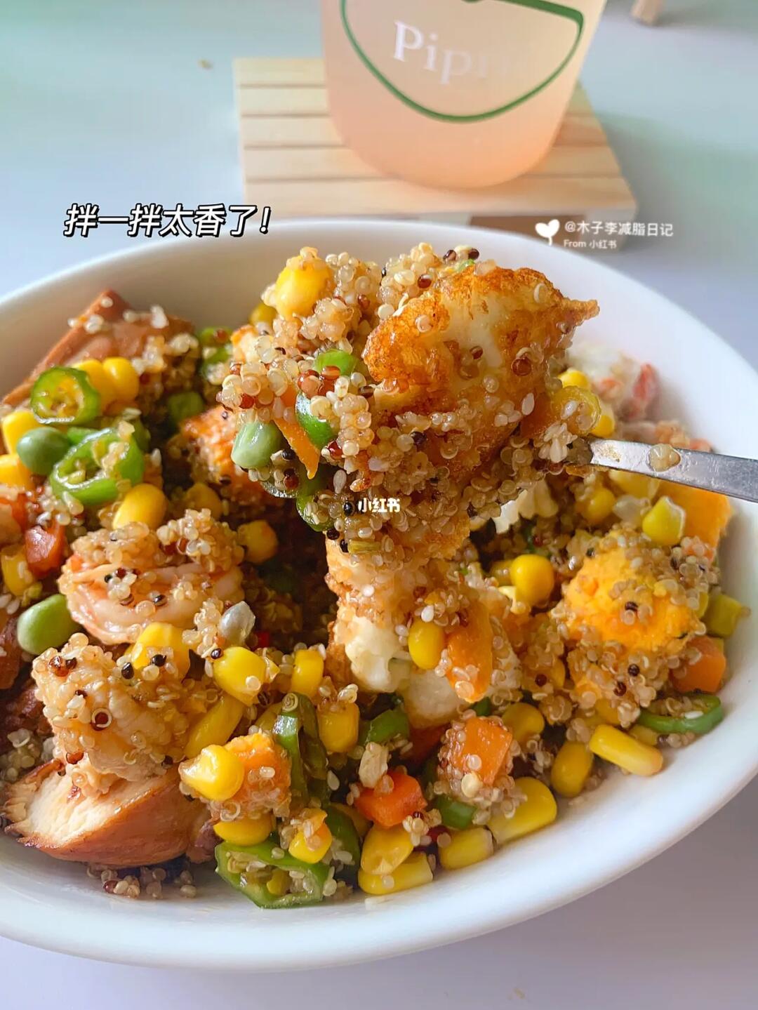 藜麦饭 线椒 小米辣 杂蔬玉米粒 无菌蛋 虾仁 鸡胸肉 酱油蘸料