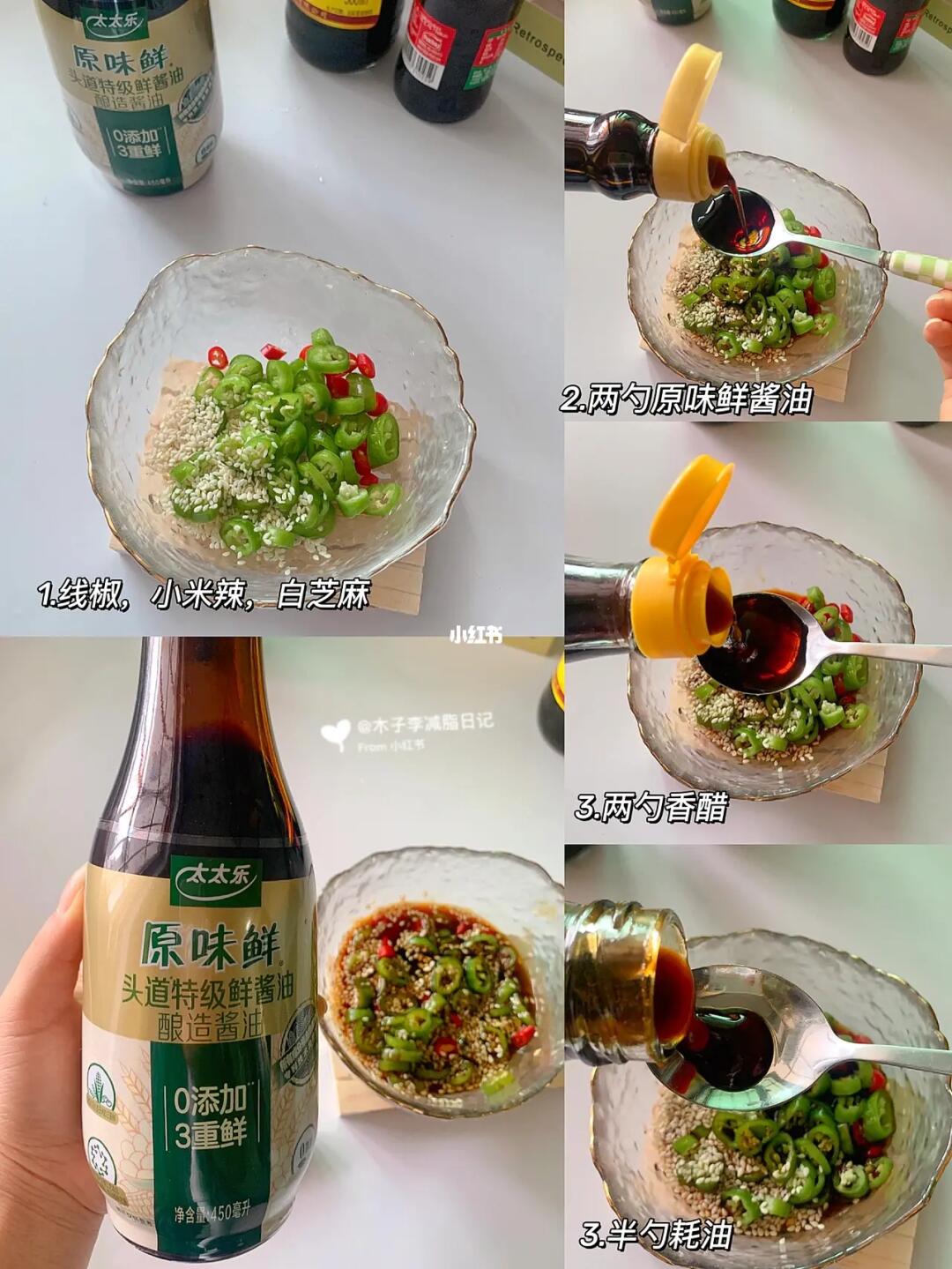 3️⃣酱油蘸料:小米辣,线椒,白芝麻,加2勺太太乐原味鲜酱油,2勺香醋、半勺耗油、最后浇上热油~
