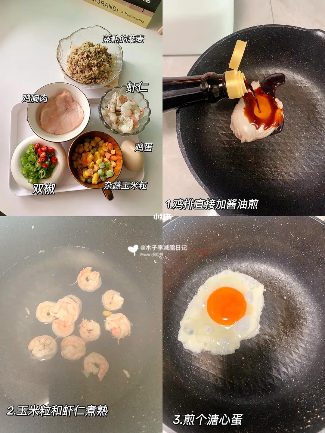 1️⃣杂蔬玉米粒 虾仁煮熟 鸡胸肉放酱油煎熟 煎鸡蛋