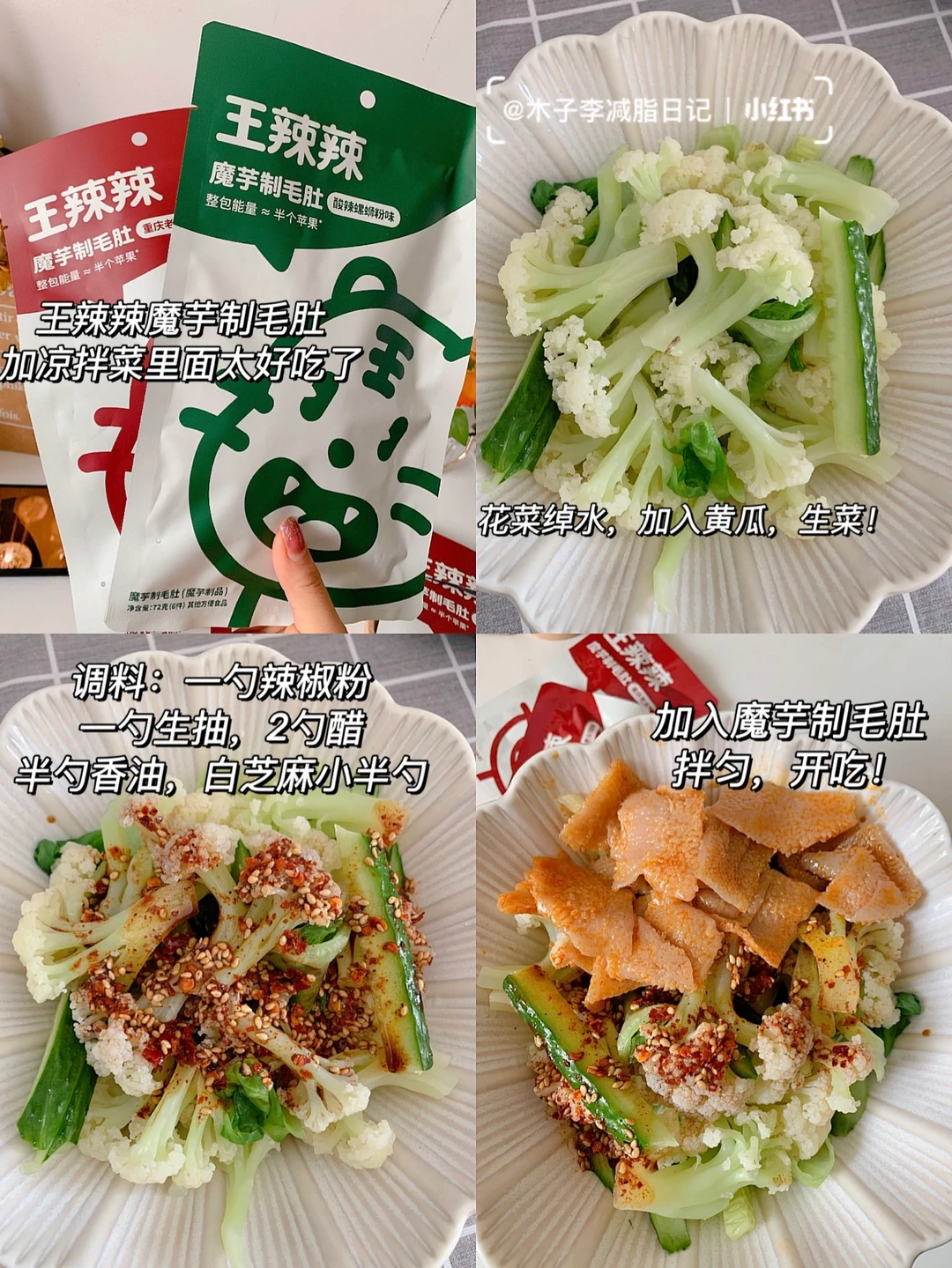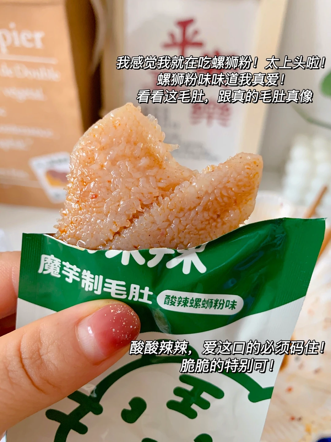 📣:吃凉拌菜加上魔芋做成的毛肚,辣辣的太过瘾啦,好吃极啦!毛肚Q弹脆爽!口感跟真的毛肚没差呀,热量还低一袋也就9卡!跟没吃一样~减脂期吃也不怕!美味又健康!酸辣螺狮粉味的一定要尝酸酸辣辣的!我好爱这口!太上头了!