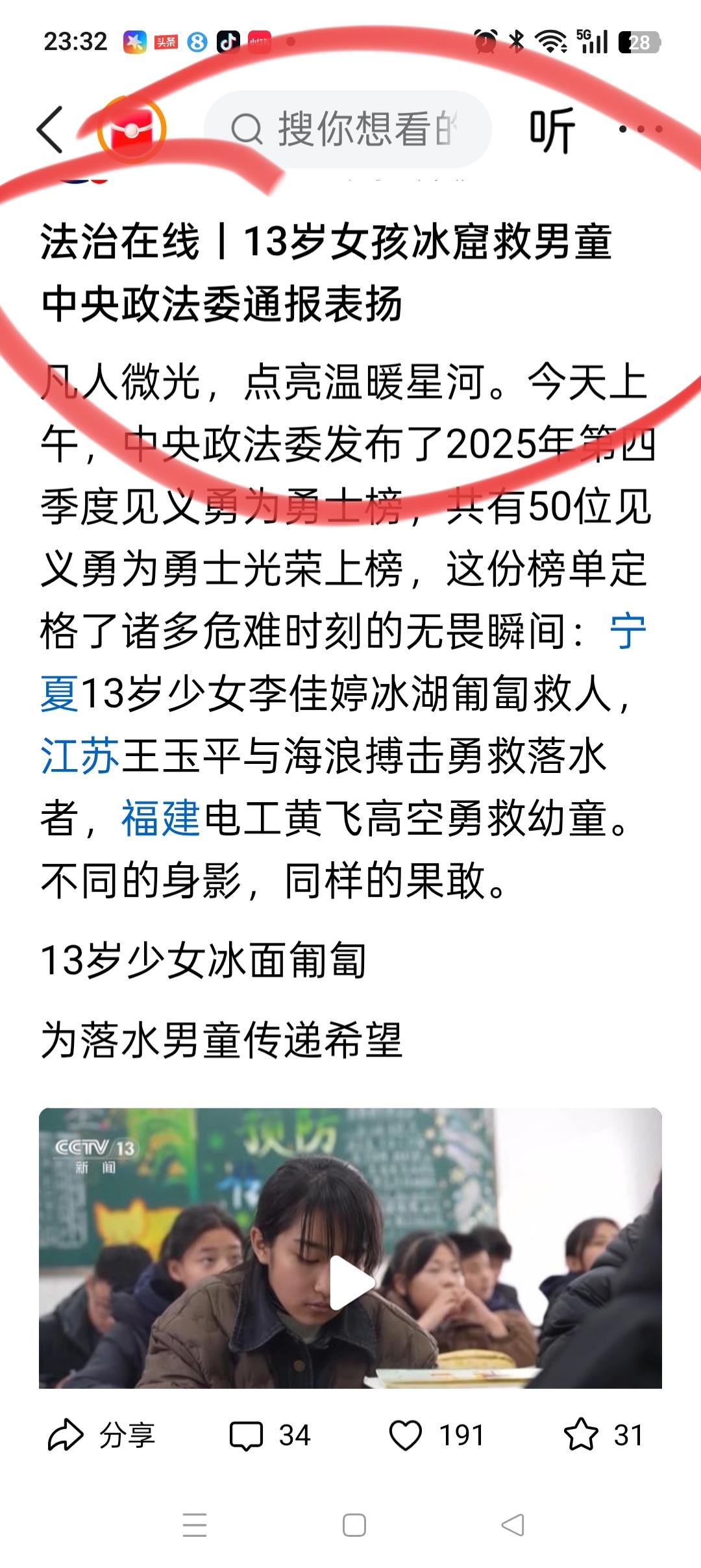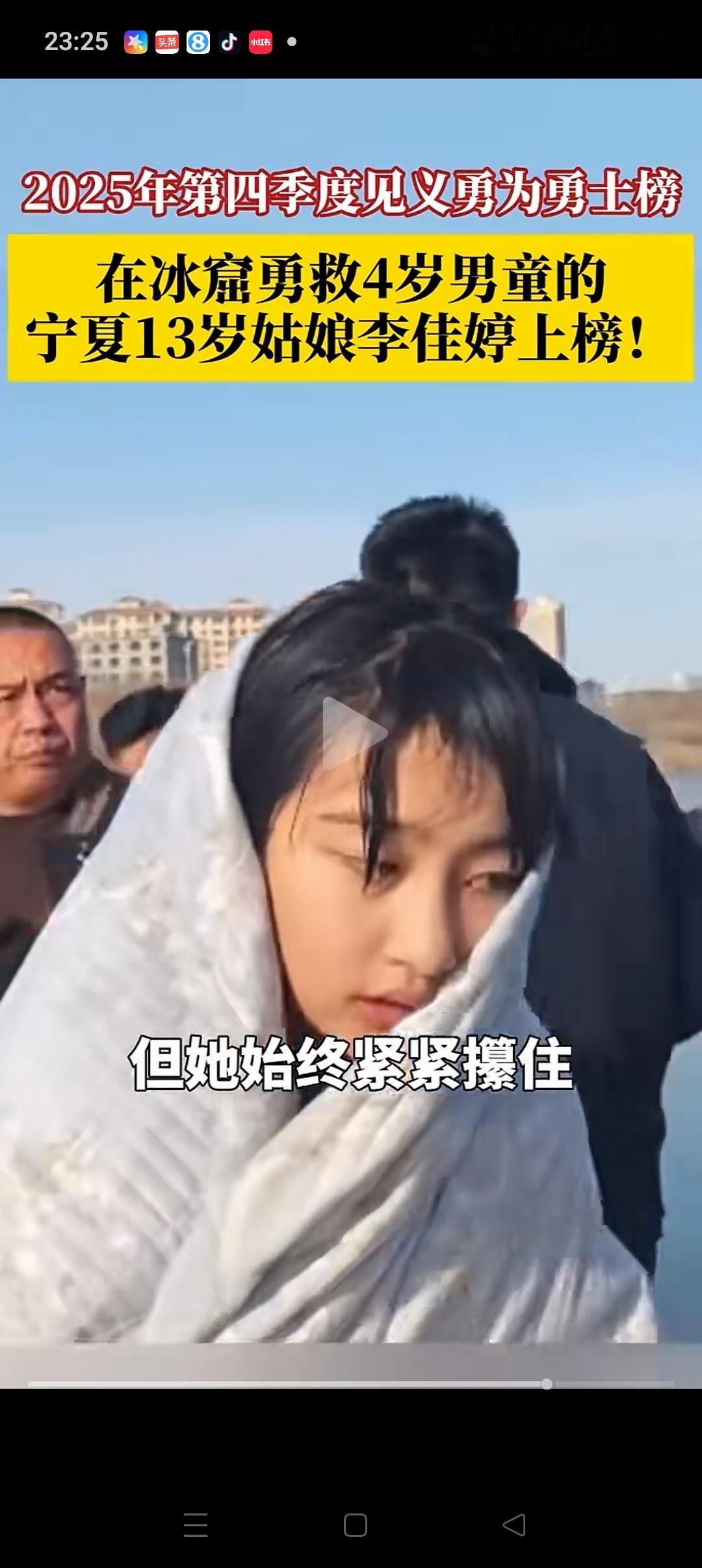 13岁女孩李佳婷下冰面救人, 最好的回报来了![玫瑰] 不是那单单的2万元现金奖励,也不是那“见义勇为先进个人”的称号! 而是: 得到了中央政法委的认可!被正式列入2025年第四季度见义勇为勇士榜 ! 这一次入围的有49人,来自不同的地区,都是在危难时候挺身而出,见义勇为的好人。 李佳婷虽然年纪不大,但是她勇敢善良,乐于助人,谦虚谨慎的品质,已经感动了所有人! 她就像一道光,照亮了中国所有的青少年,给他们树立了好的榜样。 未来我们也会涌现出越来越多这样的青少年,必须点赞[赞][赞][赞]
