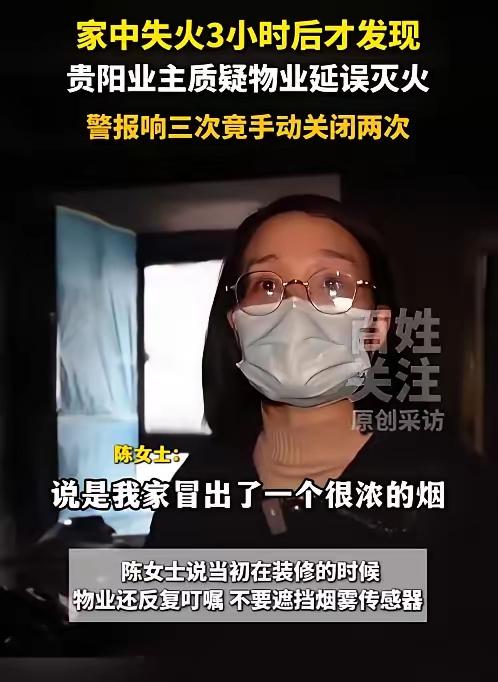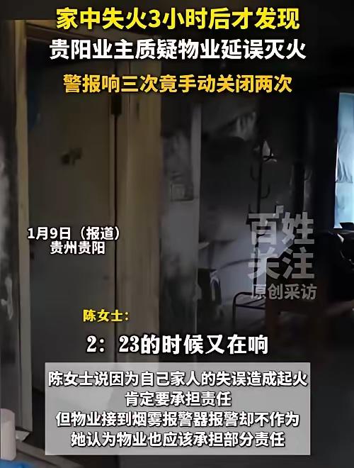 48楼家被烧精光!老人忘关电炉引发大火,物业竟两次关掉烟感器报警,4小时后才通知业主 真的太气人了!贵州贵阳陈女士家的遭遇,看完谁都得替她喊冤。 陈女士家住小区48楼的超高层,当初装修时特意没动开发商装的五六个烟感器,就怕改动消防设施担责。可谁能想到,真出事的时候,这烟感器却差点成了摆设。 事发当天上午10点多,家里老人用小电炉热东西,之后转身去隔壁楼看孙子,把关电炉的事儿抛到了九霄云外。没人看管的电炉最终引燃了周边物品,大火很快烧了起来。 下午1点多火灾就已经发生,烟感器也很给力,在1点46分、2点23分、2点44分接连三次报警。可离谱的是,前两次报警竟然都被物业工作人员手动关掉了! 直到下午4点多,陈女士才接到物业的电话,说家里着火了。等她火急火燎赶到家,火虽然灭了,但三室一厅的房子已经被烧得漆黑一片,家具损毁严重,损失惨重。 更让陈女士崩溃的是,她去找物业讨要说法,对方全程回避问题,还趁乱想把她家的烟感器全拆了,明显是想销毁证据,还好被她及时阻止了。 其实明眼人都能看出来,老人忘关电炉是起火的直接原因,肯定要承担责任。但物业的操作更是让人无语,烟感器报警就是火情预警信号,物业不核查情况反而关掉报警,还延迟几小时通知业主,这妥妥的是失职! 根据法律规定,老人过失引发火灾,即便不构成犯罪,也可能面临拘留和罚款;而物业怠于履行消防安全管理职责,不仅要承担相应的民事赔偿,还可能受到行政处罚。 现在陈女士已经决定走法律途径维权,希望她能早日讨回公道。这事也给所有小区提了个醒,消防安全真不是儿戏,不管是业主还是物业,都得绷紧这根弦! 来源:百姓关注