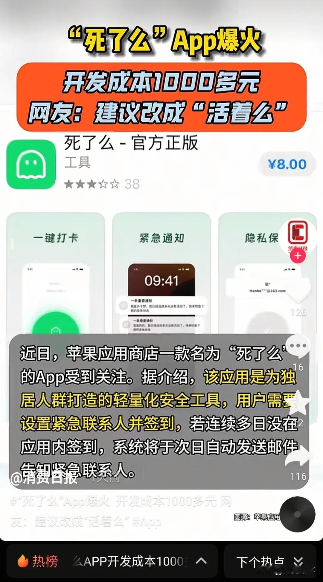 死了么app是新华电脑学校的三个技校生搞出来的。 郑州这次上了全球热搜,并且出了一个在苹果手机付费商店占据榜首的软件,但是我感觉总有那么点不对的味道。 第一,这个软件名字怎么审核通过的, 第二,这个软件的功能很有引导作用,他是否应该加个年龄限制 第三,安卓用户怎么办,难道安卓用户不配有几个紧急联系人吗,老年人大多数不是用安卓手机吗 第四,有内么一丝丝嘲讽的意思,而且是高级的嘲讽。
