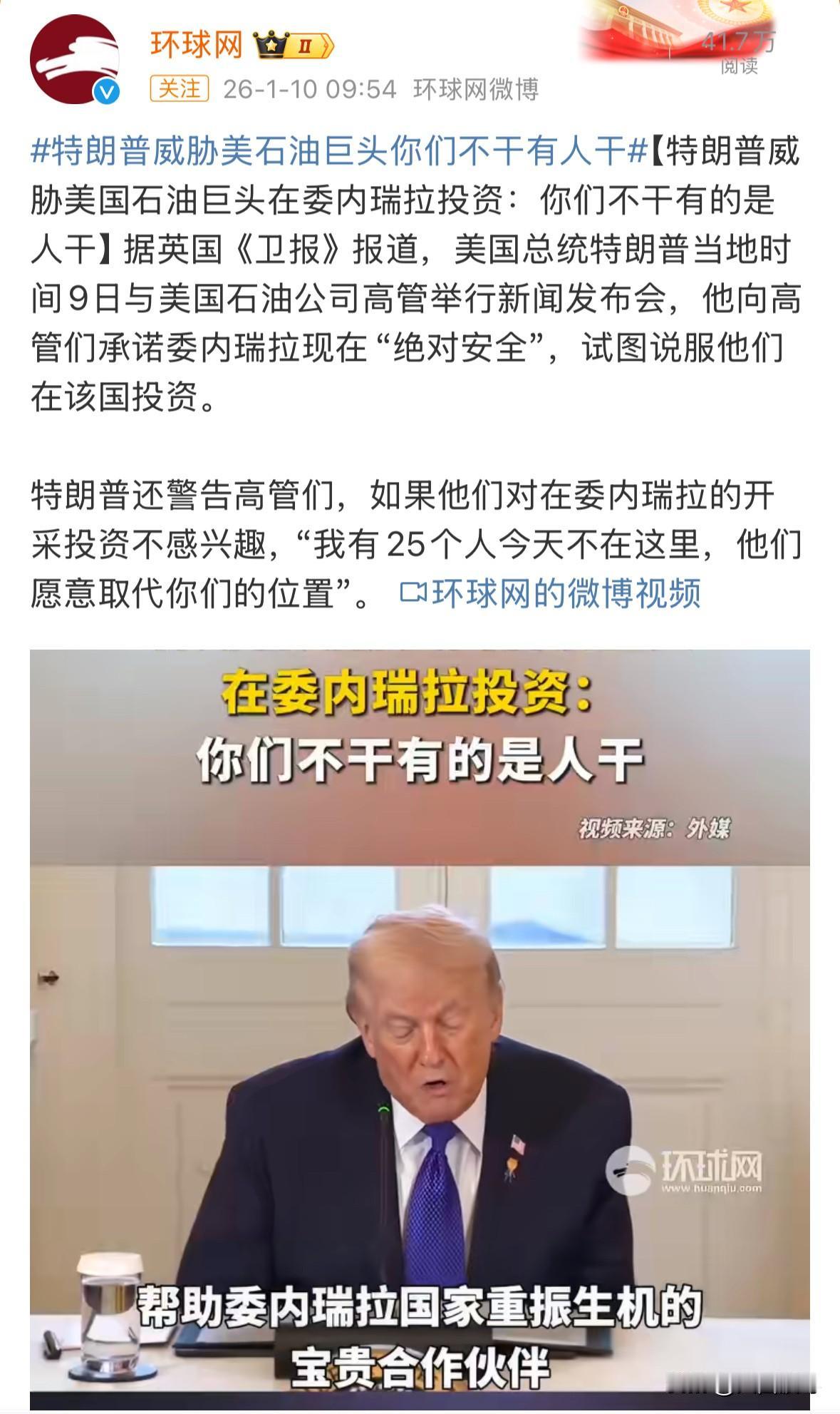 白抓了,特朗普很生气,表示不你们愿意做,有的是人做,谁都知道,特朗普为了委内瑞拉的石油,抓了马杜罗,可是抓完马杜罗,委内瑞拉表示愿意和美国合作开采石油以后,美国那些石油公司经过评估,发现开采委内瑞拉石油成本太高,说白了就是不赚钱,所以美国石油公司表示不愿意去委内瑞拉投资,结果特朗普很生气,好不容易抓了马杜罗,结果美国公司却不配合,等于特朗普白抓了,换谁都生气。