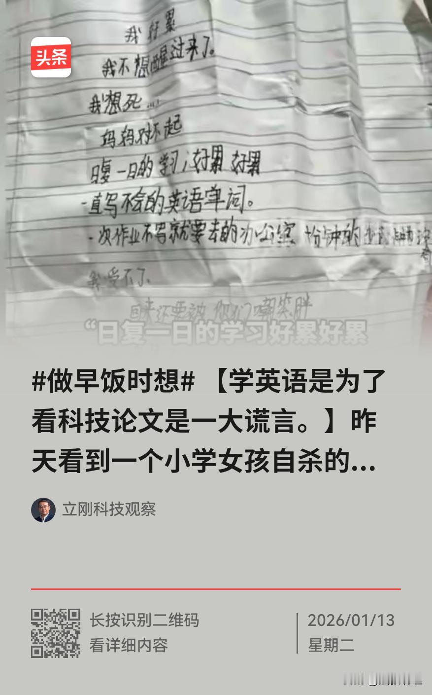 几个英语单词就逼死一个孩子,这教育到底是育人还是毁人?! 直击教育痛点 作为两个娃的父亲,每次撞见这样的新闻,都忍不住一遍遍追问:到底是哪里出了问题? 项立刚和一些教育大 V 说要降低英语考试权重,理由是 99% 的人一辈子都用不上英语资料。这话听着有些偏颇,却也戳中现实 —— 我们的孩子,正被太多 “大概率用不上” 的知识压得喘不过气。不光是英语,那些“圆锥曲线、抛物线”、“导数”、“热力学第二定律”、“多重反应平衡”、“遗传学定律”,又有多少人会在日后的生活里真正用到?可是,现实是“学不会=人不行”! 因此,压垮孩子的,不是解不出的题、记不住的单词,而是 “成绩至上” 的单一评价体系~是无处排解的挫败感,是无人倾听的委屈,是孩子 “学不会就一无是处” 的冷血逻辑。 本该是帮孩子拆解难题、托举成长的教育,一旦变成用分数贴标签、用淘汰制造焦虑的工具,再小的学习卡点,都可能成为压垮一颗脆弱心灵的最后一根稻草。 [笑哭]我们别再拿“为你好”当借口,英语学不好没啥大不了,孩子没了,就什么都没了! 教育失败的根源 教育通病 教育之弊 英语不及格家长 孩子痛点 英语 你同意取消英语主课地位吗 教育