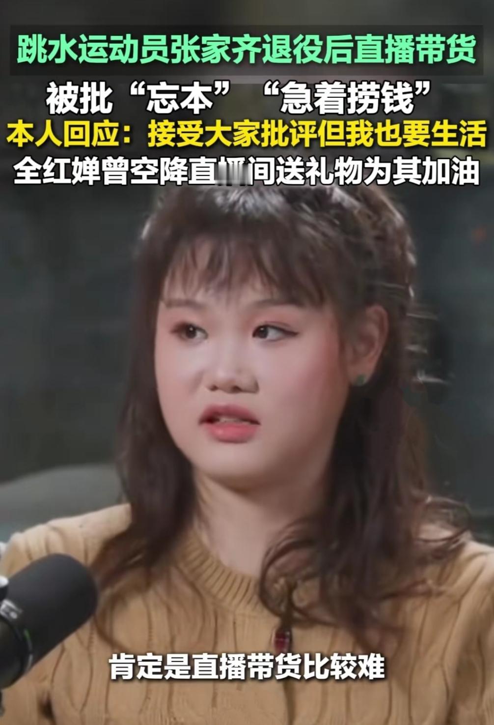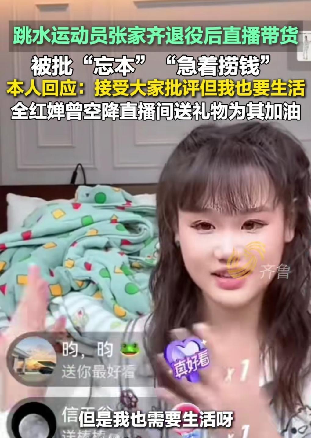 谁能想到,那个把十米台水花压成“隐身术”的奥运冠军,如今对着直播间提词器紧张到卡壳,却被网友喷“急着捞钱”。镜头里她攥着话筒反复看脚本,连商品介绍都磕巴,首场直播观众掉得只剩几百人。 直到全红婵突然空降,满屏礼物直接把直播间顶到热门,弹幕瞬间炸了:“婵宝是把姐姐当小孩护着吧!”可评论区刺人的话没停:“奥运冠军沾带货,也太掉价了。”她攥着衣角没反驳,只轻轻说“我接受批评,但我也得生活啊”。 从领奖台到直播间,她连镜头角度都要学半天,全红婵的礼物是她转型路上最暖的光。有人说她“丢了运动员的本”,有人说这才是普通人的生活。你觉得奥运冠军退役后,该怎么选自己的路?