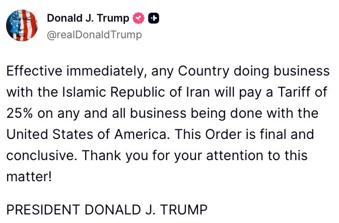 川普今宣布,任何与伊朗做生意的国家,都将被立即(加)征25%的关税。 这是此轮