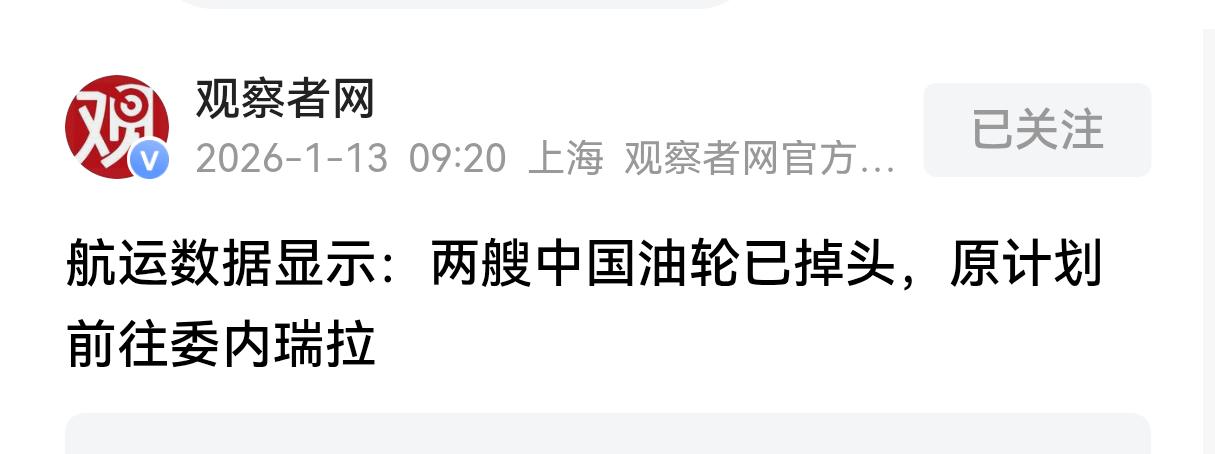 知难而退!两艘中国油轮已掉头,原计划去委内瑞拉运回还债石油 根据观察者网援引路透社一月十二号发布的消息可以得知,两艘悬挂中国国旗的油轮,目前已经调头返回亚洲。而按照原计划,这两艘轮船本应该前往委内瑞拉运回中国和委内瑞拉贸易中委内瑞拉用于偿还债务的石油。而且这两艘船本应该属于一支由三艘超级轮船组成的船队,这支远洋船队主要往返于中国和委内瑞拉的海上航线。在此之前,掉头返回的这两艘船已经在北大西洋停了好几个星期,现在看到美国对于委内瑞拉的制裁措施并没有减弱,在无奈之下才选择返航。 我认为我国的这两艘船的做法是明智的,如果这个时候硬着头皮前往委内瑞拉拉石油的话,极有可能和美国海军或者是美国海岸警卫队爆发直接冲突,如果轮船被扣押的话,损失会继续扩大,实在是得不偿失。而如果长期在北大西洋停靠,同样也不是办法。所以这个时候先返回,做一下其他的运输任务,然后在等待局势的变化是符合商业投资和风险控制的。