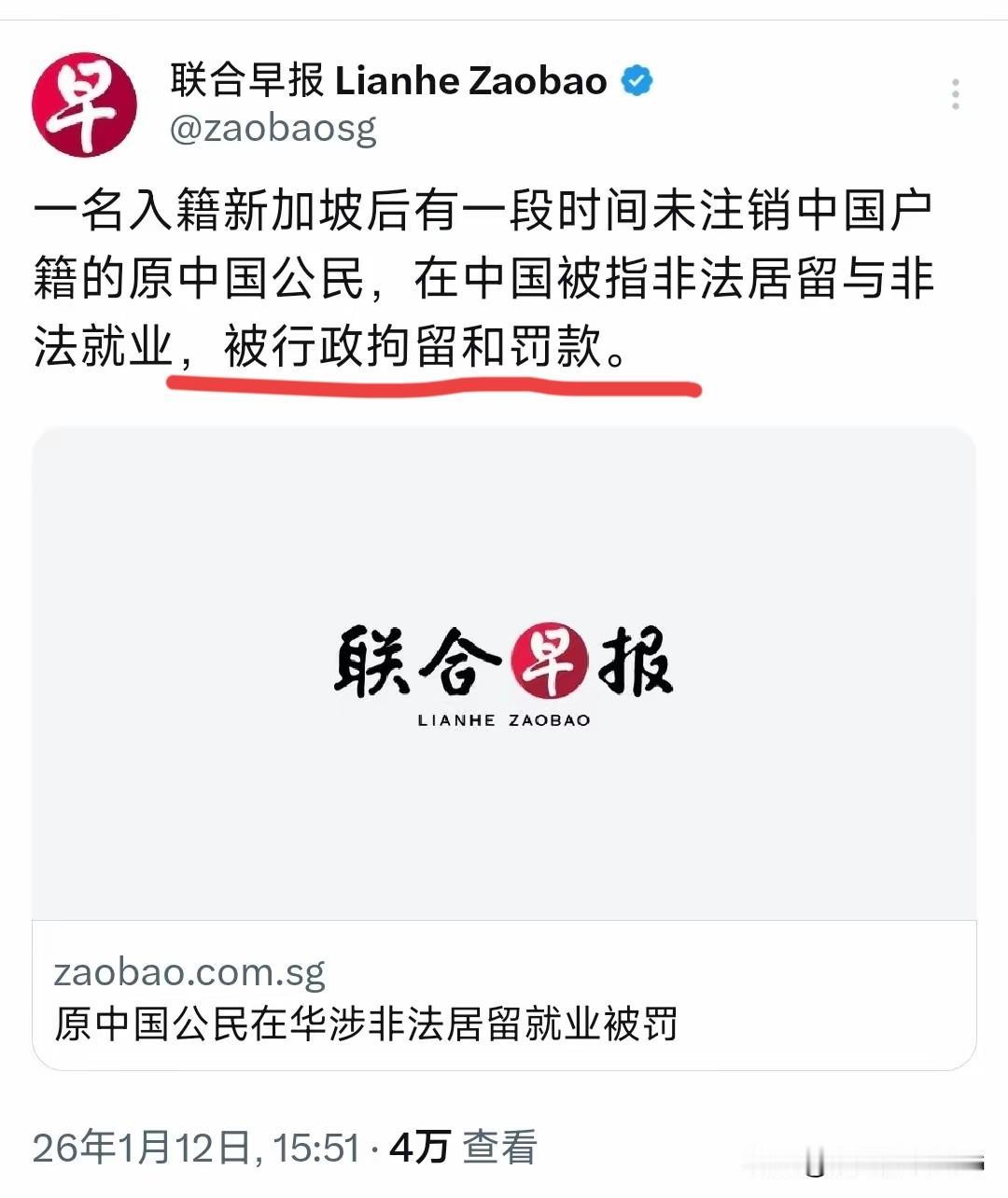 一个未注销中国籍却入籍新加坡的,被新加坡揪出来罚款并拘留…[捂脸] 是懒吗? 是忘了吗? 应该都不是,归根结底,思维就是哪边有便宜就占哪边的,而这样的无论在哪边都不会容… 朋友们,你们对此事怎么看? 欢迎大家在评论区探讨,留言…[送心]