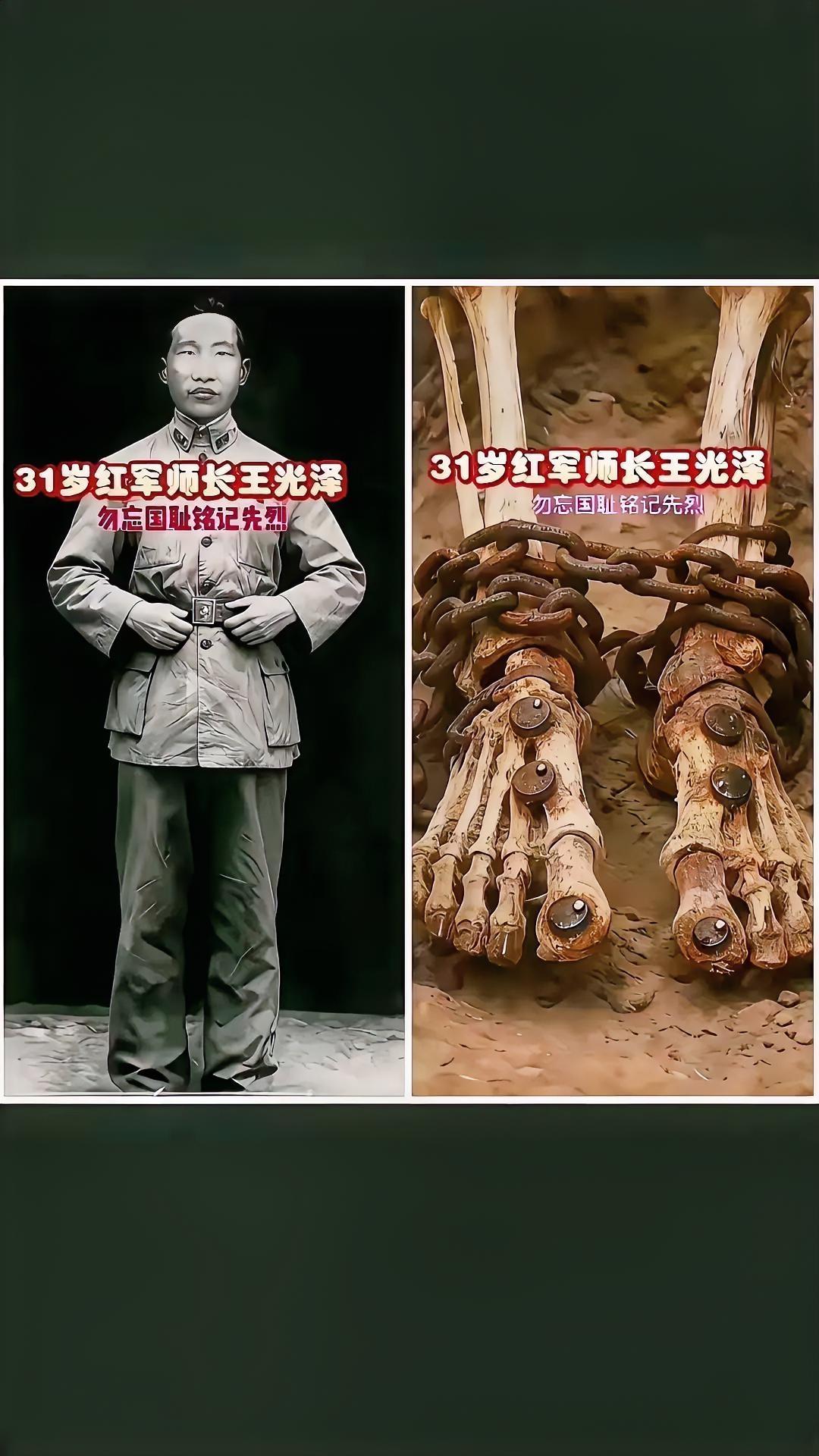 看到这双脚!我当场泪目又揪心! 这是红军黔东独立师师长王光泽的脚啊,敌人为了撬开他的嘴,逼他吐出党的机密,竟下了这般灭绝人性的毒手——烧红的粗铁钉狠狠钉穿双足,再把沉重脚镣死死钉死,尖针一根根扎进足趾,鲜血浸透囚衣,顺着脚趾往下淌,染红了牢房的地面! 那是撕心裂肺的疼啊!常人哪怕被针扎一下都忍不住喊痛,何况是铁钉穿骨、尖针刺趾的酷刑?可王光泽师长,自始至终没哼过一声,没求过一句饶,更没吐露过半句党的秘密!敌人的威逼利诱、严刑拷打,在他面前全是徒劳,哪怕疼到浑身抽搐、昏死过去,醒来依旧目光如炬,宁死不降! 这得是何等坚定的信仰,何等钢铁般的意志,才能扛住这般炼狱折磨,守住一个共产党人的气节啊!他本是湖南农家子弟,为了打碎旧社会的黑暗,为了让穷苦百姓能过上好日子,毅然扛起枪参加革命,从木工成长为红军师长,带着黔东独立师800多将士,硬生生牵制数万敌军,为红军主力突围拼尽全力,哪怕部队打到只剩200多人,哪怕弹尽粮绝被俘,他的骨气半点没折! 敌人曾摆上酒菜劝降,妄想用高官厚禄收买他,可他当场怒斥,骂得敌人哑口无言;劝降不成便下死手,用最残忍的酷刑折磨他,可他们哪里懂,共产党人的信仰不是铁钉能刺穿的,共产党人的气节不是酷刑能摧垮的!他就像寒冬里的青松,任凭狂风暴雪肆虐,依旧挺拔不屈;又像山巅的磐石,任凭刀砍斧凿,始终坚不可摧! 31岁啊,正是意气风发的年纪,他本该看着革命胜利,看着百姓安居乐业,却为了信仰,倒在了敌人的枪口下。临刑前,他被钉着死镣捆在椅子上,抬往刑场的路上,依旧拼尽全力高呼“共产党万岁”“工农红军万岁”,那呐喊震彻山谷,是他对信仰的坚守,更是对敌人的蔑视! 直到48年后,他的骸骨在邬家坡被发现,脚踝上还死死套着那副钉着铁钉的脚镣,那是敌人暴行的铁证,更是他英雄气节的勋章!这副脚镣,钉穿的是他的双脚,钉不穿的是他的初心;折磨的是他的身躯,磨不灭的是他的精神! 如今山河无恙,国泰民安,我们再也不用受旧社会的苦,再也不用经历那般残酷的岁月,可我们永远不能忘,今天的安稳日子,是王光泽这样的先烈用鲜血换来的;我们永远不能丢,先烈们用生命守护的信仰与气节! 王光泽师长,您的鲜血没有白流,您的理想早已实现,您的精神永垂不朽,永远活在我们心里!王光泽烈士