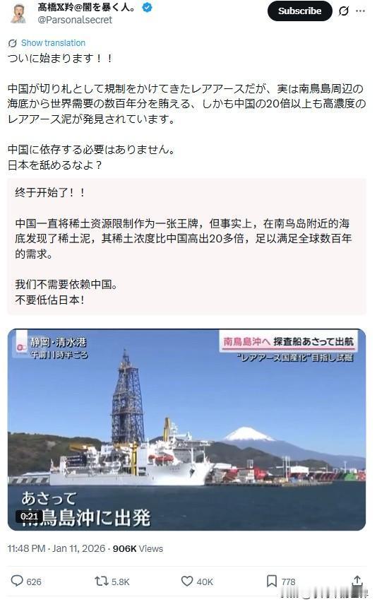 不要低估日本。 我们已在南鸟岛周边海底发现了足以满足全球需求数百年的稀土泥,而且其稀土浓度是中国稀土的20倍以上。 所以日本根本不需要再依赖中国稀土。 好吧,梦里啥都有。 就是这么一条假的不能再假的,自我安慰的假消息,日本人还真信,4万点赞,近6千转发。 日本这种病态是这个民族一贯的特性,他们总是相信自己愿意相信的,哪怕你把事实摆在他面前,他也不相信,他只相信自己愿意相信的。 先不说那个6000米海底,你要怎么把稀土泥挖上来,就算你挖上来,日本人不会以为稀土挖出来就能直接用吧? 还有这个稀土浓度,这是个啥玩意? 稀土冶炼拼的是纯度,而不是浓度。 这位可能把稀土跟铁矿石混为一谈了。觉得浓度越高,矿石质量越好。 话说回来,如果日本人真这么想,也是好事。稀土储量 日本稀土焦虑