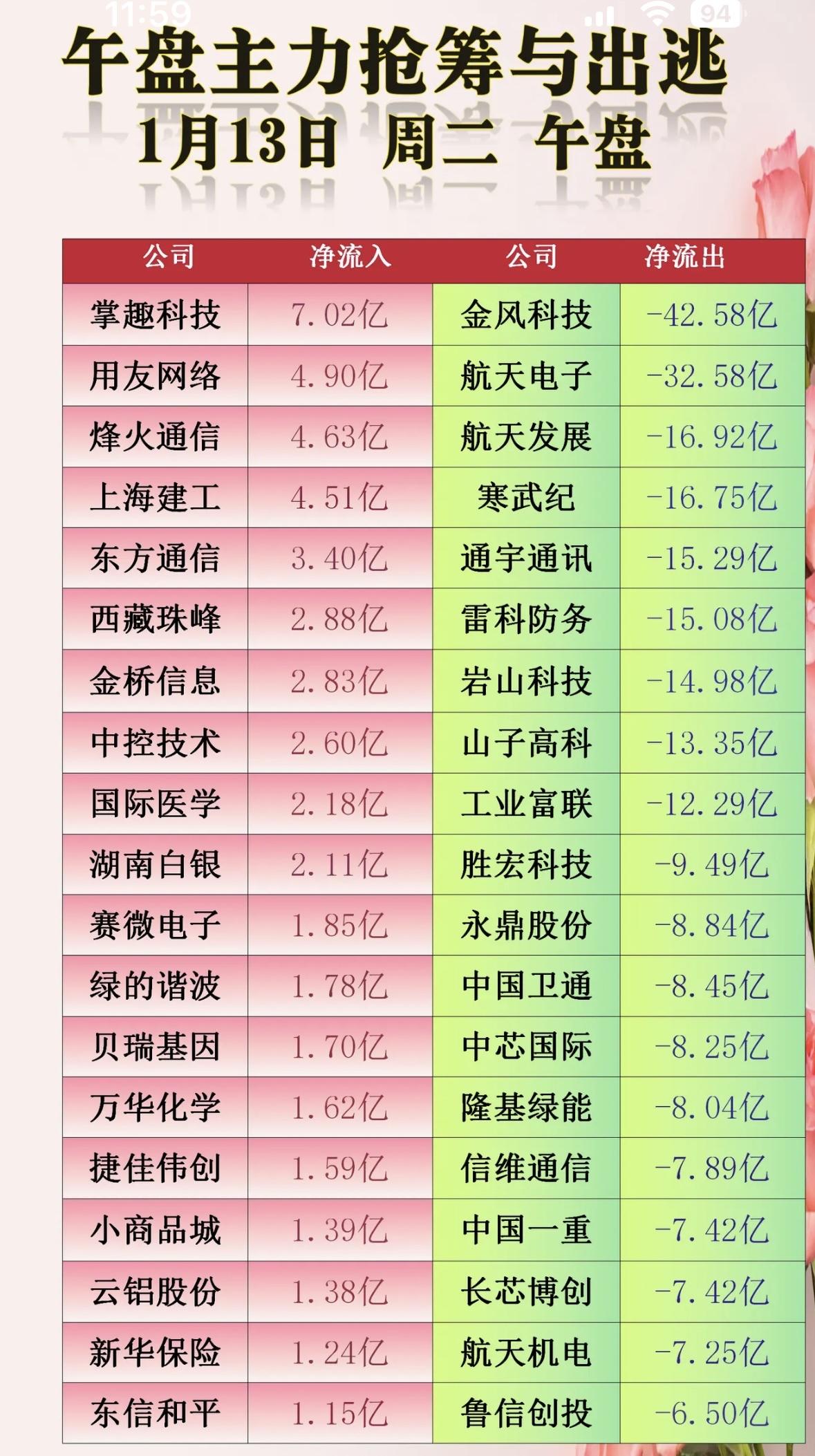 午盘主力抢筹与出逃,1月13日周二午盘净流入/流出数据大揭秘! 午盘主力动向:科技股吸金,新能源抛压显著,资金博弈加剧 午盘资金动向:科技股获主力抢筹,新能源与通信遭大幅抛售,市场分化