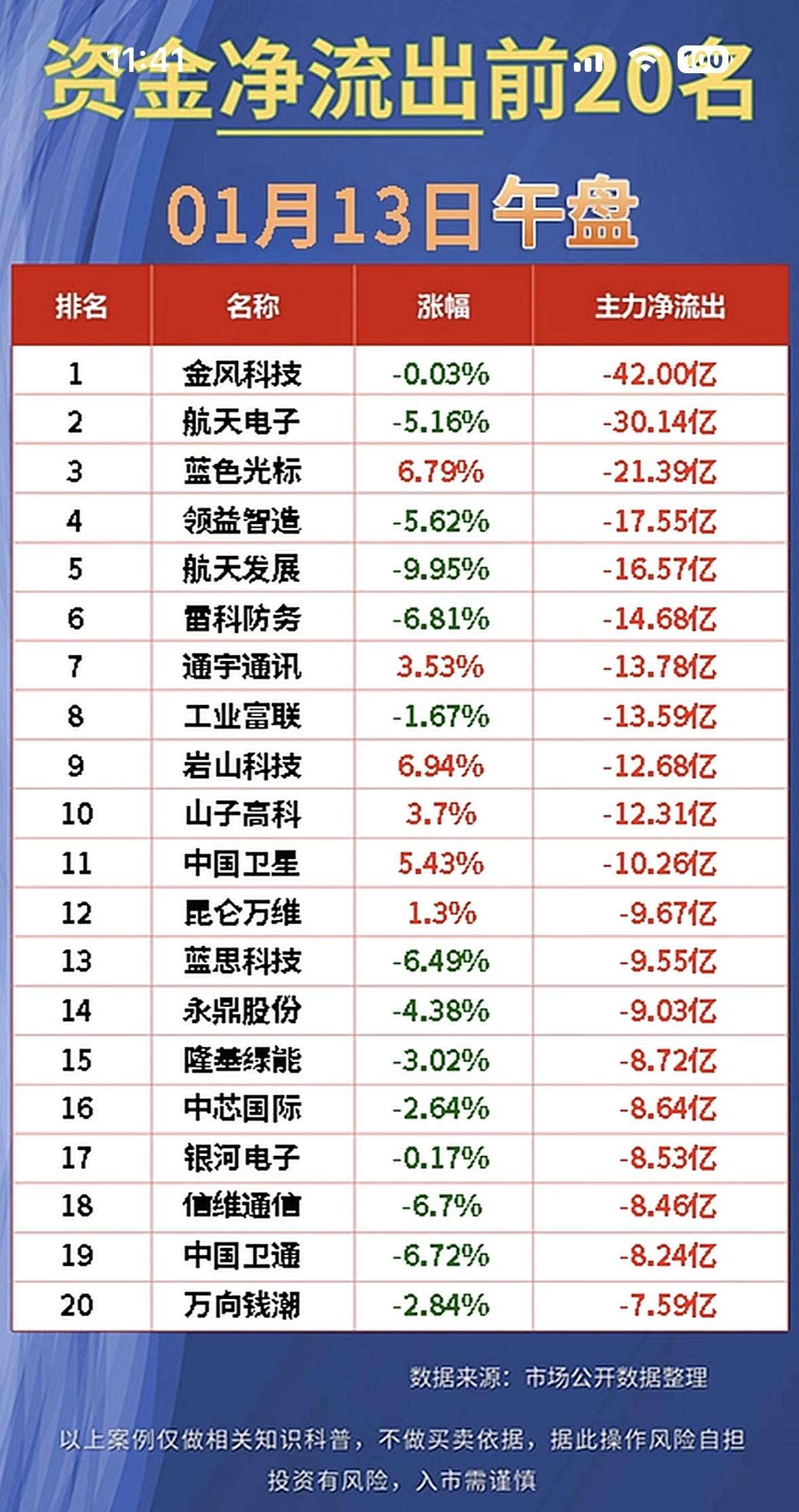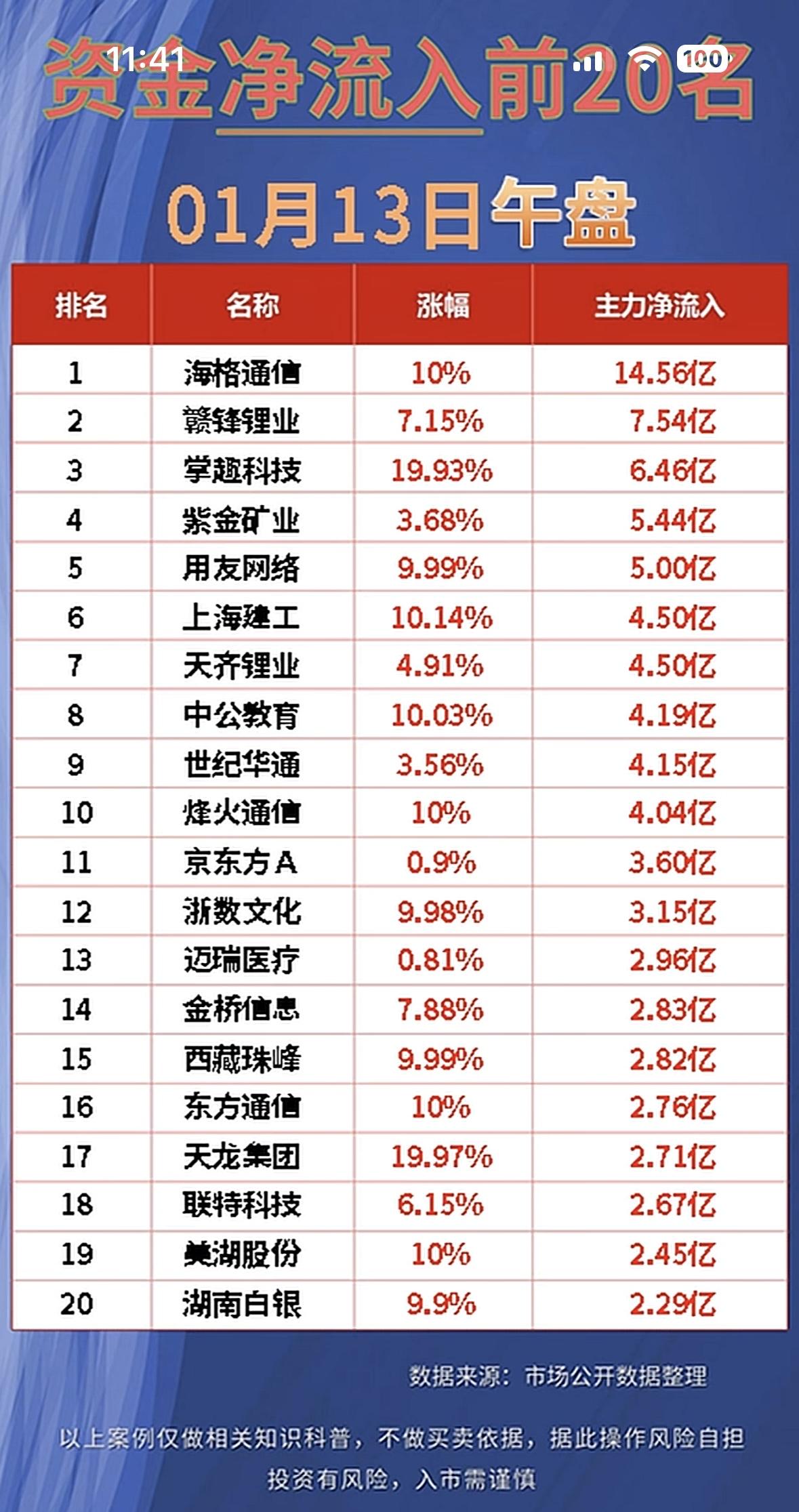 01月13日午盘资金净流出前20名,快来一探究竟! 1月13日午盘资金流向:通信、锂电、教育板块获主力青睐,多股涨停吸金显著 "锂电通信领涨,主力抢筹海格赣锋!教育医疗跟风,资金暗涌藏机会,投资需谨慎~"