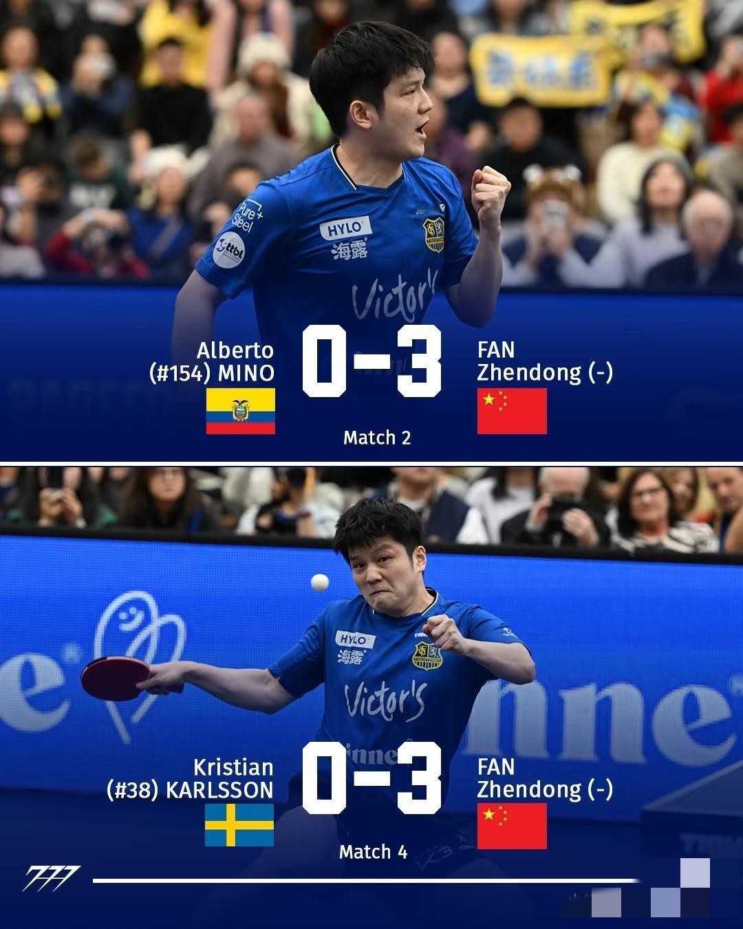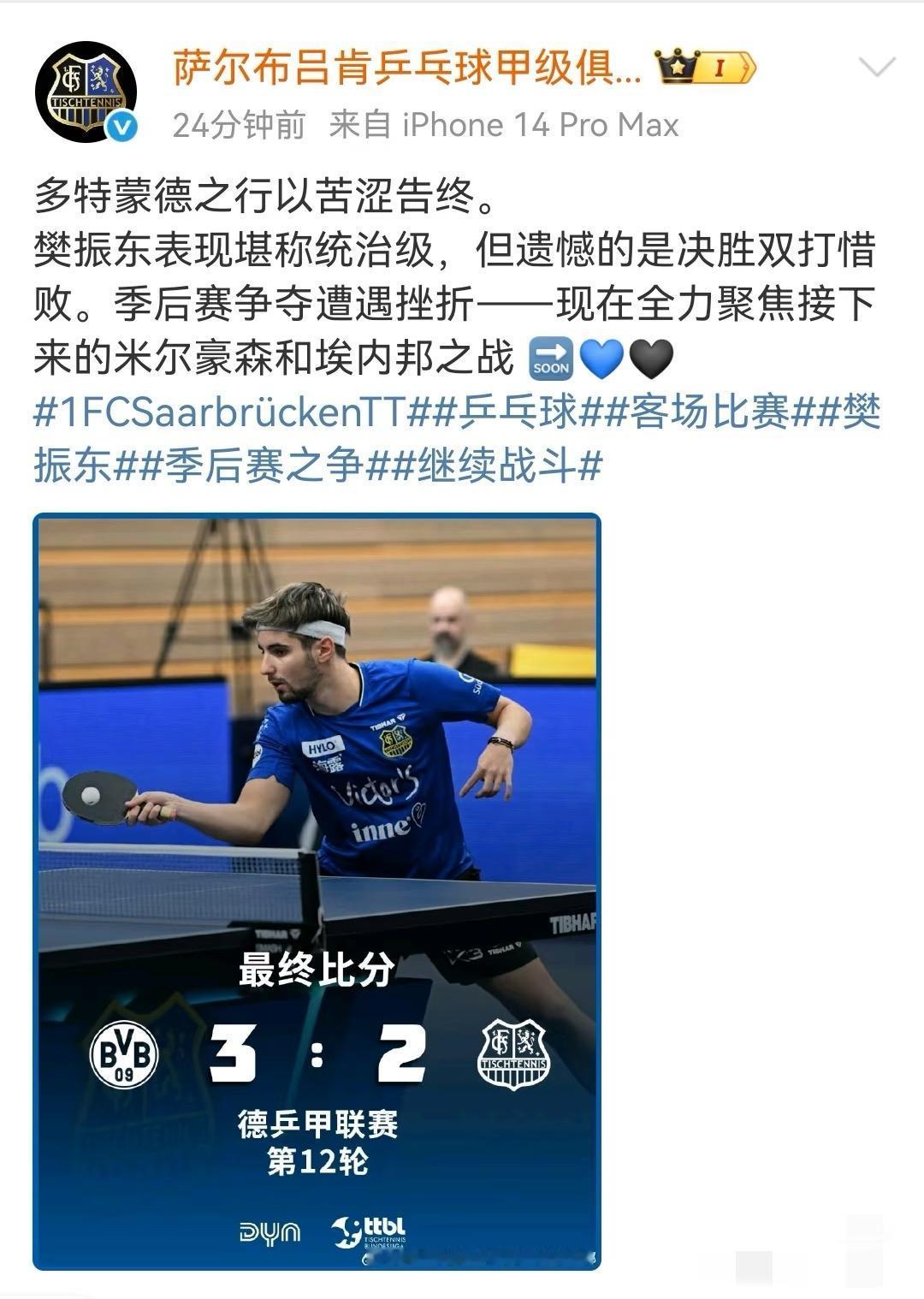 又一个力挽狂澜的夜晚。 樊振东两连胜力挽狂澜,将比赛拖入决胜的第五场双打🔥 最终萨尔布吕肯2:3惜败多特蒙德,樊振东已经做到了自己能做的一切 赛后萨尔布吕肯发文,称赞樊振东统治级的表现。(再也不是以往那个“两分难建功”的被遮住的环境了……) 赛前,老大哥波尔专程到场边和他拥抱,幸福地笑成核桃,这样的日子相信可以疗愈他此前所经历的一切吧 祝福咚咚,永远这么开心快乐。