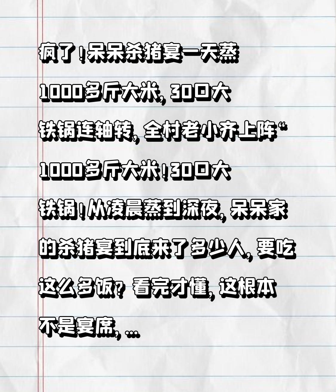 疯了!呆呆杀猪宴一天蒸1000多斤大米,30口大铁锅连轴转,全村老小齐上阵 “1000多斤大米!30口大铁锅!从凌晨蒸到深夜,呆呆家的杀猪宴到底来了多少人,要吃这么多饭?看完才懂,这根本不是宴席,是全村人的真心抱团!” 谁能想到,我一条“请大家帮爸爸按猪”的视频,能让全村陷入“蒸饭大战”!原本计划请几十位邻里乡亲,结果网友从五湖四海赶过来,最远的开了800多公里,到中午院子里已经挤了3000多人,比我们村总人口还多3倍。 我爸看着乌泱泱的人群,当场拍板:“来者都是客,管够饭!”可转头就犯了难——家里只有2口铁锅,怎么供3000人吃饭?还是村支书有办法,立刻在村里吆喝一声,半小时内,乡亲们就把家里的大铁锅、蒸笼全搬了过来,足足凑了30口,从村口到院子摆了两排,像一条“蒸汽长龙”。 1000多斤大米,是村里的粮店老板连夜调的货,十几位大妈围着大盆淘米,手指泡得发白都没喊累;村里的壮劳力轮流添柴火,灶台里的火苗窜得老高,把脸烤得通红;我妈和几位阿姨负责分装,刚蒸好的米饭冒着热气,用大铁盆端上桌,瞬间被抢空,只能赶紧蒸下一锅。 最有意思的是,好多网友也没闲着,会烧火的主动凑到灶台边,会洗碗的吃完就去水池帮忙,有个大哥还从车里拿出自带的电饭煲,跟着一起蒸饭。有人问“这么多人,不怕亏吗?”我爸笑着说:“农村人待客,图的就是热闹,人越多越开心!” 可到了傍晚,意外发生了!连续蒸了8个小时,家里的柴火早就烧完了,而还有几百位网友没吃上饭,剩下的大米也只够蒸两锅。正当我们急得团团转时,隔壁村的乡亲们闻讯赶来,有的拉着整车柴火,有的扛着自家的大米,甚至还有人带来了刚蒸好的馒头、面条,笑着说“一家人不说两家话,一起凑活吃!” 更让人暖心的是,有网友看到我们忙不过来,主动组织大家排队打饭,还提醒大家“适量取餐,别浪费”。原本乱糟糟的场面,在陌生人的互相体谅中变得井然有序,没人抱怨没吃上饭,反而有人说“看着这股热闹劲,就算站着吃也值了”。 直到深夜11点,最后一批网友离开,我们才停下手里的活。30口大铁锅被洗得干干净净,院子里的垃圾也被大家一起清理完毕,1000多斤大米几乎一粒没剩,却留下了满院子的温情。我妈算了算,光食材就花了好几万,可她笑着说“一点不亏,认识了这么多好心人”。 其实这场杀猪宴,火的从来不是1000斤大米的排场,而是农村人“待人以诚”的朴实,是陌生人之间“互相搭把手”的善意。3000人从天南海北赶来,不是为了吃一顿饭,而是为了奔赴一场久违的热闹,感受一份纯粹的真诚。 现在回想起来,那些冒着热气的大铁锅,不仅蒸出了香喷喷的米饭,更蒸出了人与人之间最珍贵的信任。农村的宴席没有山珍海味,却有着最动人的烟火气;我们没有刻意讨好谁,却用真心换来了大家的体谅与帮助。 你有没有参加过这样热闹的乡村宴席?评论区说说你的经历,一起为这份纯粹的善意点个赞~ 呆呆杀猪宴 乡村烟火气 真诚换真心