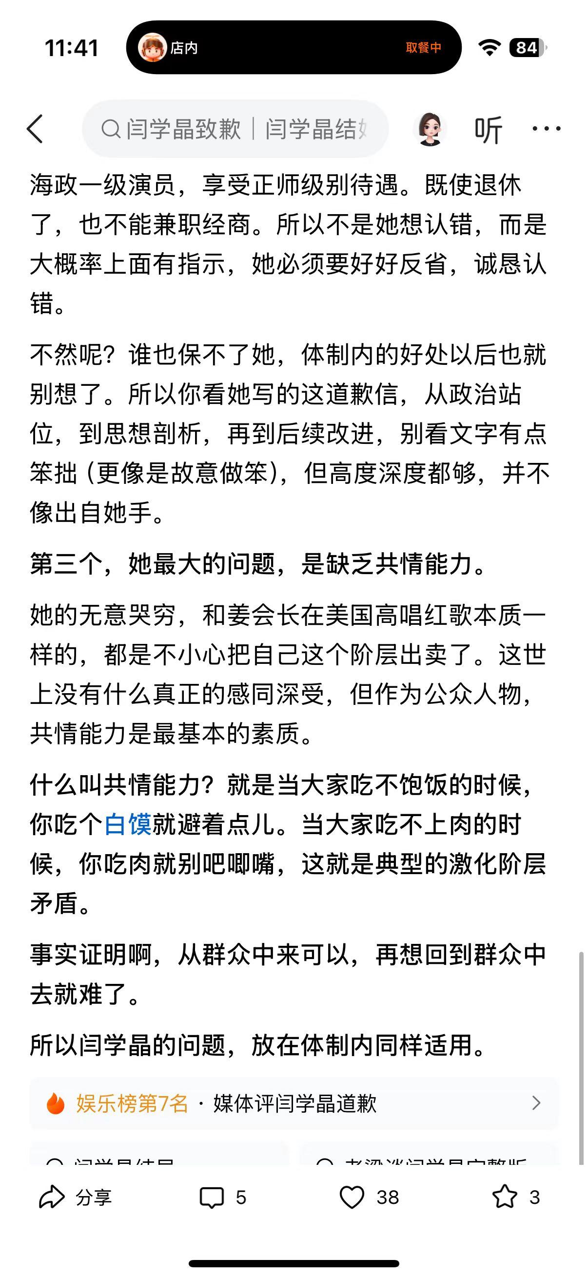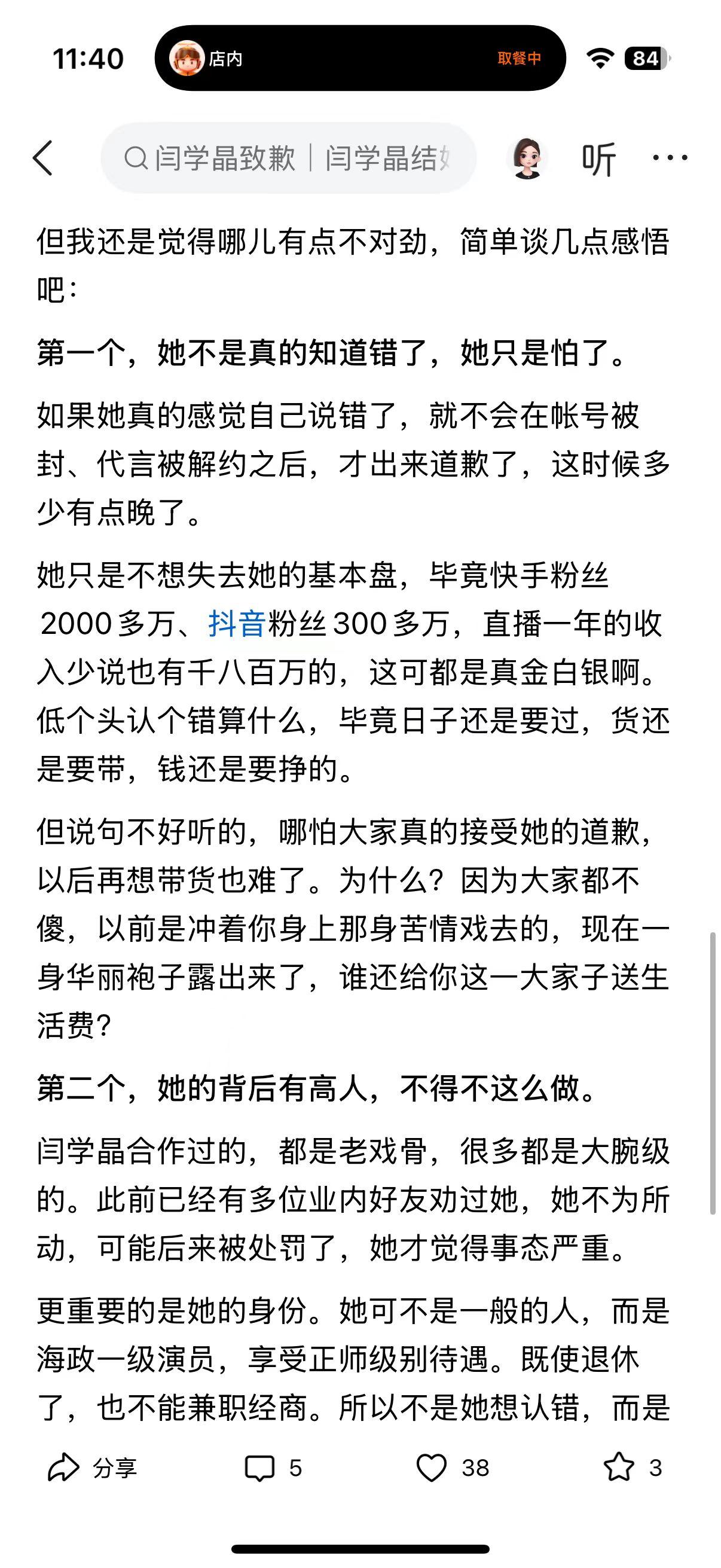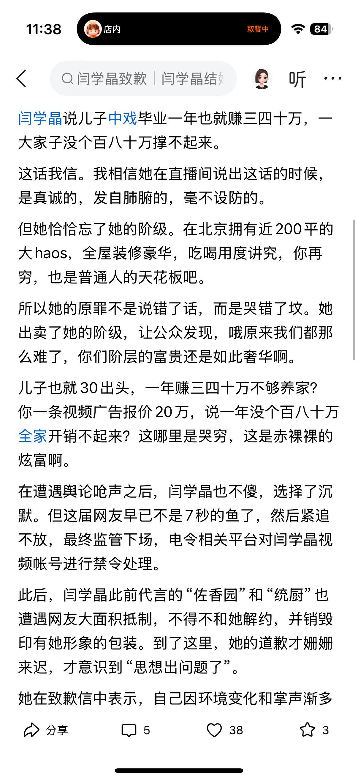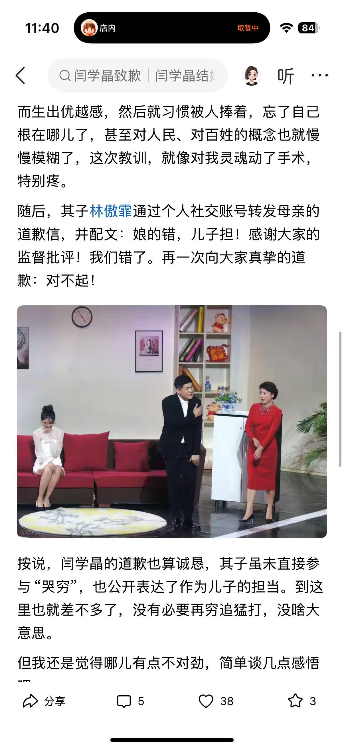 家人们谁懂啊!闫学晶这波 “哭穷” 真的把人看傻了!说儿子中戏毕业一年赚三四十万不够花,全家一年得百八十万才撑得起来,可她住着近 200 平豪宅,一条广告就 20 万,这哪是哭穷,分明是凡尔赛式炫富啊! 普通人一年挣几万块都能养家,她儿子三十出头年入三四十万还嫌少,这简直脱离群众到离谱。网友们当然不买账,舆论一发酵,平台被监管约谈封了她账号,代言品牌也赶紧解约销毁包装。直到这时候,她才姗姗来迟道歉,说自己 “忘了根”“思想出问题了”,儿子还出来帮着担责。 但说实话,这道歉谁信啊?要是真知道错了,早干嘛去了?还不是账号被封、钱赚不了了才慌的?而且她作为海政一级演员,享受正师级待遇,本就不能兼职经商,说不定是上面有要求才不得不认错。公众人物最该有的就是共情能力,大家日子都不容易,你吃肉别吧唧嘴啊!你们觉得她是真心悔改吗?