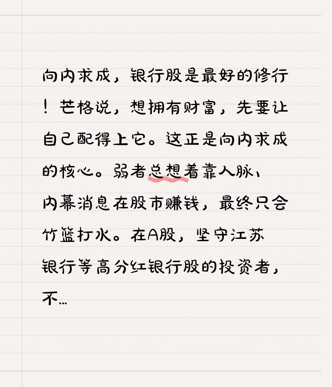 向内求成,银行股是最好的修行! 芒格说,想拥有财富,先要让自己配得上它。 这正是向内求成的核心。弱者总想着靠人脉、内幕消息在股市赚钱,最终只会竹篮打水。 在A股,坚守江苏银行等高分红银行股的投资者,不靠跟风炒作,只看企业基本面。 当你靠自己的认知赚到钱,不仅能解决生活难题,更能收获不依附他人的身心自由,这就是价值投资的真谛。