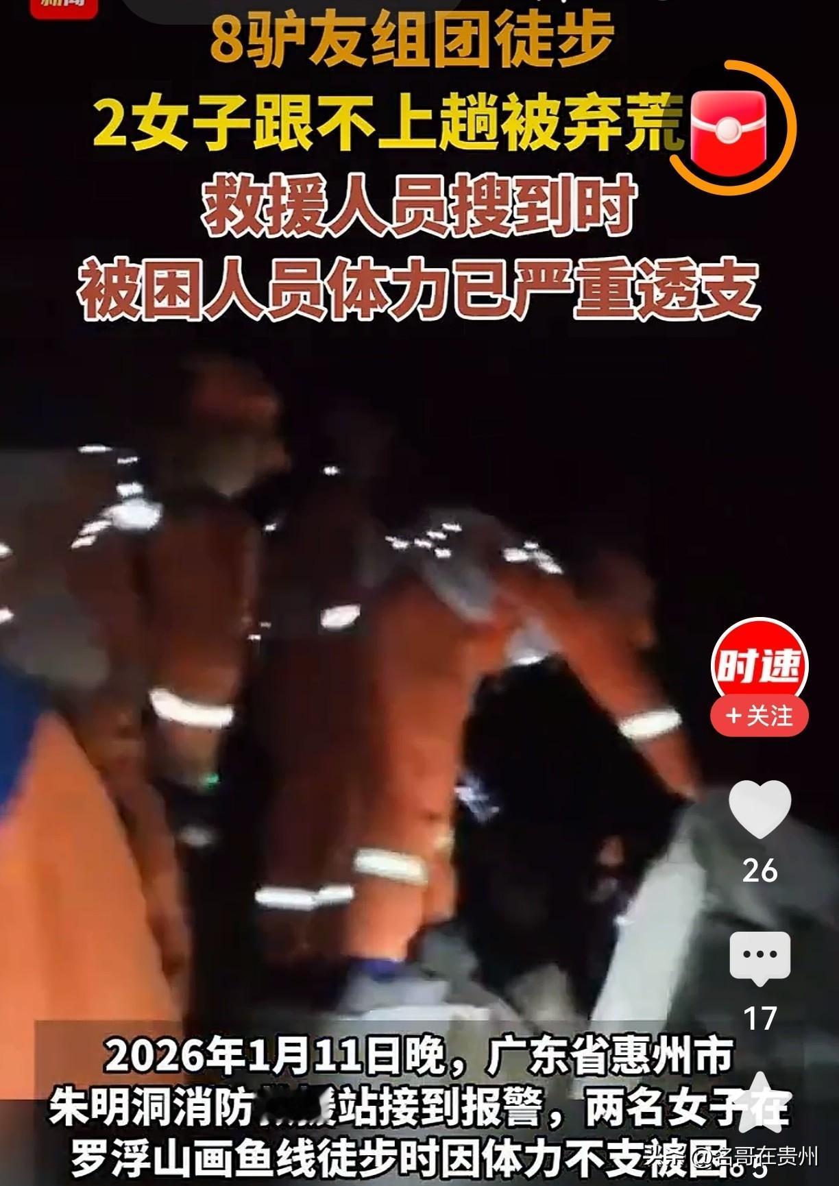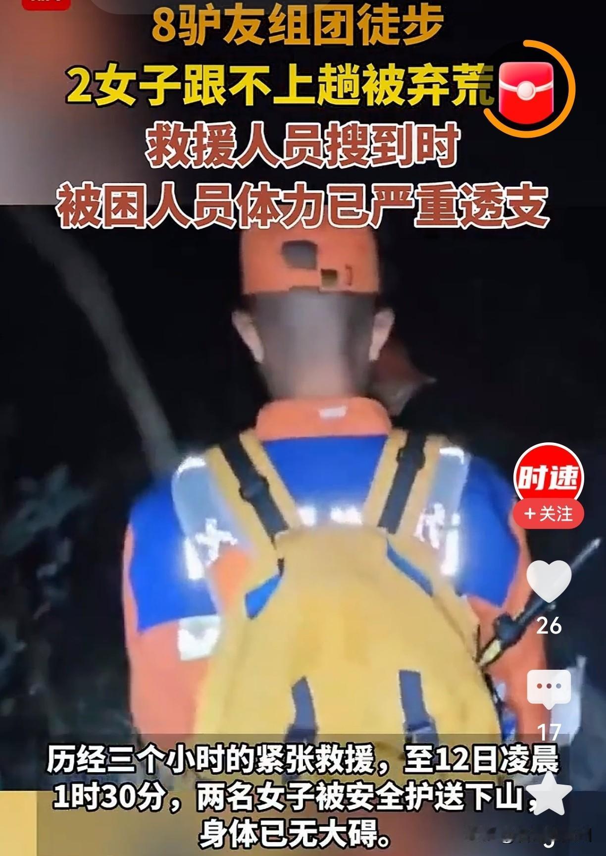 8人徒步丢下2姐妹!荒山深夜绝望呼救:“说好一起走,为何剩我俩?” 刚才刷到一条揪心的消息:某地8人徒步团在山里,竟把两名掉队女子单独扔在荒山!等救援队摸黑找到人时,两人瘫在石头上,浑身发抖,话都说不完整。 这哪是队友?根本是“人导航”用完就丢!据说队伍里有人嫌她们走得慢,怕耽误天黑前下山,招呼不打就带着大部队往前走。两个姑娘一开始还咬牙追,后来实在腿软跟不动,眼睁睁看着前面人影消失在树林里。 你猜最寒心的是什么?其中一人后来低声说:“我以为至少会留瓶水给我们。” 荒山是什么地方?没信号、温度骤降、可能有野兽。她们俩手机电量告急,压缩饼干只剩半块。那种被全世界遗忘的恐惧,比体力透支更可怕。 这事儿吵翻天了。有人说“户外不是幼儿园,自己不行别拖累全队”;但更多人骂:“既然组了队,就是一条绳上的蚂蚱,见死不救跟陌生人有什么区别?” 其实户外圈有条不成文的铁律:结伴而行,就意味着默许了“互助契约”。你可以不等,但绝不能不留物资、不指路、不告知后续计划。这不是矫情,是救命底线。 更狠的是,有律师指出:这种明知队友有危险还故意遗弃的行为,如果造成严重后果,甚至可能涉及违法!别说人情了,连法律底线都在摇晃。 但我想说个更扎心的真相: 很多时候,考验人性的不是“会不会一起享受远方”,而是“愿不愿一起扛过狼狈”。风光时都是兄弟姐妹,困境里却只剩自私算计。 如果你是那俩姑娘,接下来还敢随便跟人组队吗? 如果你是当时的队友,你会留下来陪,还是转身“赶进度”?徒步事故 徒步失踪 徒步姐妹团