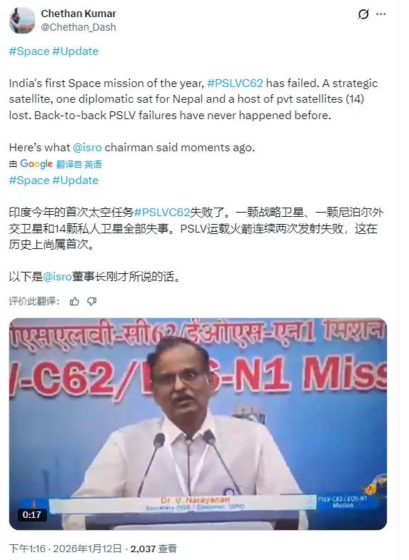 印度航天卫星接连发射C62、C62失败,也算是创造卫星发射失败历史了。2025年5月发射他们所谓的C61发射到空中,发生了爆炸,以失败告终,就像他们的空间研究组织主席纳拉亚南说的那样,C61事故原因还没有向印度大众说明。而这次发射的C62,同样是发射到第三飞行阶段,因箭体燃烧压力下降,飞行轨迹不受控制而宣告失败,箭上搭搭载的16颗卫星没有运送到预定轨道,卫星坠入太空不知所踪或是化为灰烬。 一次性发射16颗卫星,太好大喜功了,满脑子都是超越,结果只能迎来一次次巨大的劳民伤财的失败。(个人观点,不喜勿喷,谢谢!)
