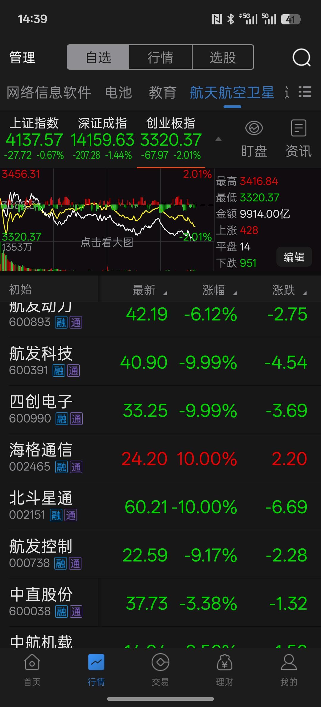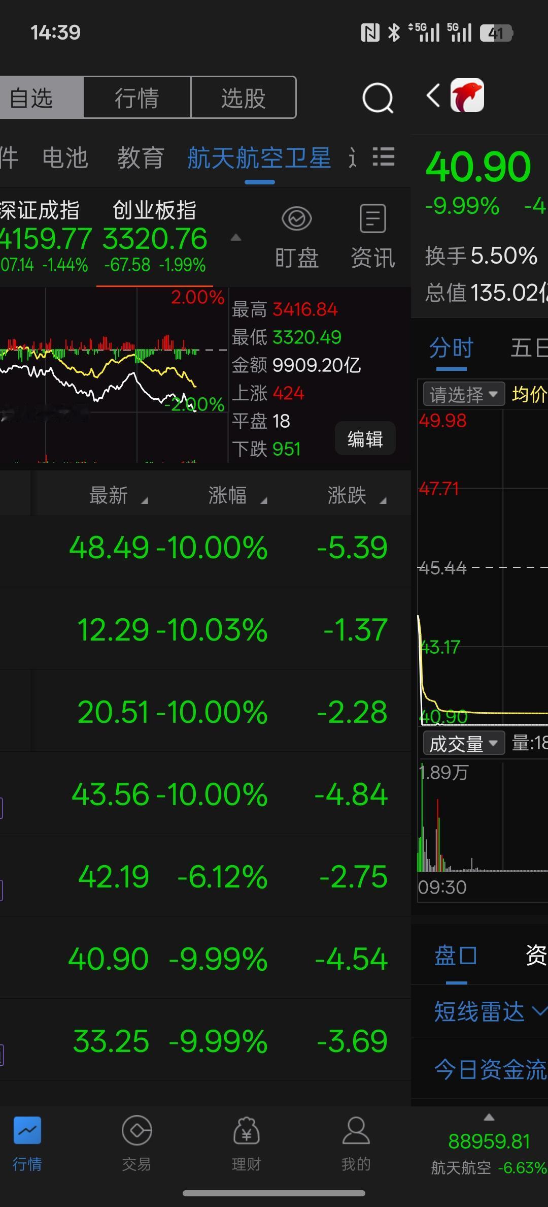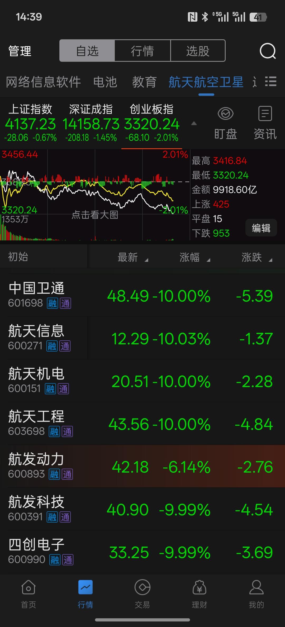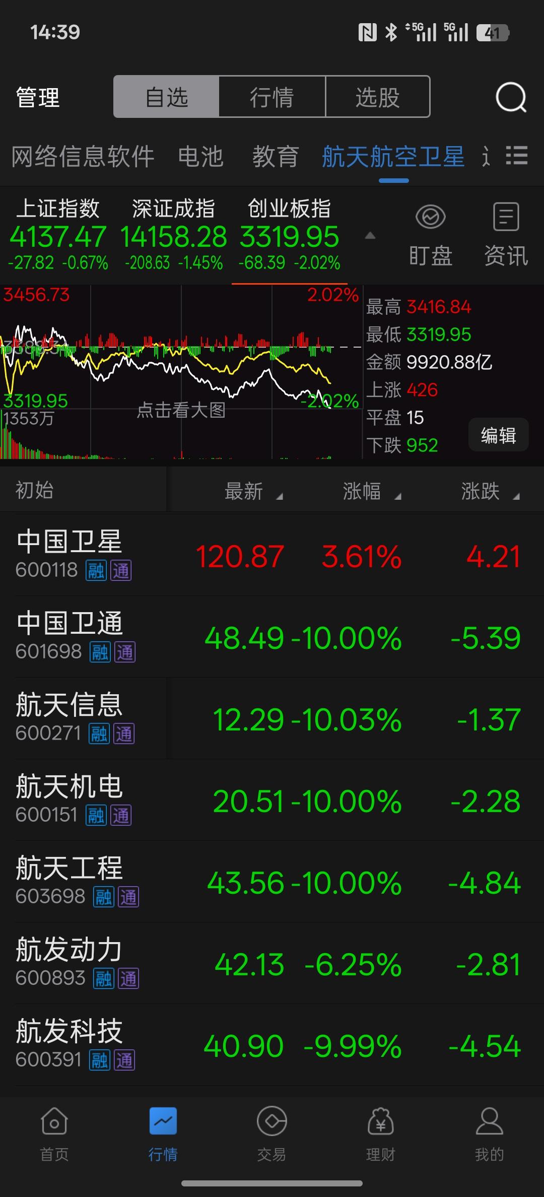 今天,卫星,航天航空大面积的跌停全部关灯吃面,市场过热硬把它按下来! 今天市场一直被按着,根本就爬不起来!昨天没减仓的,今天基本上亏掉,昨天赚!这个按的有点猛啊!直接给你按在地板上,头都没办法抬! 今天基本上都是亏钱的!基本上是回吐了利润!看明天有没有情绪上的反弹?