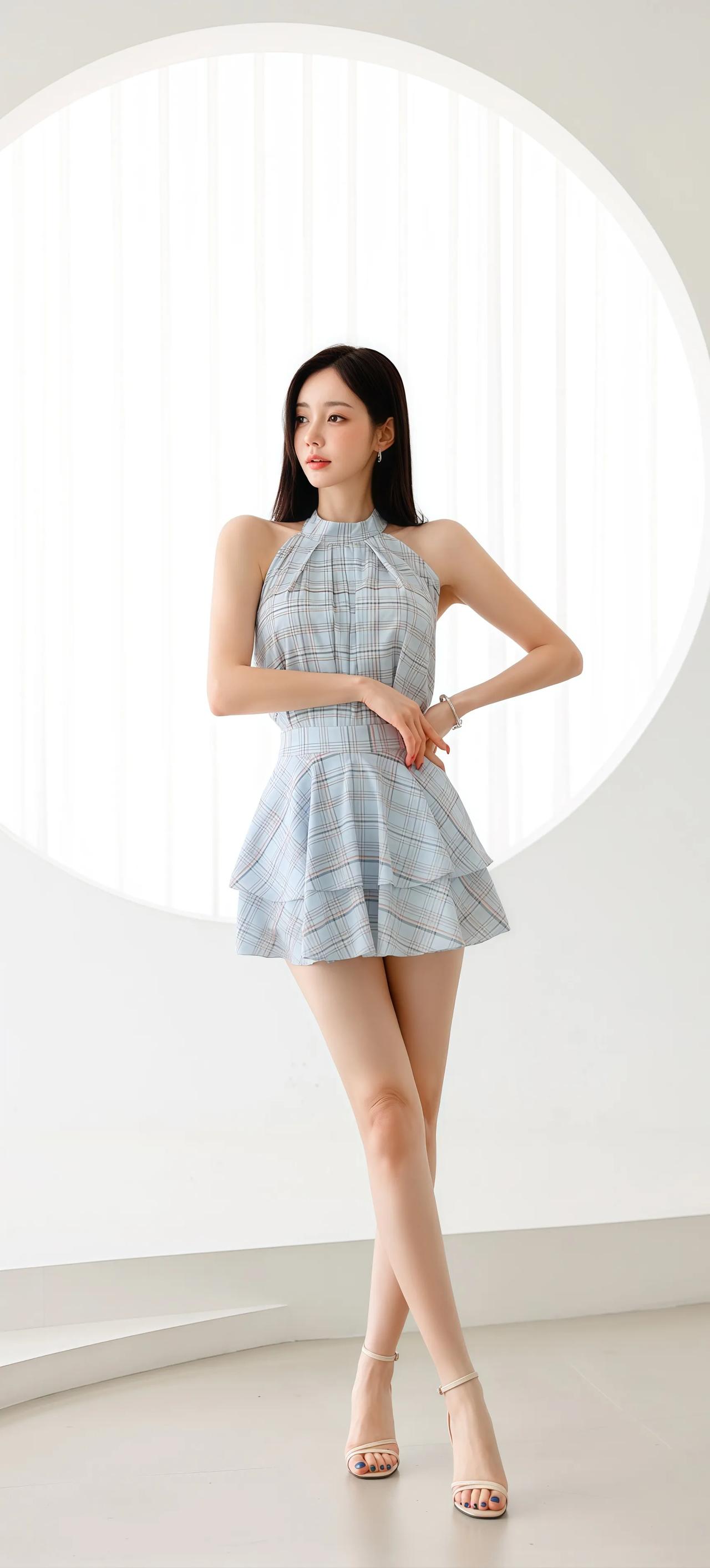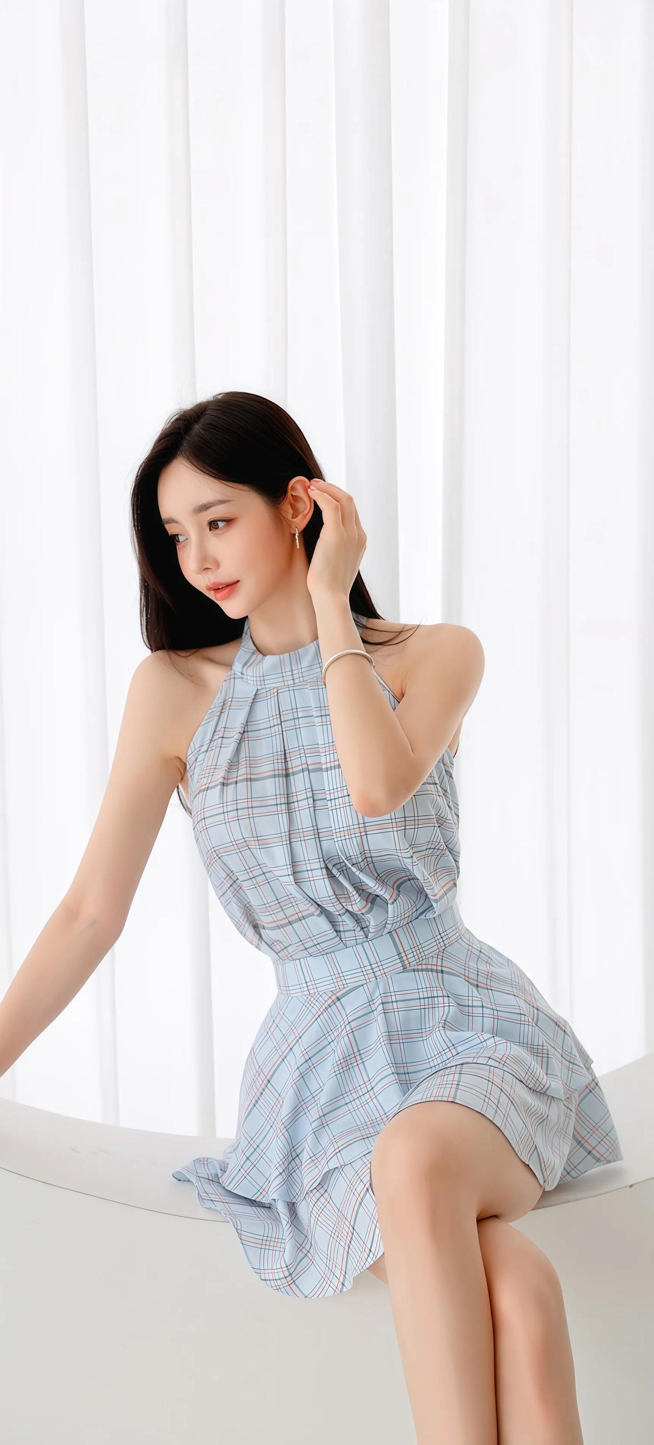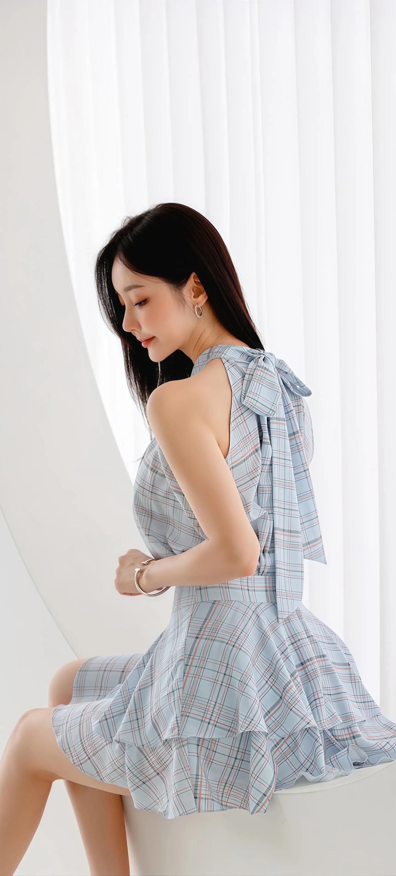 优雅蓝白格裙,甜美少女风,夏日清新穿搭