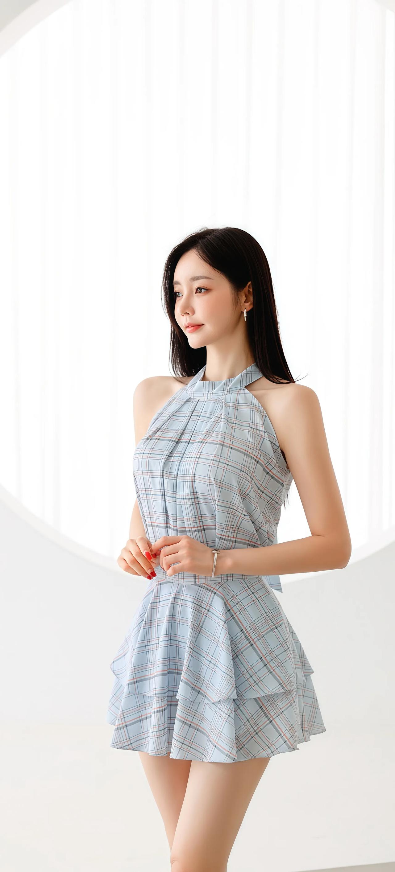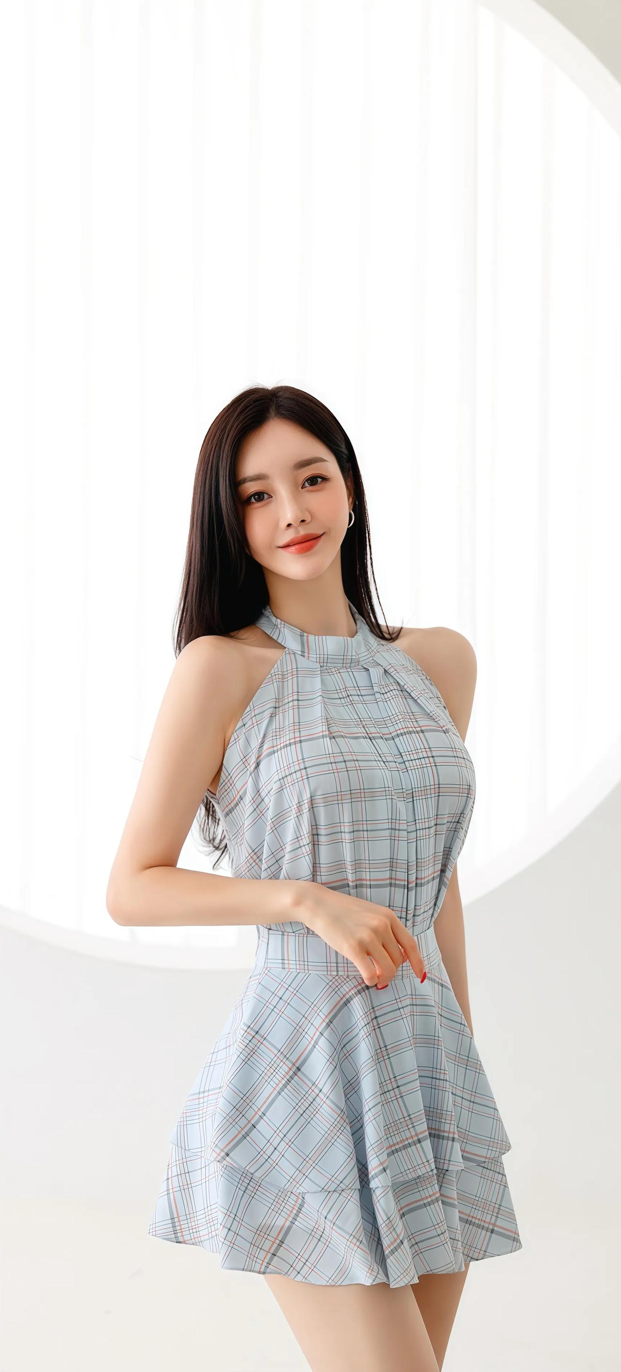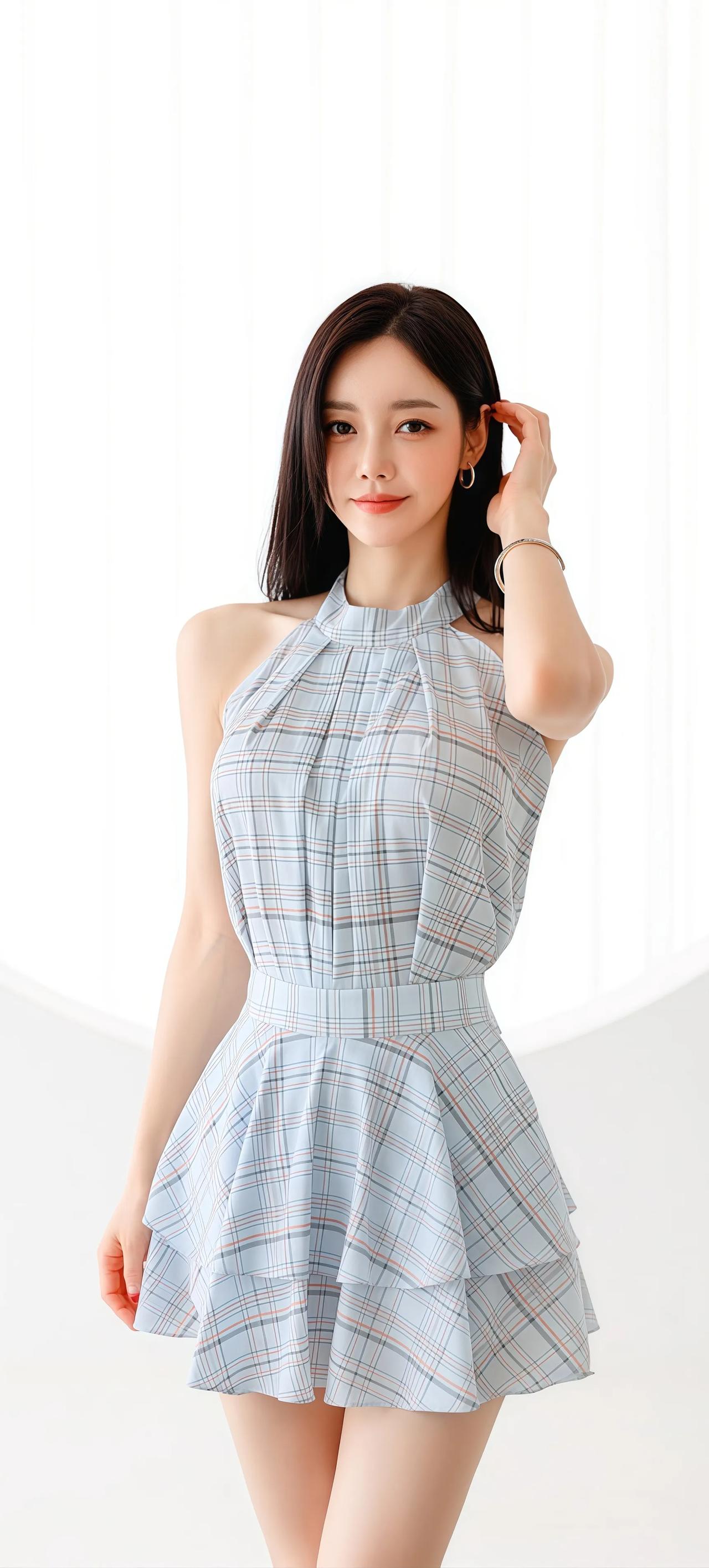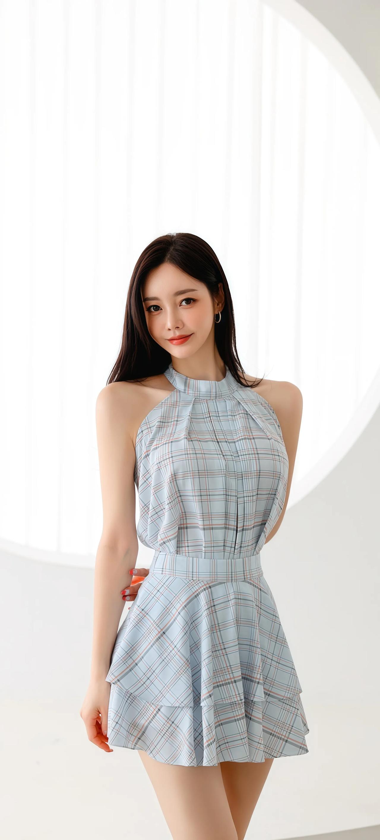 优雅蓝白格裙,甜美少女风,夏日清新穿搭