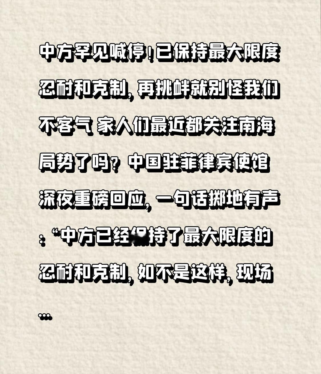 中方罕见喊停!已保持最大限度忍耐和克制,再挑衅就别怪我们不客气 家人们最近都关注南海局势了吗?中国驻菲律宾使馆深夜重磅回应,一句话掷地有声:“中方已经保持了最大限度的忍耐和克制,如不是这样,现场状况可能完全不同!” 这话可不是随便说说,背后藏着26年的隐忍和铁一般的事实,看完你就知道,中国的克制从来不是软弱! 很多人可能疑惑,咱们明明占理,为啥一直“忍”着?这就得从菲方的操作说起了。1999年,菲方军舰非法在仁爱礁“坐滩”,说船坏了没法拖走,结果一赖就是27年,还偷偷运钢材、水泥搞建设,想把军舰变成永久军事据点 。这还不够,2025年上半年,菲方在铁线礁等无人岛礁,竟然侵登了30次,光人员就去了211人次,明摆着破坏“无人无设施”的约定 。 更过分的是去年12月,菲方有组织地纠集大批船只,非法闯进仙宾礁潟湖,故意制造紧张局势。而这一切,他们还倒打一耙,把中方的正常维权说成“非法巡航”,简直是偷换概念、误导舆论 。咱们一直忍着,是因为相信邻里之间能坐下来谈,毕竟中方和其他邻国的领土争议,都是靠对话协商解决的,可菲方偏偏不接茬,背后明显有人在挑唆对抗。 转折点来了!中方的“忍”,从来不是无底线妥协,而是有底气的克制。早在2006年,咱们就根据《联合国海洋法公约》,明确把海域划界争议排除在仲裁之外,菲方单方面搞的仲裁,本来就无效 。这些年咱们不主动挑事,但也从没放松准备,海军实力稳步提升,维权措施有理有据,之所以不升级局势,是不想让两国百姓陷入冲突,更不想让第三方势力渔翁得利。 可能有人会说,“忍”会不会让人觉得好欺负?看看历史就知道,中国的忍耐从来有底线。就像之前英国搞BNO护照小动作,咱们直接宣布不再承认,干脆利落反制;面对其他国家的无理挑衅,咱们也是先礼后兵,道理讲透了还不听,就必须付出代价 。这次对菲律宾,咱们依然留着对话的大门,但也明确表态:“不管对方找多少帮手,中方随时奉陪到底!” 其实这事儿戳中了所有中国人的心声:咱们热爱和平,但绝不惧怕冲突;咱们懂得克制,但底线不容触碰。中国的“最大限度忍耐”,是大国的担当,是对和平的珍视,可如果有人把这份克制当成软弱可欺,那就大错特错了。 国家主权和领土完整,从来都是红线中的红线。中方的回应已经说得很清楚,对话的大门敞开,但挑衅的代价谁也付不起。评论区聊聊,你支持中方的克制态度吗?点赞转发,让更多人知道真相,愿南海风平浪静,也愿所有国家都能明白:和平不是靠挑衅得来的,尊重才能共赢!