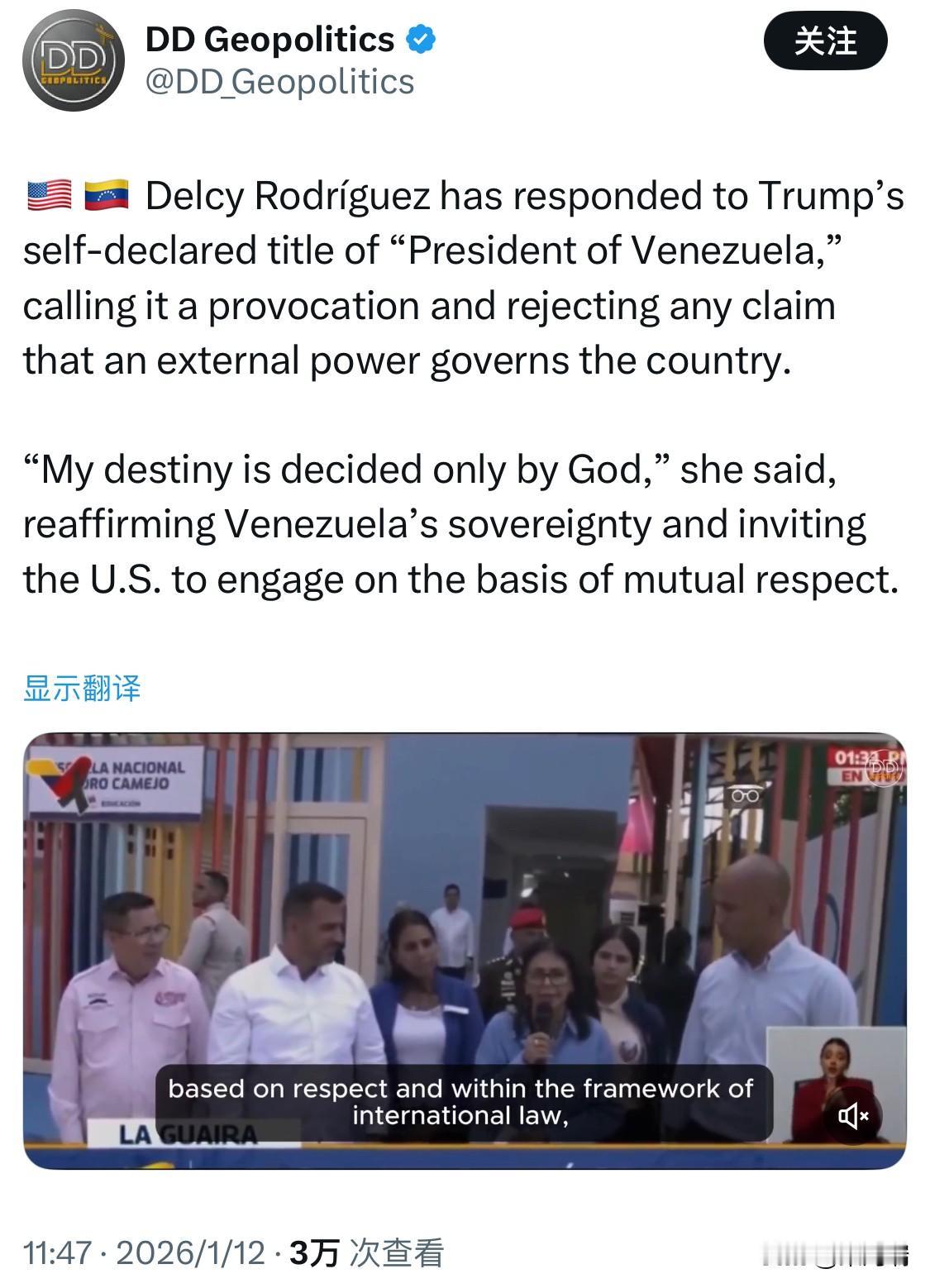 委内瑞拉临时总统德尔西·罗德里格斯回应了特朗普自封的“委内瑞拉总统”头衔,称其为挑衅,并拒绝任何关于外部势力统治该国的说法。 “我的命运只由上帝决定,”她说道,重申了委内瑞拉的主权,并邀请美国在相互尊重的基础上进行对话。