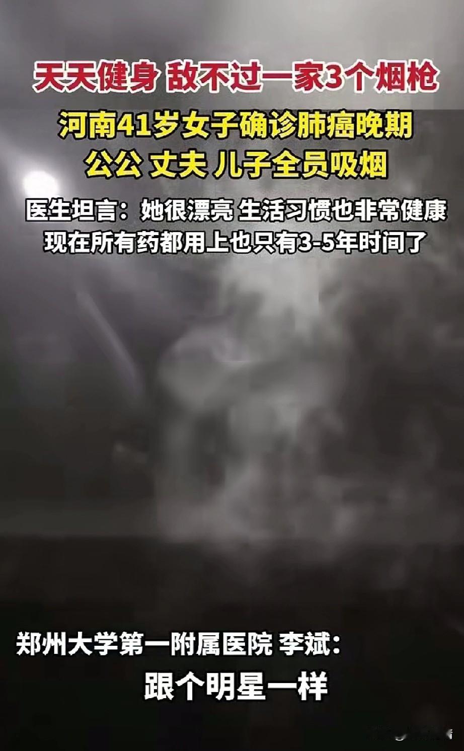 河南41岁女子确诊肺癌晚期, 天天健身敌不过一家三支烟枪, 她的公公,丈夫,儿子
