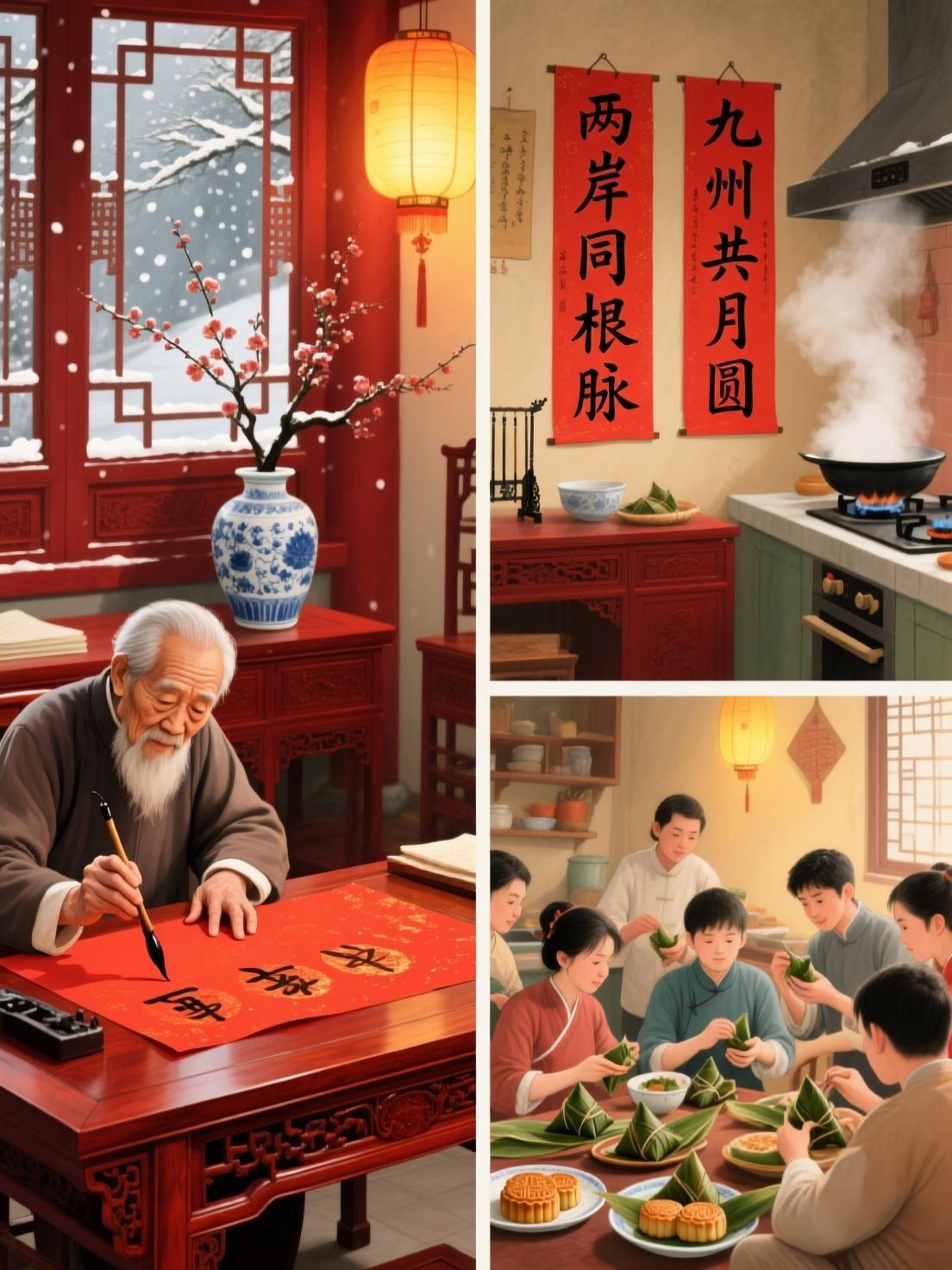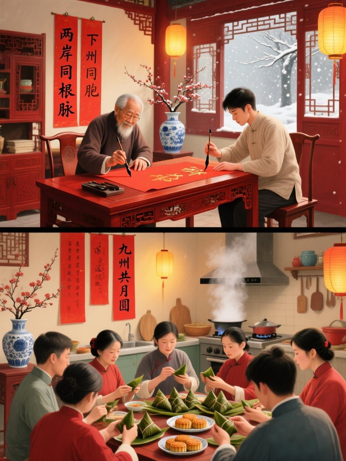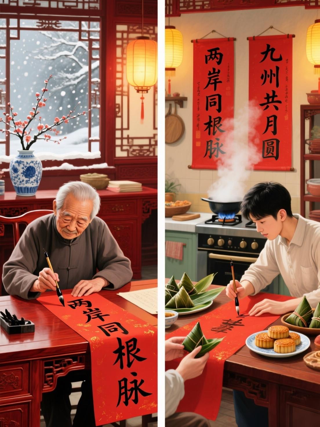 上联:两岸同根脉,下联:九州共月圆最近看到台湾同胞来大陆过春节的新闻,突然想起小时候奶奶说,咱们和台湾的亲人,就像这对联的上下联,少了谁都不完整”。两岸同胞一起写春联、包粽子的温暖镜头,愿这副对联,能牵起更多回家的路。
