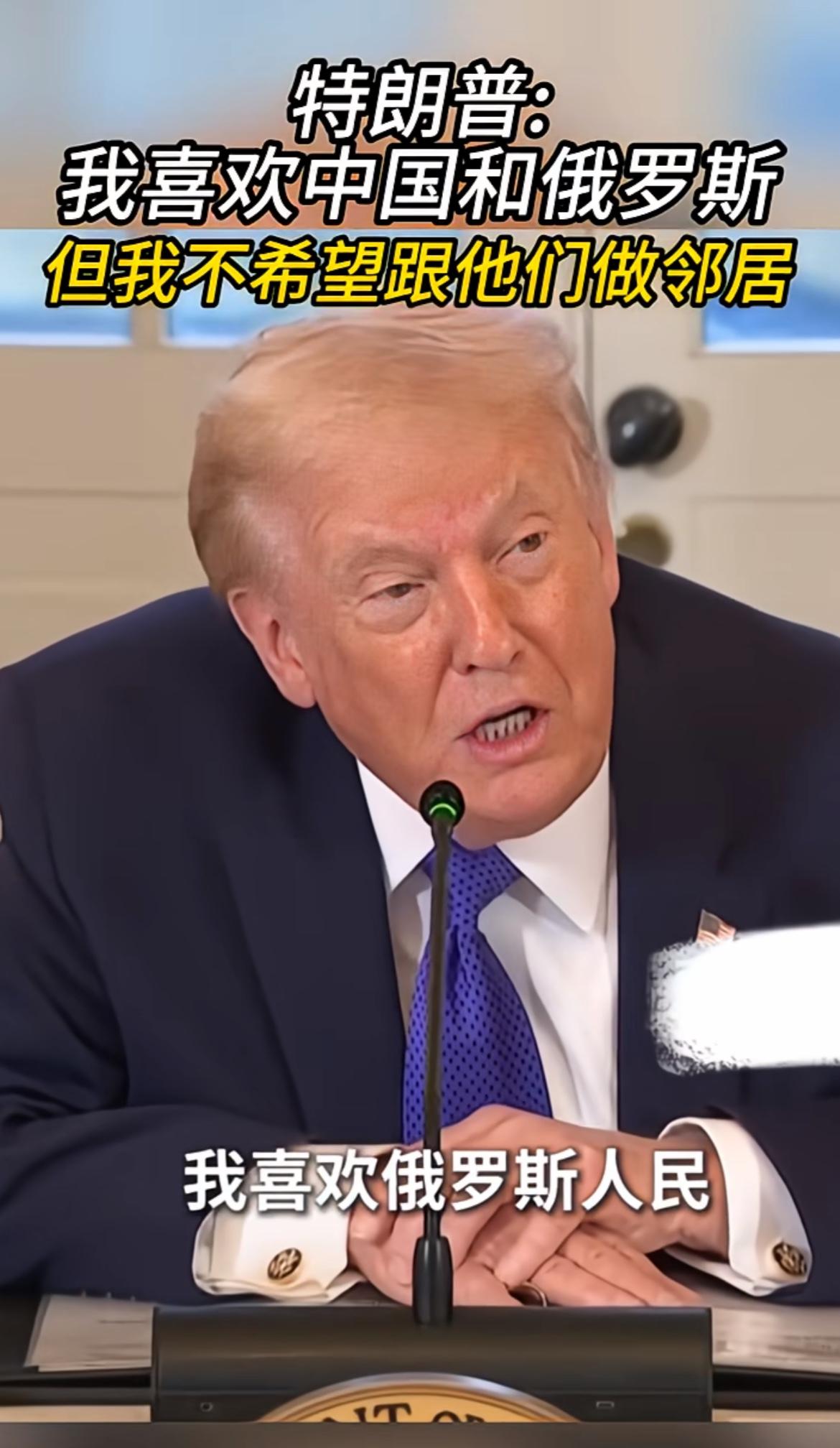 刷到一段特朗普的发言视频,他说“喜欢中国和俄罗斯,但不希望跟他们做邻居”,还特意提到喜欢俄罗斯人民。 这话听着挺有意思,结合地缘政治来看,其实不难理解背后的逻辑——大国之间的博弈里,“喜欢”或许是对两国实力和人民的认可,而“不愿为邻”大概率是从地缘竞争的角度出发。 不过政客的表态往往带着语境和立场,这话到底是随口的调侃,还是有更深的政治隐喻,就见仁见智了。不知道大家怎么看这段发言?