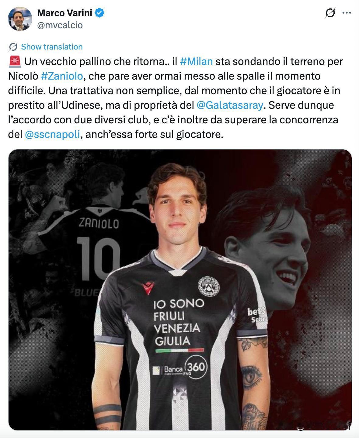 米兰再次关注意大利中场球员扎尼奥洛。之所以说再次主要原因是在两年前米兰与扎尼奥洛的谈判非常深入,当时已经完全达成一致,最后没能签约原因是红鸟集团叫停了转会,叫停原因是红鸟集团对于扎尼奥洛伤病存在担忧。0 扎尼奥洛现在好像在乌迪内斯,据说国米想用扎尼奥洛代替邓弗里斯,当然还有那个多多也是选择,但扎尼奥洛对我鸡不是很喜欢,貌似他就是我鸡走出去的,不知道是不是当时闹的很不愉快,总之扎尼奥洛对国际米兰不感兴趣。只是个人观点,扎尼奥洛对米兰也应该不感兴趣,毕竟当年红鸟集团拒绝了扎尼奥洛。 米兰想买扎尼奥洛个人觉得是一个正确的选择,萨勒马克尔斯出场太多了,无法稳定发挥,不管是因为缺乏竞争还是因为没有替补太累了,总之萨勒马克尔斯最近几场比赛表现不好,是需要一个球员来竞争了,没有竞争没有动力。