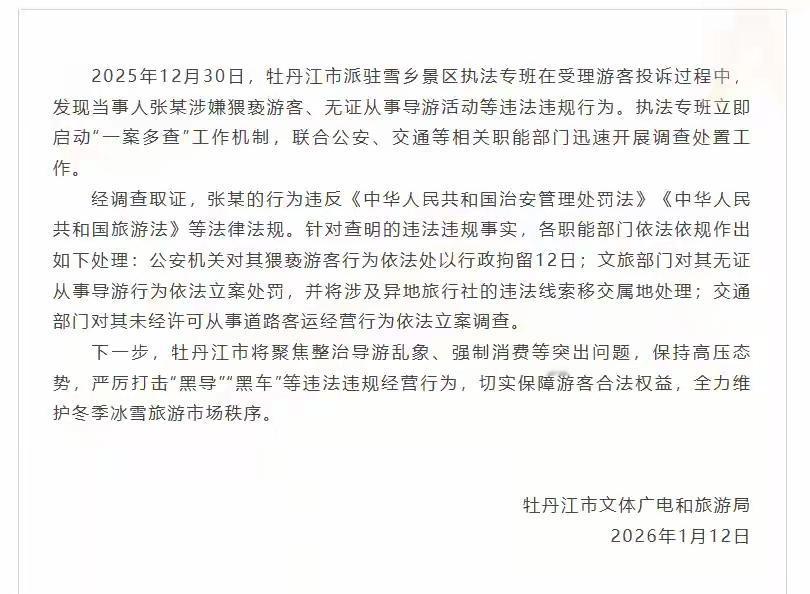 牡丹江官方通报“雪乡景区黑导猥亵游客”:行政拘留12日,对其无证从事导游行为依法立案处罚这一通报结果迅速引发了广大网友的热议。雪乡作为知名旅游胜地,一直以来都是游客们冬季赏雪游玩的热门选择,然而此次“黑导猥亵游客”事件无疑给雪乡的旅游形象蒙上了一层阴影。 网友们对于黑导受到应有的处罚表示欣慰,但也有不少人担忧,这样的事件是否只是冰山一角,景区在导游管理方面是否存在漏洞。毕竟,导游作为游客旅途中的重要陪伴者,其素质和行为直接影响着游客的旅游体验。 雪乡景区相关负责人表示,将以此为契机,全面加强导游队伍的管理和培训。一方面,对现有导游进行严格审查,确保持正规证件上岗;另一方面,组织职业道德和业务技能培训,提升导游的整体素养。 同时,景区也呼吁游客在旅游过程中,如遇到任何问题或不合理现象,要及时向景区管理部门反映,共同维护良好的旅游环境。相信通过各方的努力,雪乡能够早日驱散此次事件带来的阴霾,以更加安全、规范、优质的形象迎接八方游客。