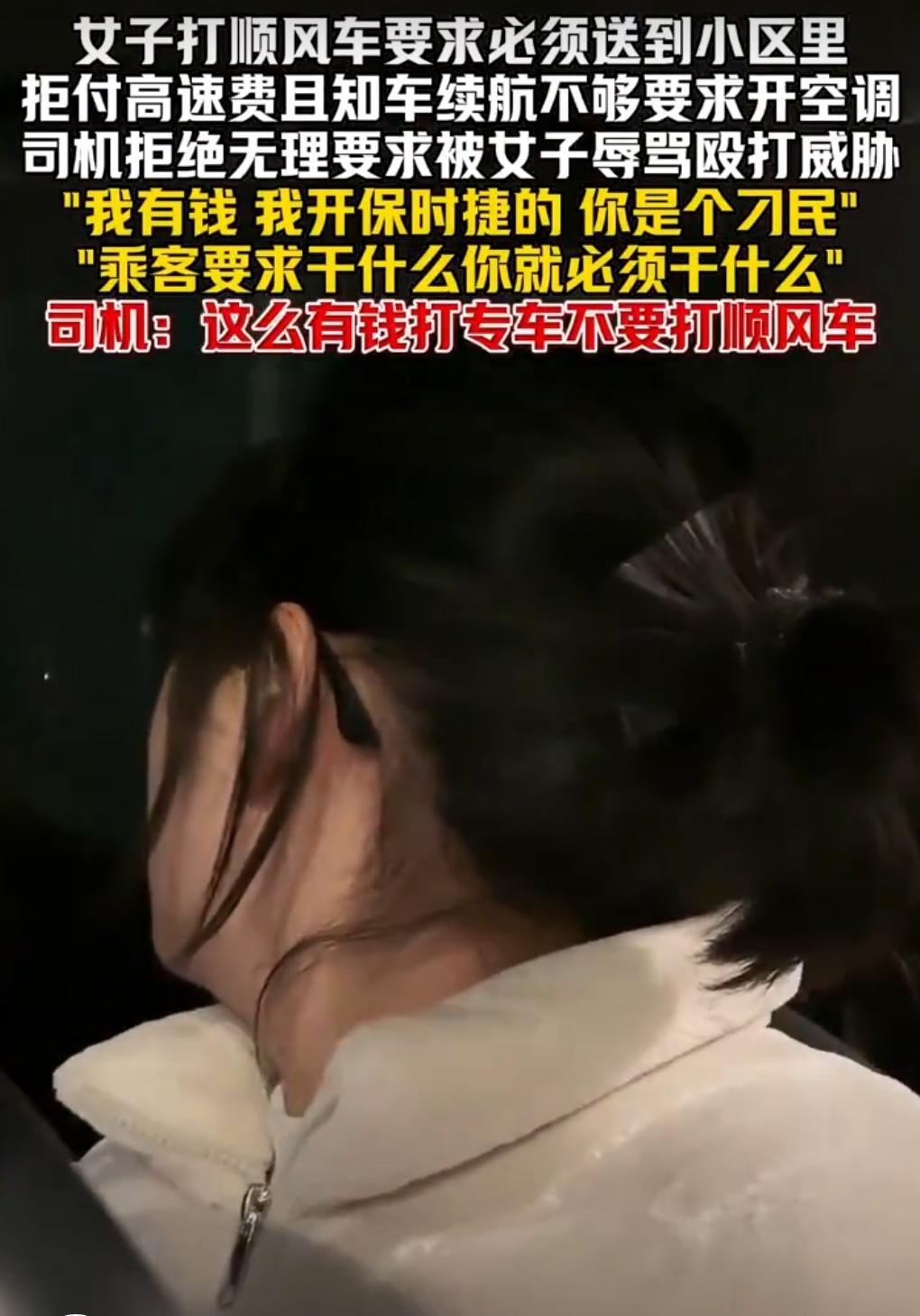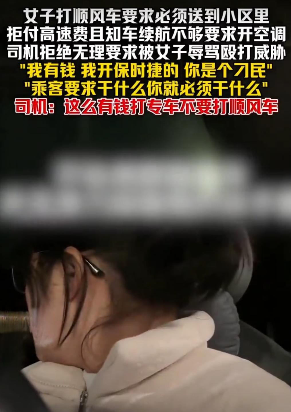 1月12日在江苏,发生了一件令人咋舌的事儿。一位女子打顺风车,可这一路上要求不断。她先是要求司机必须把车送到小区里面,接着拒绝支付高速费,在得知车续航不够的情况下,还坚持要开空调。司机肯定不能答应这些无理要求啊,毕竟顺风车本就是顺路搭载,大家相互方便,哪能这样无限制地提要求。 被拒后,这女子瞬间火冒三丈,开启了疯狂辱骂模式,说自己开保时捷很有钱,骂司机是“刁民” ,还口出狂言称乘客要求什么司机就得做什么。司机也不甘示弱,回怼她既然这么有钱,为啥不打专车。结果这话更是激怒了女子,她直接动手殴打司机,又是踢车内座椅,又是威胁司机。这一幕实在是让人难以理解,怎么能因为自己的不合理要求没被满足,就做出这种事呢? 在我看来,顺风车不是专车,它的定位是方便大家顺路搭乘,分摊一些出行成本,不是提供全方位、无底线服务的。乘客提要求可以,但得在合理范围内。这位女子明显混淆了顺风车和专车的概念,还仗着自己所谓的“有钱”,肆意践踏司机的尊严,动手打人更是错上加错。司机坚守自己的原则,拒绝不合理要求,这并没有错。 这件事也给我们提了个醒,不管在什么情况下,大家都应该相互尊重、互相理解。不管是乘客还是司机,都要站在对方的角度想一想,多一些包容,少一些苛责。不能因为自己有点小钱,或者处于某种消费地位,就不把别人当回事。 在生活里,类似的矛盾其实不少,很多时候就是因为一方不懂得换位思考,不尊重他人导致的。我们都得明白,尊重是相互的,只有大家都守规矩、懂礼貌,社会才能更加和谐,出行这样的小事才能顺顺利利。 大家认为这位女子辱骂司机,还动手打人这种做法对吗❓欢近来评论区讨论。?