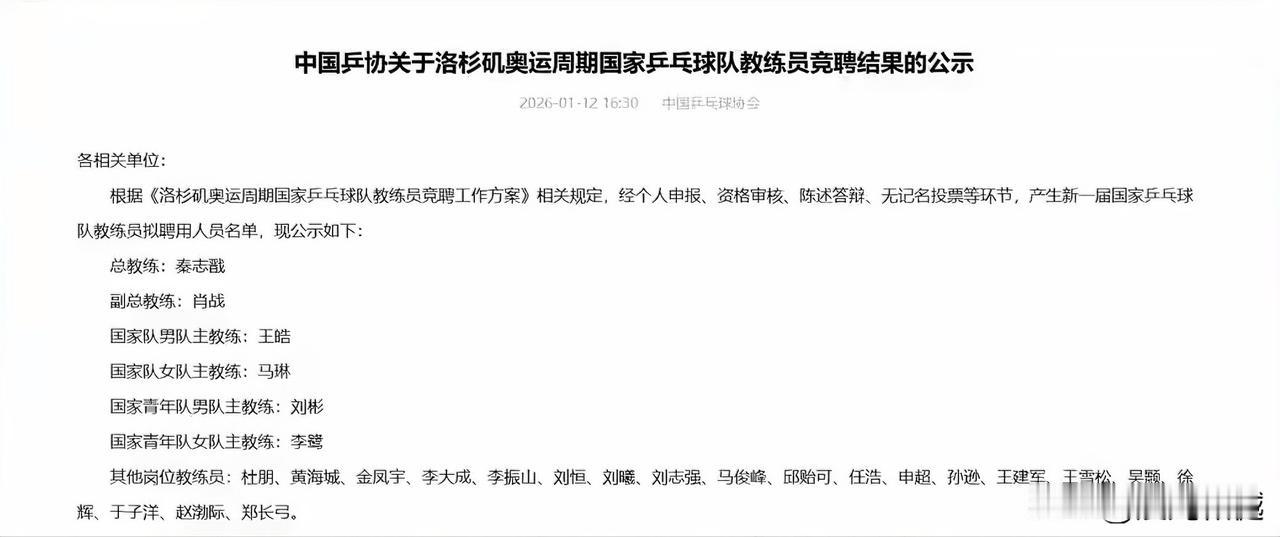 国乒在洛杉矶奥运会周期的教练公布了,尽管各位教练主管的队员还没有公布,但是最令乒迷们关注的还是两位主教练是否还指导队员? 男队主教练王皓曾主管樊振东,夺得了奥运会男单冠军; 女队主教练马琳曾主管陈梦,夺得了两届奥运女单冠军。 目前孙逊主管王楚钦、邱贻可主管孙颖莎、任浩主管王曼昱,王皓和马琳这两位主教练还主管队员吗? 洛奥有了三项双打,副总教练肖战仍然主抓混双,估计王皓和马琳会主抓男双和女双,其中主要候选为王楚钦和林诗栋、王曼昱和蒯曼。