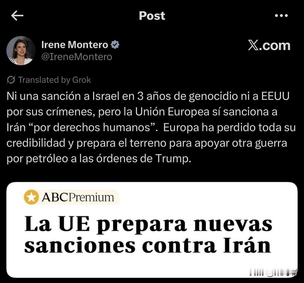 最新消息:西班牙欧洲议会议员伊雷妮·蒙特罗(Irene Montero)的推文评论了欧盟对伊朗的潜在新制裁,并批评了欧盟在国际事务上的双重标准。 以色列遭受种族灭绝三年,欧盟没有对以色列实施任何制裁;美国犯下罪行,欧盟也没有对美国实施任何制裁;但欧盟却“因人权问题”对伊朗实施制裁。 欧洲已经丧失了所有信誉,并且正在为支持特朗普下令发动的另一场石油战争铺平道路。 主要观点 对伊朗的制裁:欧盟正在考虑对伊朗实施新的制裁,原因包括镇压国内抗议活动以及向俄罗斯提供无人机等。这条推文引用了西班牙媒体《ABC》关于“欧盟准备对伊朗实施新制裁”的报道。 双重标准批评:蒙特罗指出,欧盟在三年多的“种族灭绝”期间没有对以色列或美国实施任何制裁,反而以“人权”为由制裁伊朗。她认为这暴露了欧洲的信誉丧失。 政治动机:她进一步推测,欧洲正在为配合特朗普的指示,支持另一场石油战争做准备。 欧盟外交与安全政策高级代表卡拉斯(Kaja Kallas)表示,欧盟准备推动对伊朗实施新的制裁措施。伊朗外交部长也对此表示遗憾,称伊朗的行动是出于自卫。