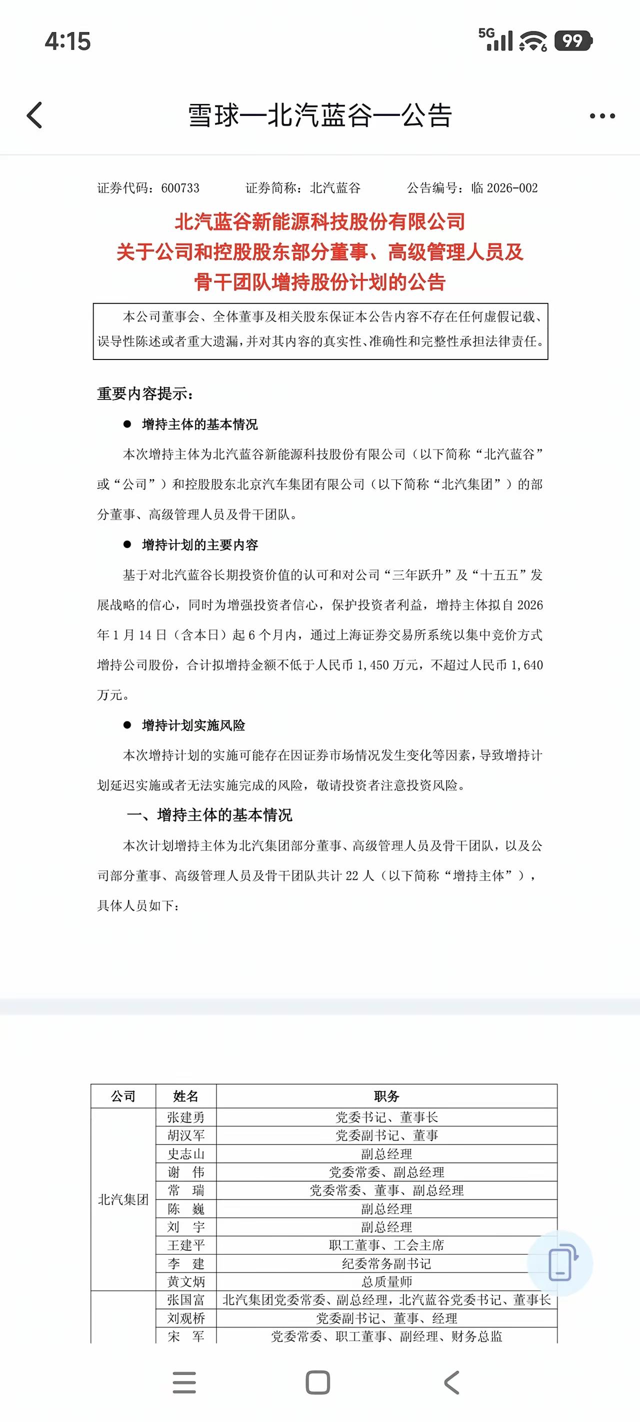 北汽蓝谷,官方出了一个消息,这个消息是不是预示着,定增价格快落地了。不然这些人,他会无缘无故增持。 从2026年1月14号,高管开始增持,公司股份。 公司控股董事、高级管理人员、骨干团队,增持金额最低1450万元,最高不超过1640万元,对于你没看错是最高1600万,我还以为我看错了,我以为增持1.6亿呢!谁知道擦擦眼睛,找不到那一个点,原来我没看错,就是最高1640万。 这这控股股东增持,说的是看好公司长期投资,也是对“三年跃升”,计划有信心,保不保护投资者,我不知道,但是这么大的股东,就增持1640万元,对他们来说,不就是毛毛雨吗? 北汽蓝谷,在8元附近,整整两年了,一直在线中轴附近,眼看着像是要突破9元了。突然给你来个大跌,又回到了8元。你说可笑不可笑。