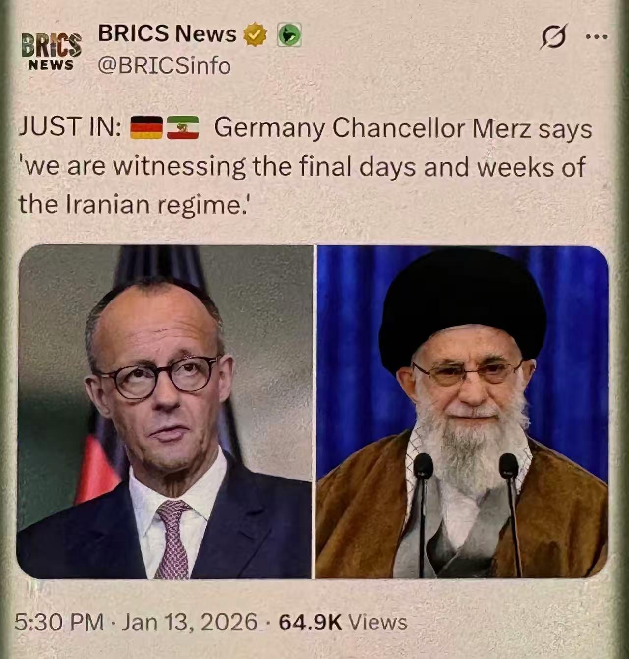 德国总理直接给伊朗政权判了“死刑”! 刚刚,德国总理默茨公开放话:“我们正见证伊朗政权的最后时日与最后几周!”这是西方对伊朗最直白的一次“倒计时”警告。 默茨还说,要是一个政权只能靠暴力维持统治,那其实早就完了,而且这个政权本来就没有民选的合法性,现在老百姓都起来反对了,希望能和平解决这场冲突。 不光是德国,法国总统马克龙也站出来谴责伊朗当局对抗议者使用暴力,英国外交大臣也说这种镇压行为太可怕,还直接跟伊朗外长交涉,让他们赶紧停止暴力,保障民众的基本权利,看得出来,西方这几个主要国家现在是步调一致,都把矛头对准了伊朗现政权。 起因是伊朗国内的经济出了问题,货币越来越不值钱,物价一个劲地涨,老百姓的日子不好过。从去年12月底开始,不少地方就有人出来抗议。 一开始是商人先发起的,后来学生、退休人员还有不少底层民众都跟着响应了,参与的人越来越多,范围也越来越广,不光是德黑兰那些大城市,连一些有宗教和政治意义的城市都卷了进来,差不多全国各地都有抗议活动。 更让人揪心的是,有些地方的抗议慢慢变了味,出现了骚乱,有人冲击政府大楼、监狱这些地方,还发生了打砸烧的情况,造成了不少人员伤亡,据说已经有上百名安全部门的人员在维持秩序的时候牺牲了。 伊朗政府这边也没闲着,他们说这场骚乱根本不是单纯的民众抗议,背后是有外国势力在挑唆,美国和以色列就是主谋。伊朗总统佩泽希齐扬早就站出来指责,说美国和以色列教唆那些暴徒制造动荡,还拿出了不少证据,比如伊朗外长就说,有证据显示美以给袭击警察局的恐怖分子付了钱。 为了应对这事,伊朗政府不仅加强了各地的警戒和巡逻,还宣布全国进行三天的哀悼活动,悼念在骚乱中丧生的安全人员和普通民众。而且伊朗的武装力量也表态了,说已经做好了充分准备,要是有谁敢侵略,肯定会坚决击退。 其实伊朗和西方还有美国的矛盾,不是一天两天了,算下来都快四十年了,早年间美国曾经扶植过伊朗的巴列维国王,后来伊朗发生革命,推翻了巴列维政权,之后就和美国断交了,关系一直特别紧张。 这些年美国一直对伊朗实施制裁,后来还退出了之前签订的伊核协议,欧洲一些国家也跟着追加了制裁。 伊朗为了自保,一直在发展核技术,这又让美国和以色列特别不满,以色列还曾经打击过伊朗的核设施,双方的仇怨是越积越深。这次西方各国借着伊朗国内骚乱的机会发声,其实也是双方长期矛盾的一次爆发。 不过要说伊朗政权真的像默茨说的那样,这几周就要倒台,好像也没那么简单。首先伊朗的军队和主要政治机构还是忠于政府的,虽然政府内部在处理抗议的方式上有分歧,但都反对政权更迭。 而且伊朗的宗教团体立场也很坚定,最高精神领袖哈梅内伊态度明确,要求全力恢复秩序,大多数宗教人士也都支持政府。 再看看那些抗议的人,虽然人数多、范围广,但缺少一个统一的领导核心,大家的诉求也不一样,有的是为了经济问题,有的是被外部势力煽动,很难形成合力。 还有个关键因素,美国和以色列虽然一直对伊朗虎视眈眈,甚至有消息说美国总统特朗普正在考虑对伊朗发动军事打击,但目前他们的军事部署还没到位,短期内大规模出兵的可能性不大。 现在西方各国一边谴责伊朗政府,一边和美国紧密协调,而伊朗则一边应对国内的问题,一边防备外部势力的干涉,双方就这么僵持着。 说到底,一个国家的稳定还是得靠自己人,外部势力再怎么插手,最终解决问题的还是得靠国内的民众和政府。 希望伊朗能尽快平息动荡,让老百姓重新过上安稳日子,也希望各方都能保持克制,别让局势再升级,毕竟打仗受苦的永远是普通老百姓。 权威信源:德国的默茨表示伊朗政权将在“最后几天和几周”倒台—德国新闻社