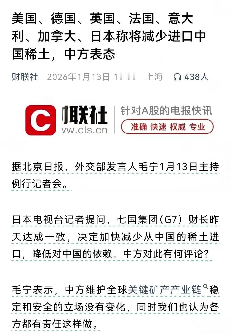 G7成员国,美、日、英、法、德、意、加称,要减少并降低对中国稀土的依赖。 中方霸气回复“我们也认为各方都有责任这样做”[捂脸]! 既然你们都这样说了,那你们有能力就自己提炼去,中国稀土资源这么宝贵,采矿和提炼都对环境有影响,中国巴不得让你们自己搞。要是自己搞不出来,那可别又跑回来找中国买! 别以为稀土依赖是说断就能断的,中国握着的可不只是矿,更是全球90%以上的精炼能力和近八成分离专利。西方想自己搞?先掂量掂量2000多项技术壁垒,还有比中国高30%-50%的环保成本,没个几千亿和十年八年根本玩不转。 说白了,这不是“去中国化”,更像一场自导自演的政治秀。中国稀土的优势从不是单纯的资源多,而是几十年攒下的技术、产业链和环保硬实力。与其纠结别人要不要依赖,不如守住技术高地,把宝贵资源用在刀刃上。 毕竟资源和环境都是不可逆的,西方真能扛住成本和技术双重压力吗?