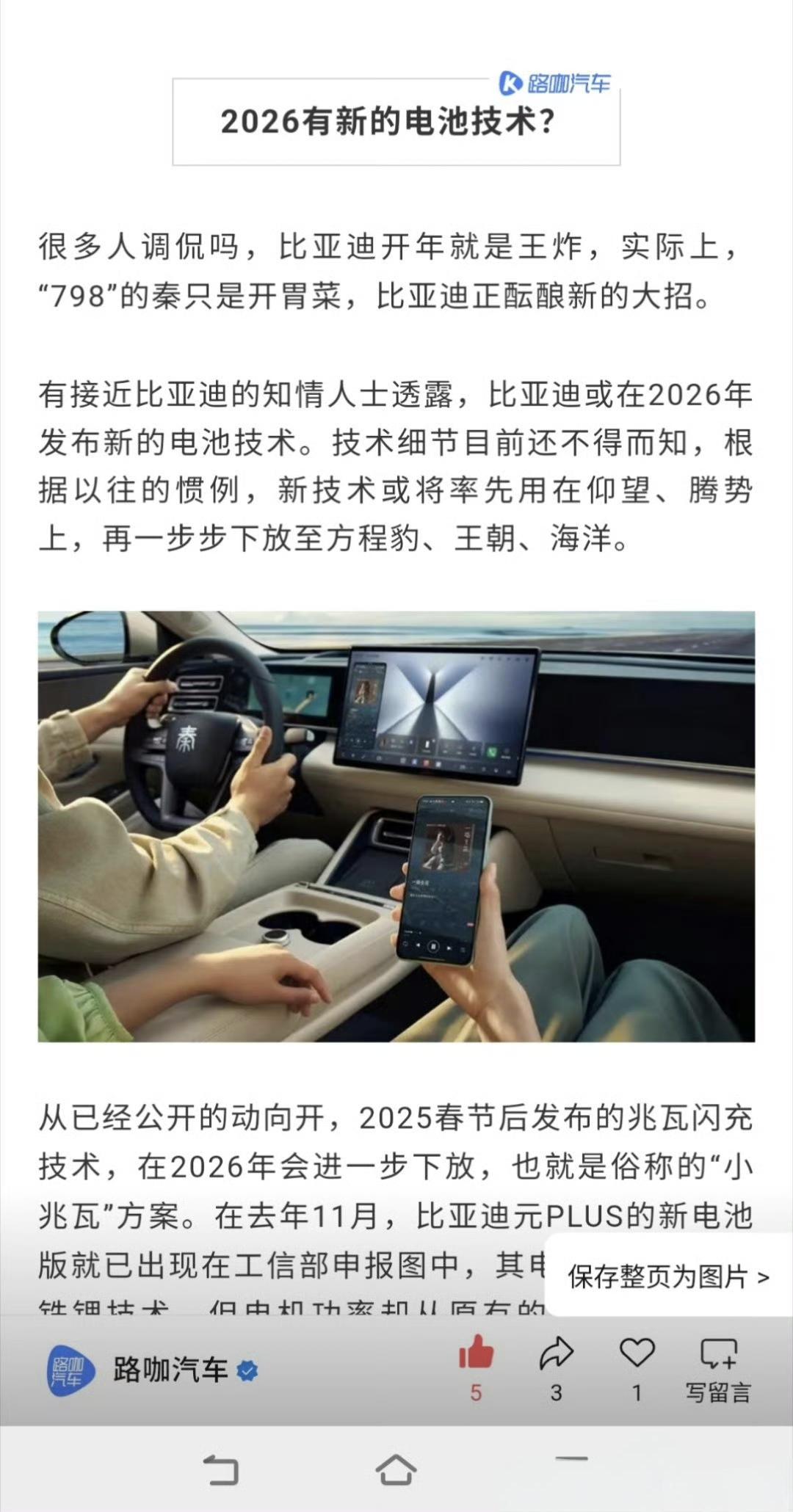 混动王炸一车传三代隔年油还在 比亚迪2026年会放大招。 第一个大招就是给秦,海洋双豹等车型升级了大电池,纯电续航最常有210 km,一周充一次电或者两次都可以接受。 不过最大的期待还是2026年,比亚迪其他的大招。 图2:显示比亚迪2026年还会有更多大招推送到新车型上。 我的大概猜测就是【更快的充电技术】下放到王朝系列,以及天神之眼B的下放,或者是云辇底盘技术的下放。 期待2026比亚迪的大招。【来自懂车帝车友圈】