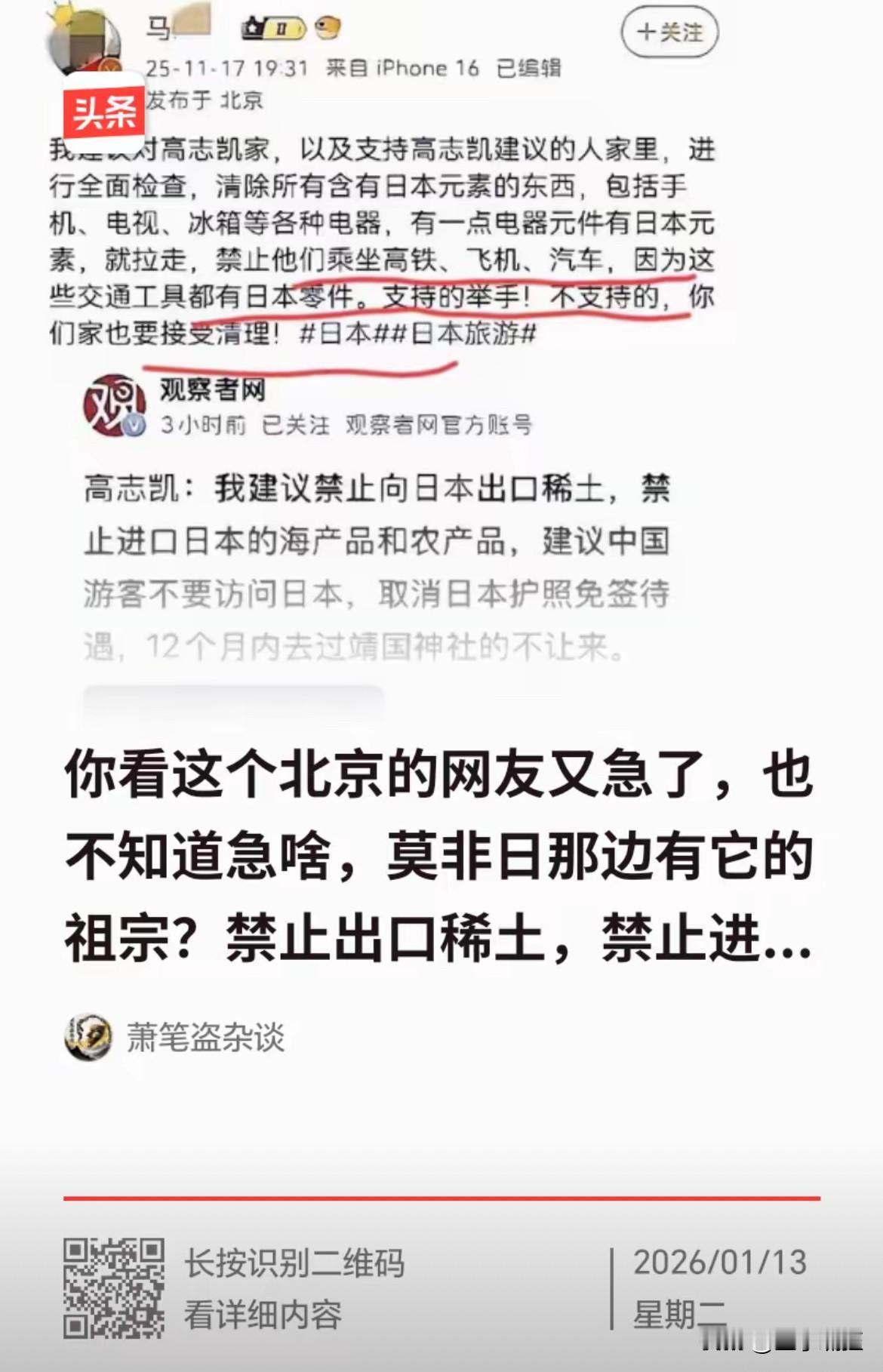 北京的一位网友对高志凯先生提出的制裁日本的建议如此跳脚,甚至是有些抓狂,说明了什么问题?令人细思极恐! ​只是简单的媚日吗?不是!这种嘶叫充斥着愤怒和仇视。 —— 表面是“网友情绪”,其实是在同一件事上出现了两种完全相反的判断。 有人觉得,这是对外博弈中的应有反制; 也有人却表现得比日本还紧张,像是怕“哪一步走偏”。 两种情绪互相撞在一起,火花自然就大。 先说为什么这件事关键。 日本这两年在涉台、涉海的问题上动作不断。光是2024年下半年,日本在台海周边的军事预算就上涨了超过13%,这不是小数。中国如果在稀土、化工原料、关键零部件上采取限制,影响的不只是“情绪”,而是供应链节点。 这些节点一动,日本的产业链、中下游企业都会跟着震。 再说为什么会出现这种强烈分歧。 一部分人(A派)看的是“现实”,认为制裁会带来价格波动、订单压力,甚至让部分企业不得不重新布局海外。 另一部分人(B派)看的是“安全”,他们认为如果日本持续踩中国底线,尤其像去年年底在涉台言论上“明显越界”,那反制是必要选项,不反而是失误。 这种“现实 vs 底线”的矛盾,本质上不是情绪之争,而是对未来方向的判断差异。 而这类分歧一旦被情绪放大,在网络空间里就特别容易出现极端化表达。 更关键的是反作用链条。 一旦对外管控的力度被误解为“不能动”“不能碰”,那中国手里的产业链筹码,就有可能在舆论里被“弱化”。 如果让对手误以为我们“投鼠忌器”,那才是真正的风险点。 我更倾向于:该反制时就反制,但要做到精准、可控、有节奏。 更让我担心的是: ——不是“意见不同”,而是出现了一些情绪化、带仇恨色彩的极端表达,这反倒可能影响外界对中国立场的理解。 那么,争议来了,两派观点分别是什么? A派会说: 企业有现实压力,制裁导致成本上升,产业链可能被迫外移。 现在的全球市场不稳定,慎重比冲动重要。 B派会说: 日本过去一年在涉台、涉海问题上的动作太多,尤其不断呼应美国的所谓“印太战略”。 如果没反制,就是给对方“试探空间”。 两派都有各自的逻辑,但问题是: 在网络上表达的方式,往往不是“沟通”,而是“站队”。 于是就出现了开头那种“极端化反应”,在某些内容下甚至比日本还“积极”。 Q1:你怎么看日本在2024—2025年涉台言论持续升温这件事? Q2:在对外博弈上,你更支持“稳”一点,还是“硬”一点? Q3:如果要制裁日本,你认为哪一类行业最合适?(稀土?化工?芯片设备?) 评论区欢迎理性讨论,我会挑一些有见解的观点补充到后续内容里。