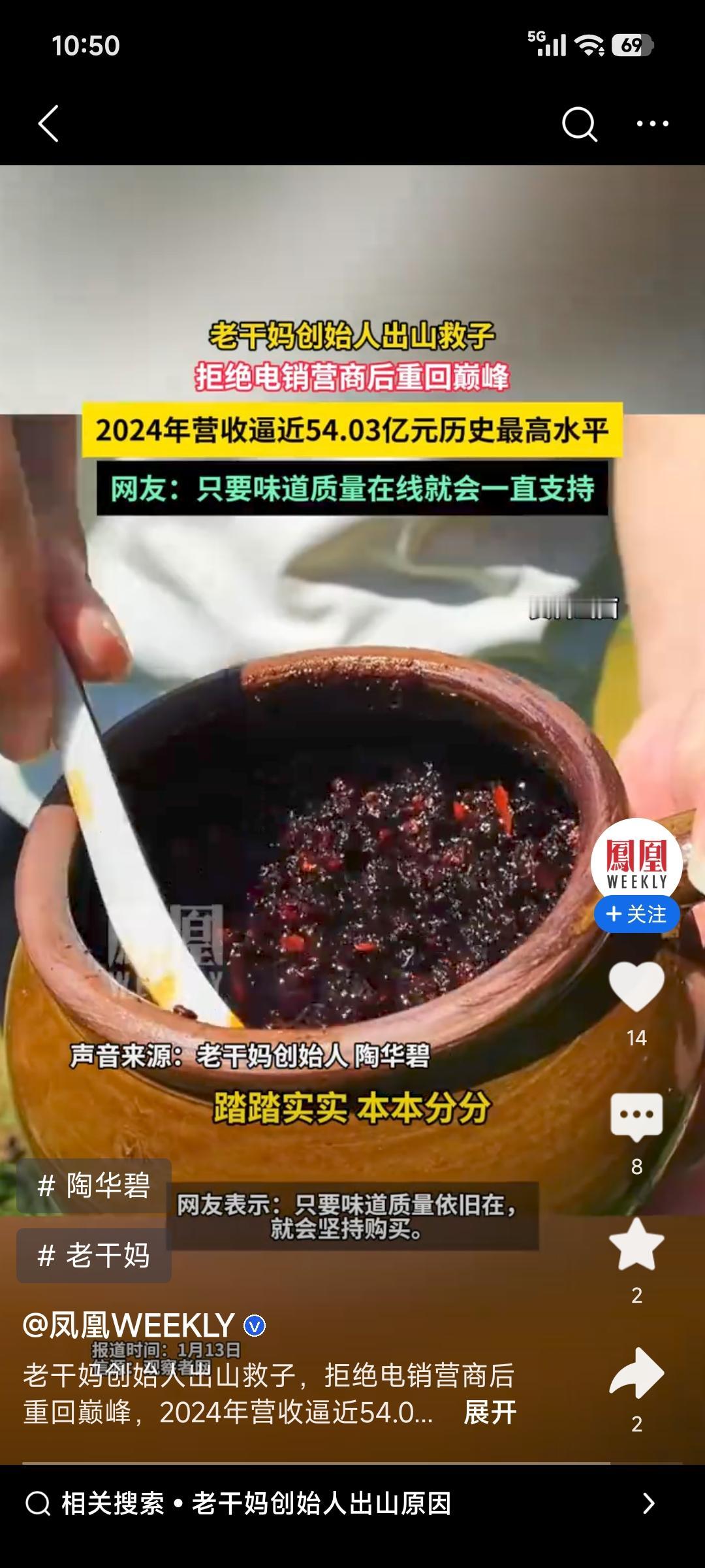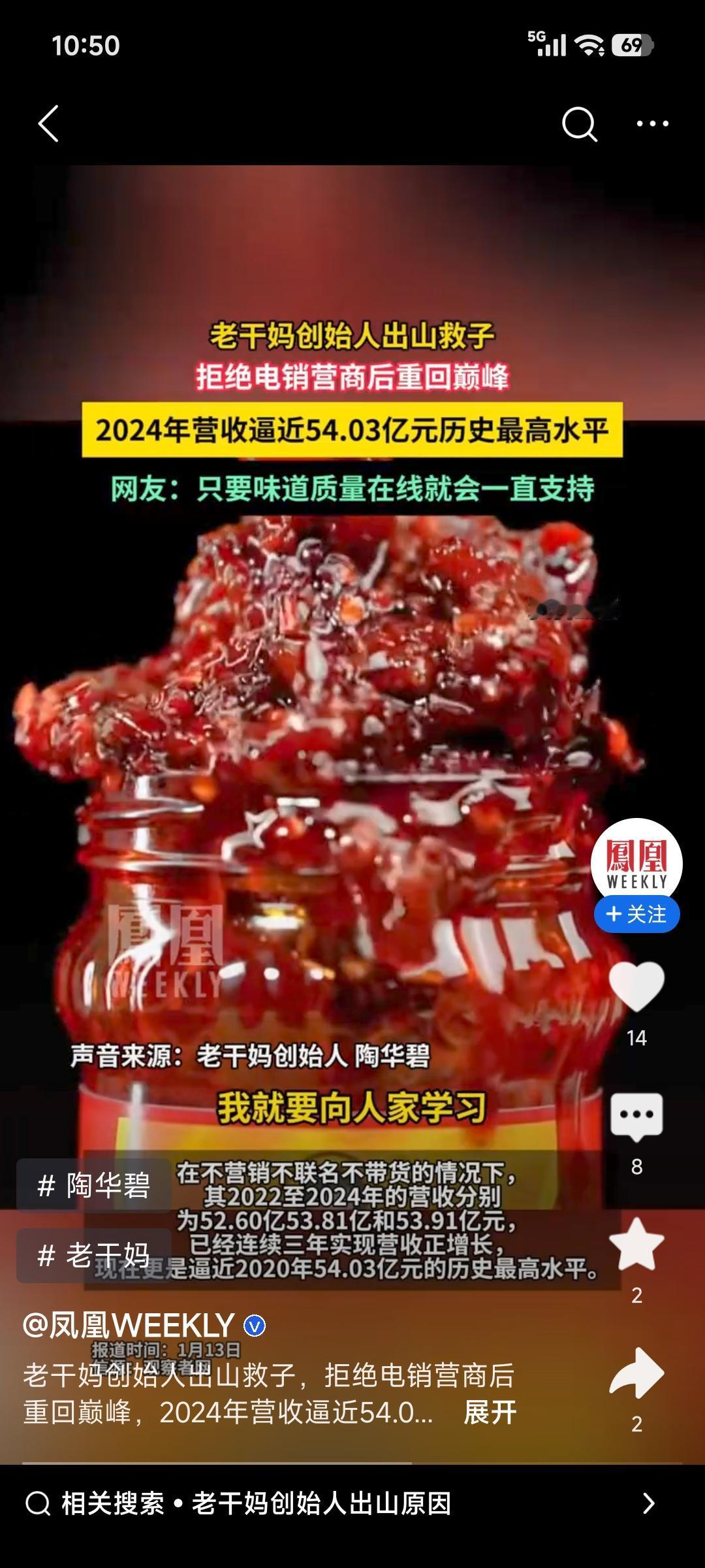 80岁的老干妈创始人陶华碧还在生产一线,太令人敬佩了!2014年她退居二线把企业交给儿子,结果儿子将部分贵州辣椒换成河南辣椒,让老干妈陷入困境。2019年72岁的她回归,暂停用河南辣椒,恢复用贵州优质辣椒,即便成本上升也不在乎。 有次产品风味有微小偏差,约500吨、价值百万的产品被她下令销毁。她觉得产品是作品,做食品要讲诚信。《2025贵州企业100强》榜单显示,2024年老干妈营收逼近54亿,几乎追平历史峰值。她坚守品质,让老干妈完成逆袭,不愧是老干妈的“定海神针”!