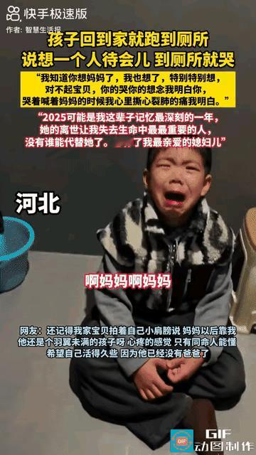 网友泪目了:河北,孩子放学回家放下书包就跑到厕所里说想一个人待一会儿。进了厕所就坐在地板上放声大哭,一边哭一边喊:“妈妈啊妈妈!”可不管他哭的多委屈,再也得不到妈妈的安慰了,因为他的妈妈去世了! 近日河北一段孩子思念去世妈妈的画面,悄悄戳中了无数网友的泪点,那个躲在厕所里崩溃大哭的小小身影,让屏幕前的人忍不住红了眼眶。 傍晚时分,放学铃声响起,小男孩背着沉甸甸的书包按时回家,和往常一样推开家门,只是进门后没有像往日那般叽叽喳喳分享学校趣事,也没有第一时间奔向厨房找妈妈要零食。 只是默默把书包放在玄关,轻声说了句想一个人待一会儿,便快步走向卫生间,轻轻关上了门。 家人起初没太在意,只当孩子是上学累了想安静歇会儿,毕竟小孩子也有自己的小情绪,可没过多久,卫生间里就传来了压抑的哭声,那哭声越来越大, 渐渐变成了撕心裂肺的放声大哭,夹杂着一声声带着委屈和无助的妈妈的呼唤,每一声都揪人心弦。 卫生间的地板冰凉,小男孩就那样毫无顾忌地坐在地上,小小的身子蜷缩着,双手或许紧紧攥着衣角,或许捂着泛红的眼睛,哭声里满是旁人无法体会的难过。 他一遍又一遍喊着妈妈,像是在寻求最温暖的安慰,又像是在诉说满心的思念,可回应他的只有空荡荡的卫生间和自己的回音, 再也不会有那个温柔的身影快步走来,蹲下来把他搂进怀里,轻轻拍着他的后背柔声安抚,再也不会有那双温暖的手为他擦掉眼泪,告诉他别怕有妈妈在。 他心里清楚,妈妈已经永远离开了,再也不会回来了,可小小的他还是控制不住这份浓烈的思念,平日里在家人面前,他或许会努力表现得懂事又坚强,不想让身边的人再为自己担心,可那份失去妈妈的痛苦,从来没有真正消失,只是被他悄悄藏在了心底。 直到放学回家,这个充满烟火气的家处处都有妈妈的痕迹,或许是餐桌上没来得及收拾的碗筷,或许是阳台上晾晒的衣物,又或许是客厅里摆放的照片, 那些熟悉的画面瞬间勾起了他的回忆,思念再也无法抑制,只能找个隐蔽的角落,把所有的委屈和难过全部哭出来。 孩子的思念总是直白又纯粹,不懂得掩饰,也不会刻意压抑,他不知道该如何消化失去妈妈的痛苦,只能用最本能的哭泣来释放情绪。 卫生间狭小的空间,成了他暂时安放悲伤的地方,在这里,他不用假装坚强,不用顾虑旁人的感受,只需要做一个想念妈妈的孩子,肆无忌惮地表达自己的心意。 家人站在卫生间门外,听着里面一声声揪心的呼唤和痛哭,心里满是心疼却不知该如何安慰,只能默默守在门外,给孩子留足宣泄情绪的空间。 他们知道,孩子心里的伤口需要时间慢慢愈合,这份对妈妈的思念,也会一直藏在心底,成为成长路上最柔软的牵挂。 这段画面被分享到网上后,迅速引发全网共鸣,网友们纷纷留言泪目,有人说看着孩子哭自己也忍不住掉眼泪,小小的年纪就要承受这般离别之苦,实在太让人心疼, 有人感慨孩童的思念最是戳心,那些藏在心底的牵挂,总会在某个瞬间喷涌而出,还有人想起了自己逝去的亲人,想起那些再也无法回应的呼唤,心里满是酸涩。 其实孩子远比我们想象中更懂得爱与失去,他们或许记不清生死的抽象概念,却能牢牢记住妈妈温暖的怀抱、温柔的话语,记住那些被细心呵护的时光。 那些藏在日常里的陪伴,早已刻进骨子里,即便天人永隔,那份爱意和思念也永远不会消散。 那个坐在卫生间地板上痛哭的小男孩,用最纯粹的方式诉说着对妈妈的想念,也让我们明白,亲情是刻在生命里的牵挂,那些离开的人,会永远活在我们的思念中。 对此,你们有什么看法,欢迎评论留言~